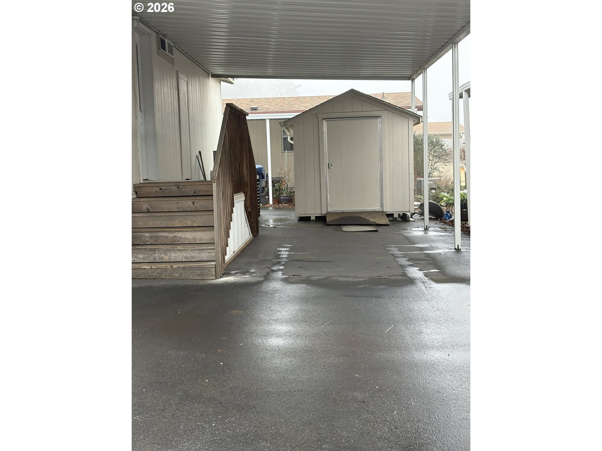 Nicely updated with interior and exterior paint. Roof new in 12/2025, as well as gutters. Updated heat pump and water heater. Carpet & pads, toilets and shower door new in 2025. Microwave new in 25. Open floor plan with vaulted ceilings. There is off street parking for 2 cars. One parking area is under a carport. 8x12 storage area with shelving. RV storage is subject to availability. Cost unavailable.