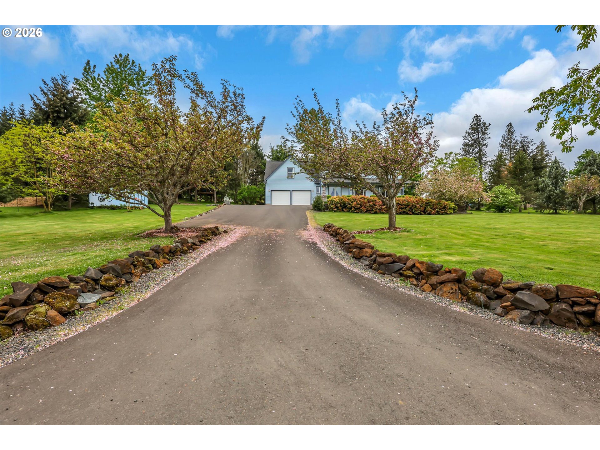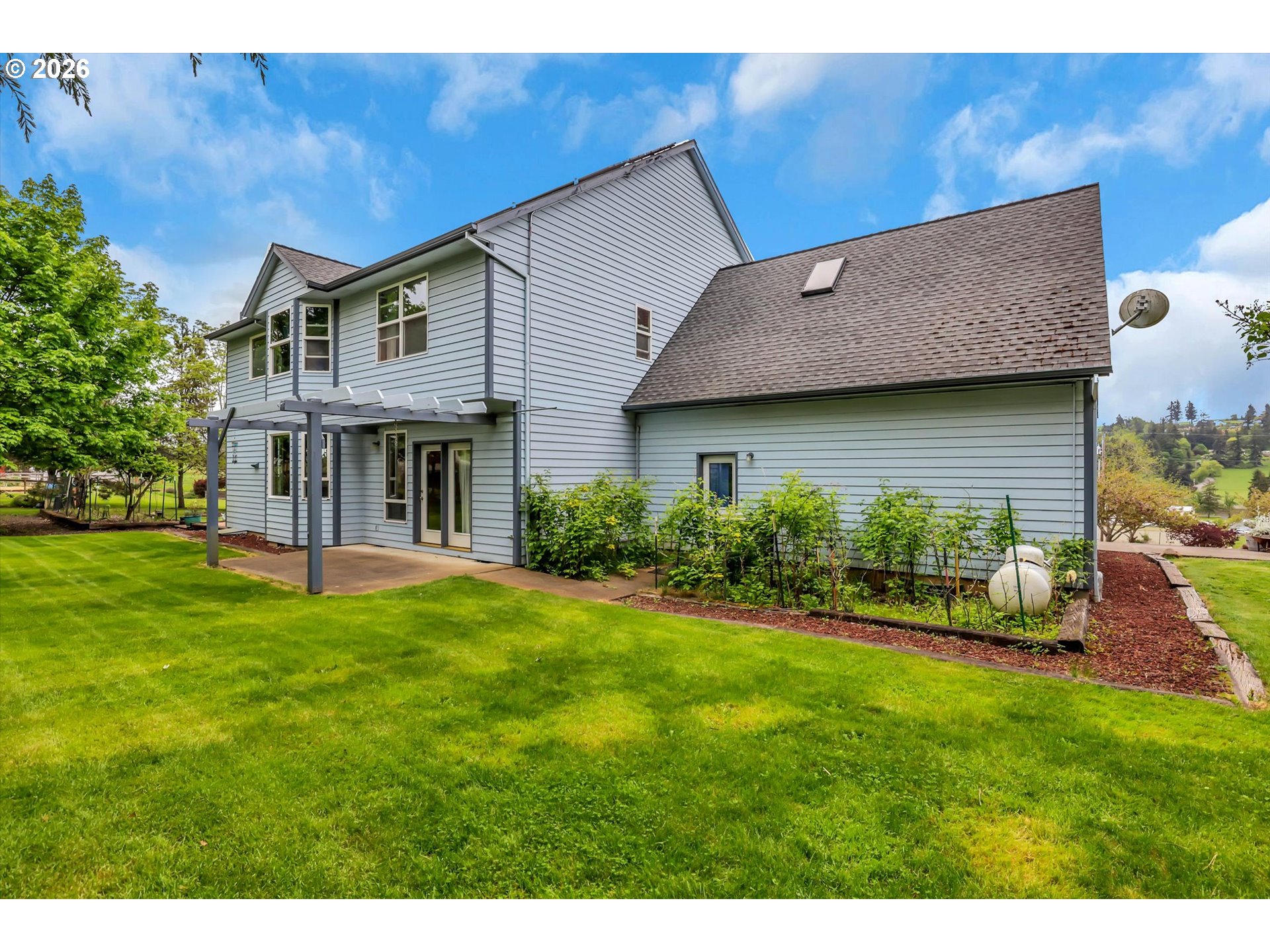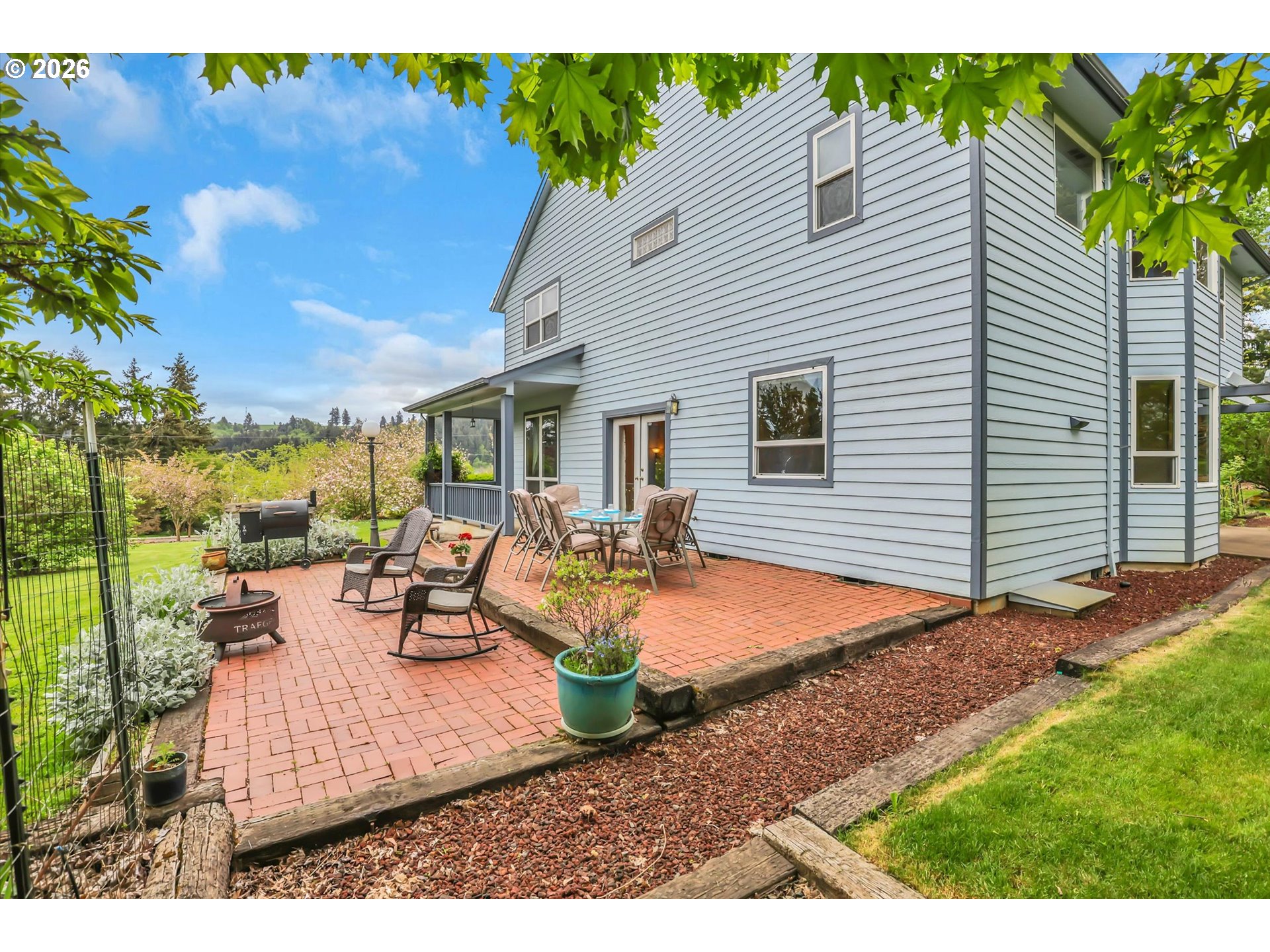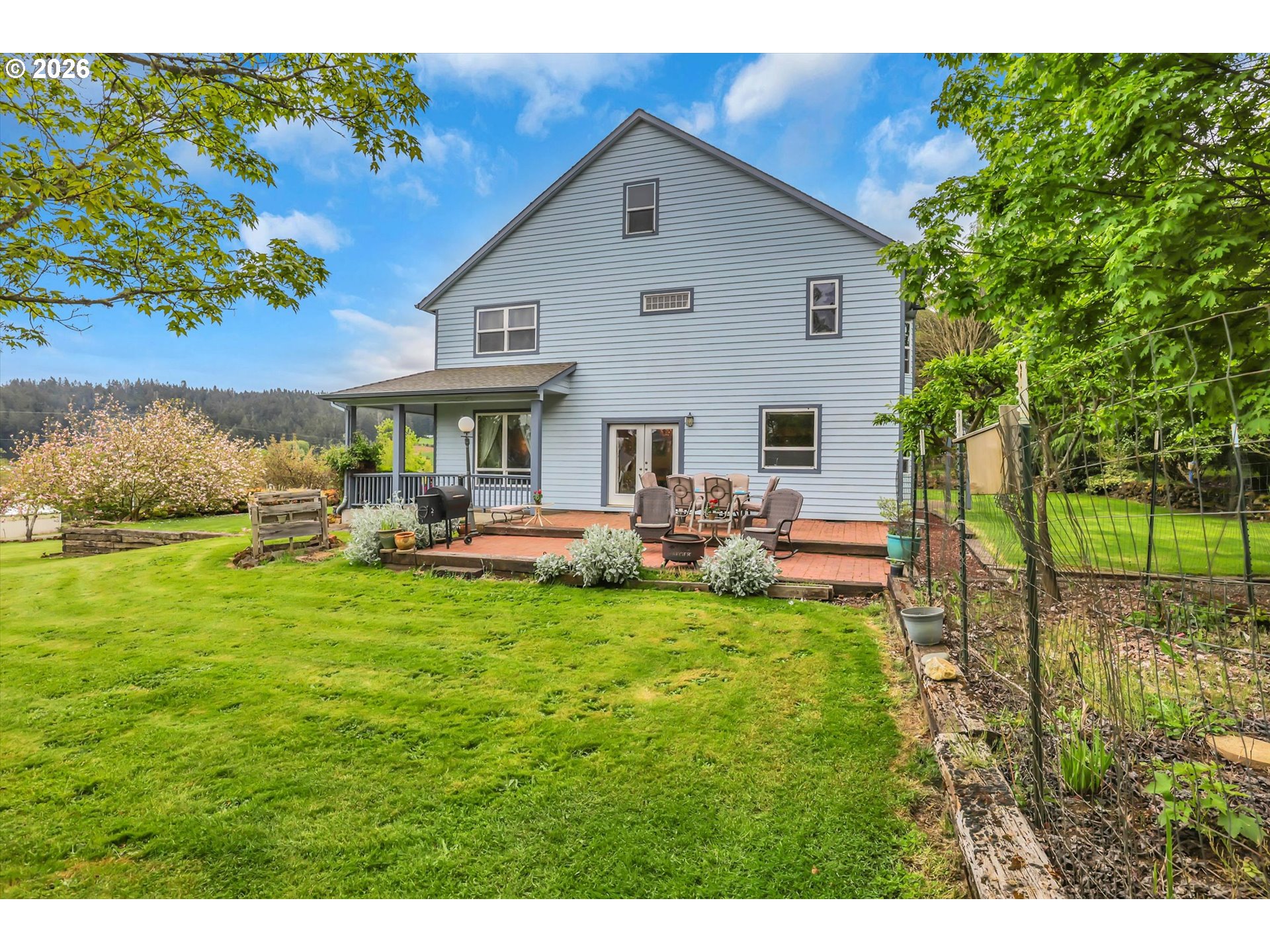 Tucked into a rural setting with sweeping, picturesque views, this exceptional property offers the perfect balance of privacy and convenience—just minutes from downtown amenities. A tree-lined paved driveway welcomes you home, setting the tone for the beauty and tranquility that await. Designed for both everyday living and elegant entertaining, the home features soaring high ceilings and a grand foyer that creates a stunning first impression. Inside, you’ll find a thoughtfully designed layout including a dedicated office, formal dining room, spacious living room, and a comfortable family room. A versatile bonus room provides endless possibilities for hobbies, media, or guest space. French doors open to a large brick patio, seamlessly blending indoor and outdoor living, while a wraparound porch invites you to relax and take in the peaceful surroundings. An observation deck offers a perfect vantage point to soak in the breathtaking views. Outdoors, enjoy a fully fenced pet area and a variety of established plantings, including blueberries, raspberries, thornless blackberries, and a charming grape arbor—ideal for those who appreciate homegrown delights. Additional features include solar panels for energy efficiency and a new well for peace of mind. This one-of-a-kind property delivers comfort, functionality, and natural beauty in a truly idyllic setting.