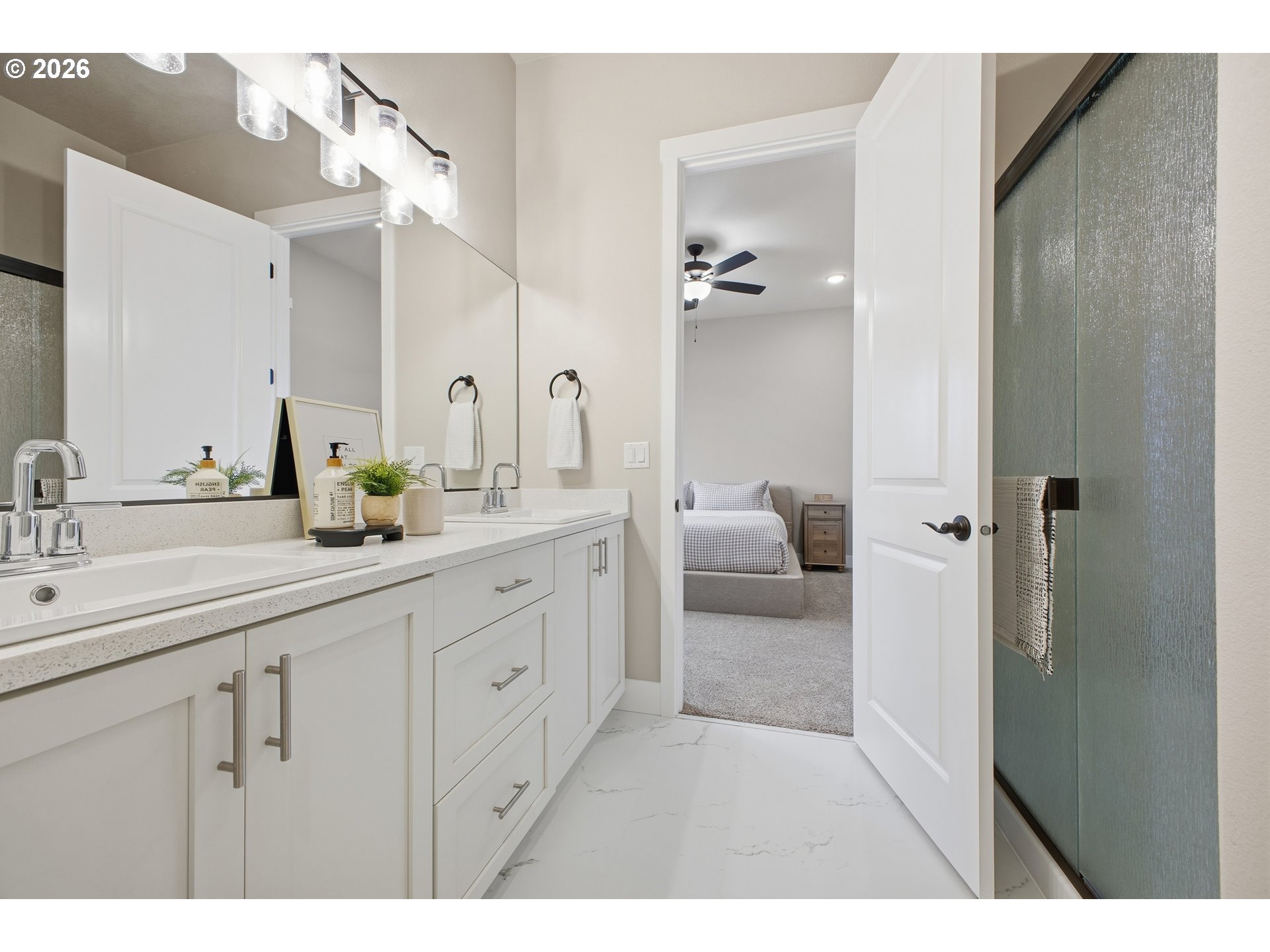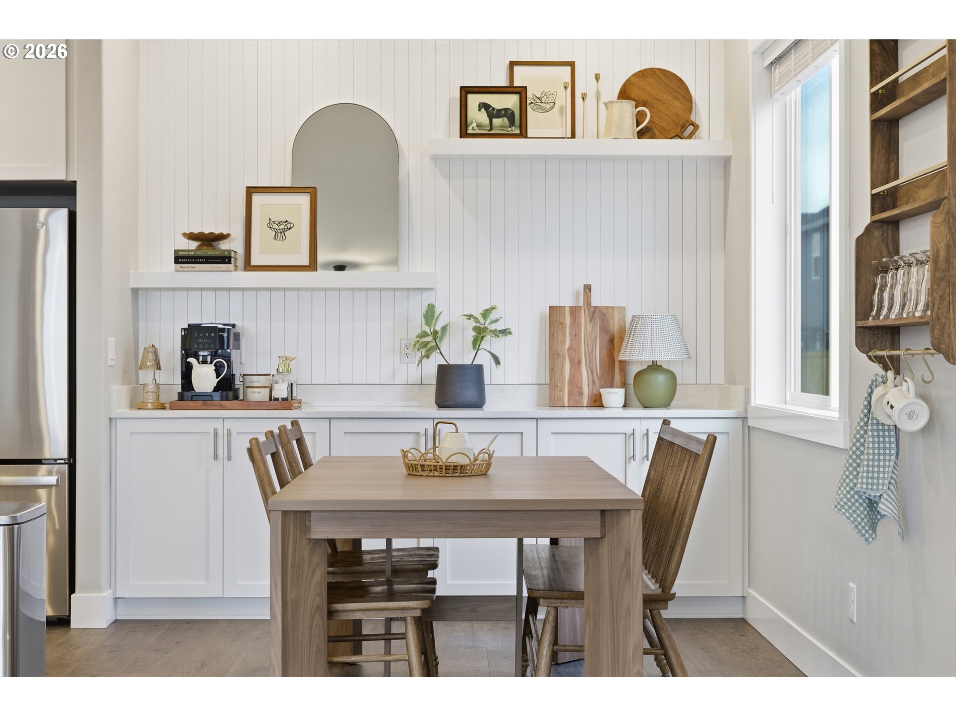 Welcome Home! Soaring 10’ ceilings and 8’ doors create an open, airy feel throughout. Great room features a fireplace and flows into a designer kitchen with painted shaker cabinets, soft-close hardware, slab quartz counters, full-height backsplash, walk-in pantry, and gas range. Dining area includes custom built-ins with floating shelves and wainscoting detail. Rounding out, the spacious primary suite offers dual vanities, a walk-in closet, and a 5’ tiled shower with rain-glass doors.