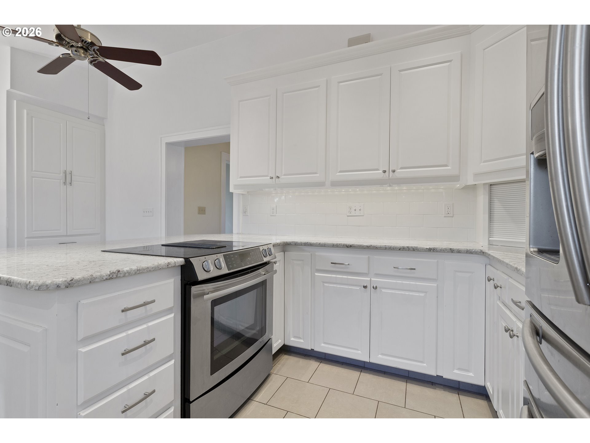 CeilingFan, GarageDoorOpener, Granite, HighCeilings, Laundry, TileFloor, WalltoWallCarpet, WasherDryer
