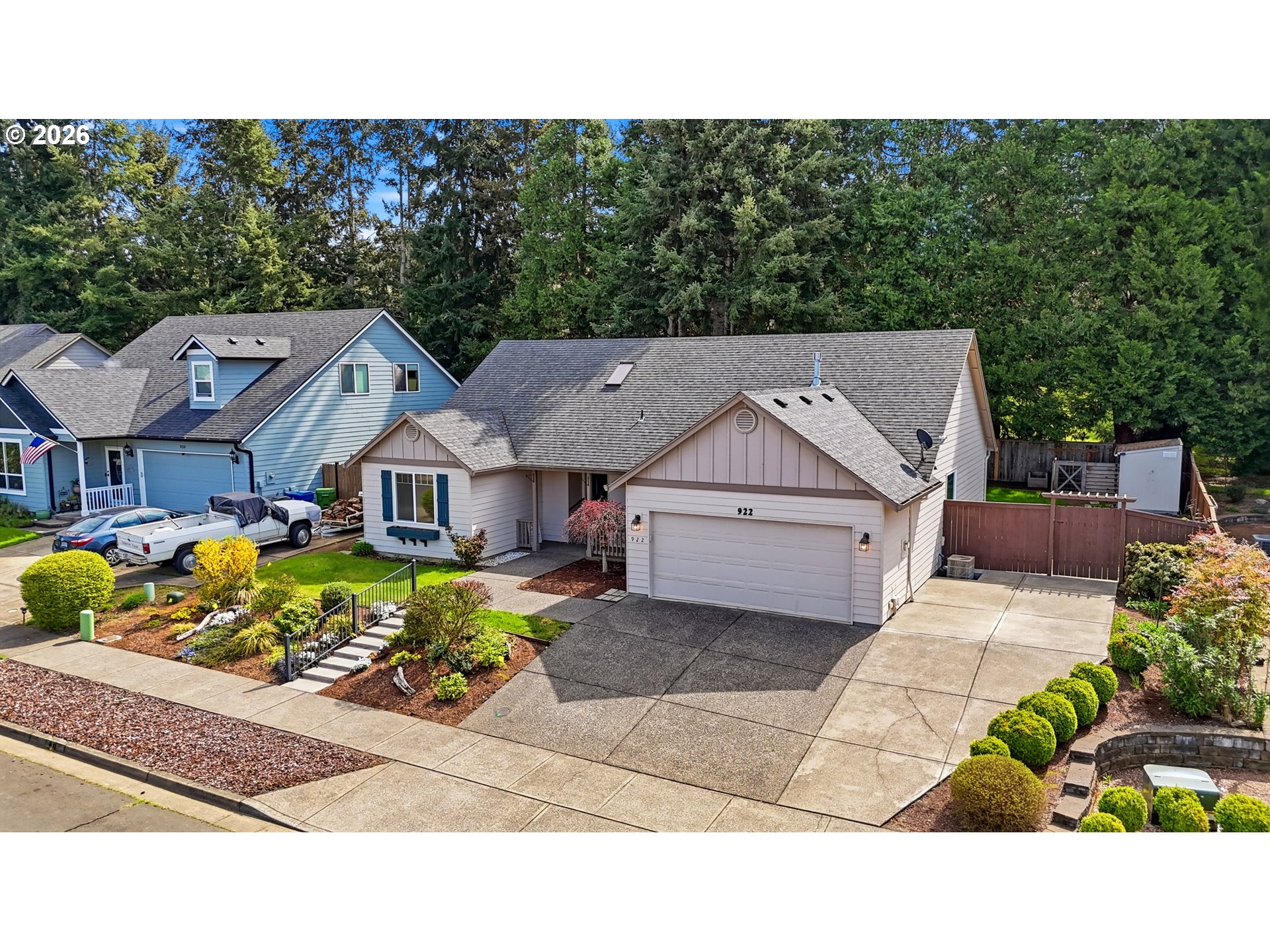 Tranquility describes this single level home offering an open concept foot print. Vaulted kitchen, dining room and living room with a fireplace compliments an abundance of natural light for year-round gatherings. Spacious kitchen with stainless steel appliances, lot of cabinet and counter space. 3 generous size bedrooms. Escape to the Primary that offers a ensuite to include a jetted tub, shower, large walk-in closet and water closet. 2nd and 3rd bedrooms offer a jack-n-jill bathroom with each having their own private vanity sinks. If you’re seeking a 4th bedroom; this Den is large. Or set up and office, play room or? Interior laundry with built-ins. Oversized 2-vehicle garage with workspace and RV parking on the side of the home. Beautifully landscaped yard surrounds this lovely home. Sit or entertain on the back porch and enjoy the tranquil fully fenced back yard to experience the sight and sounds of nature. Small kennel and tool shed.