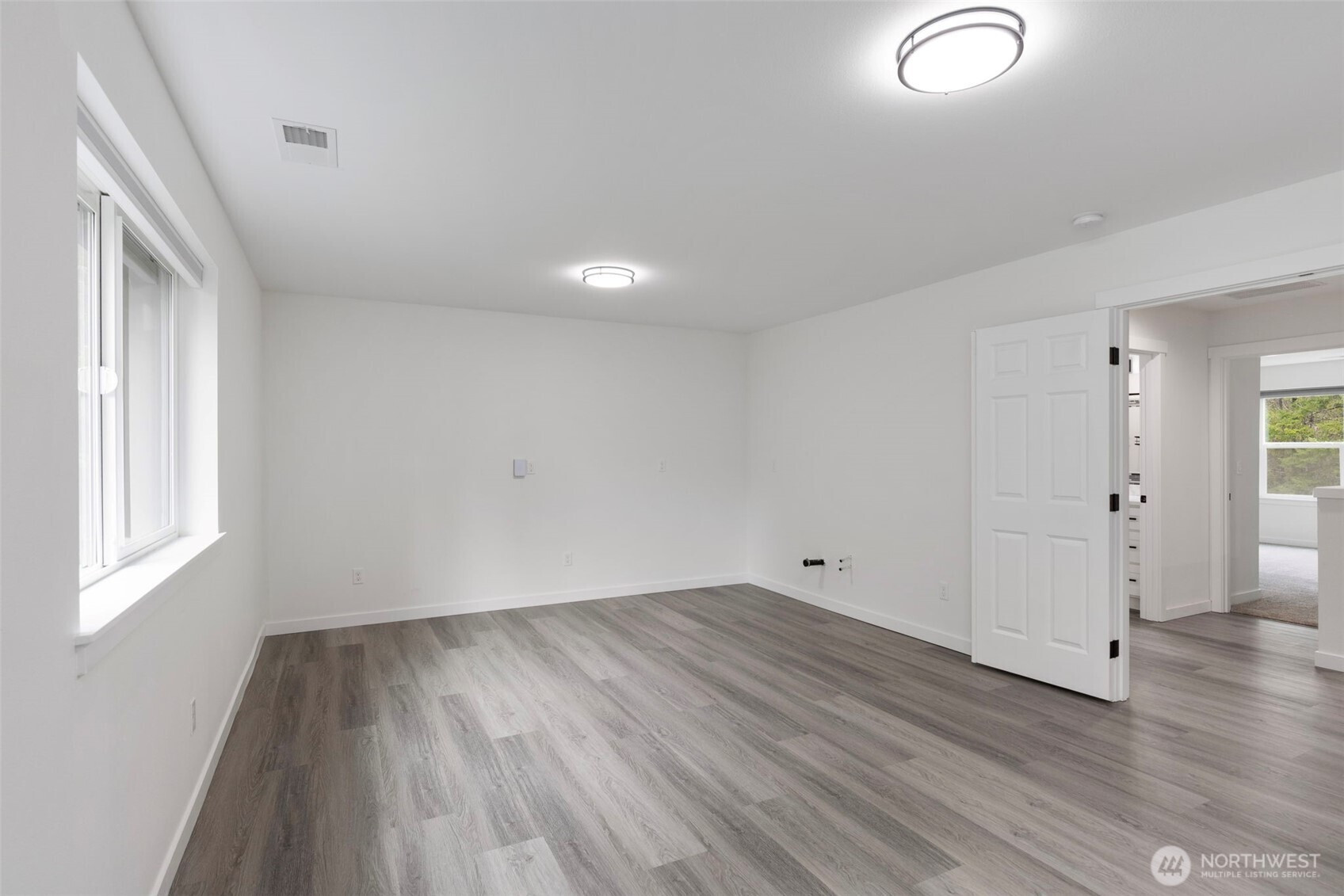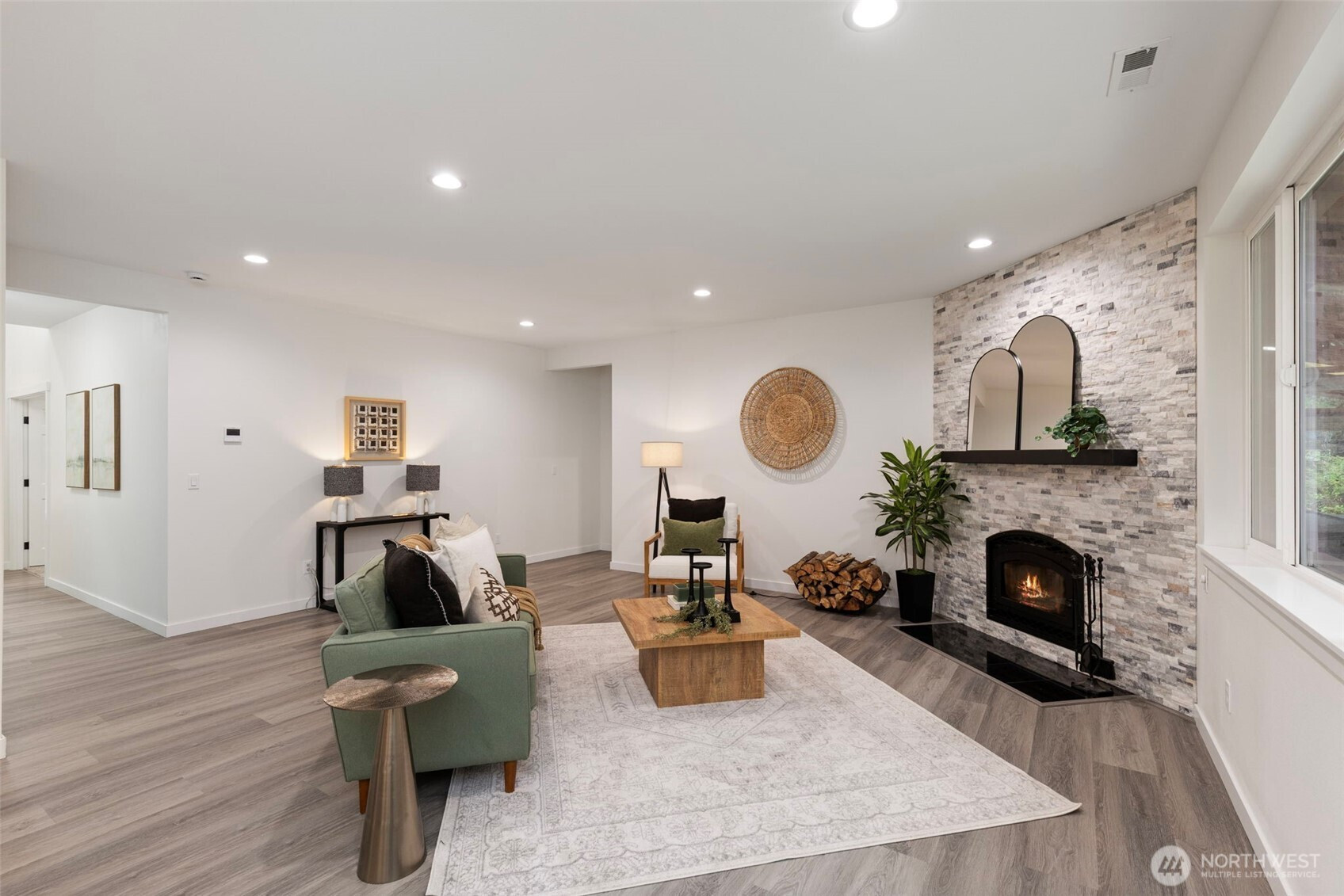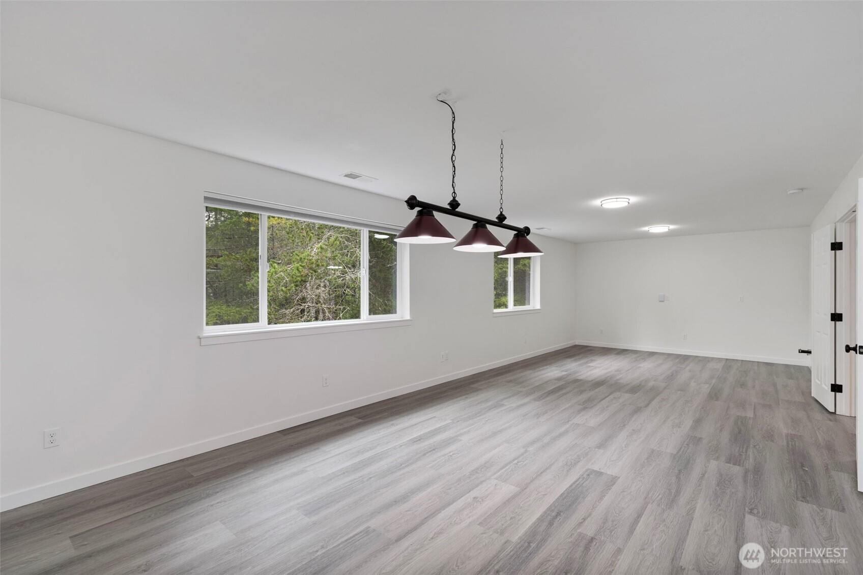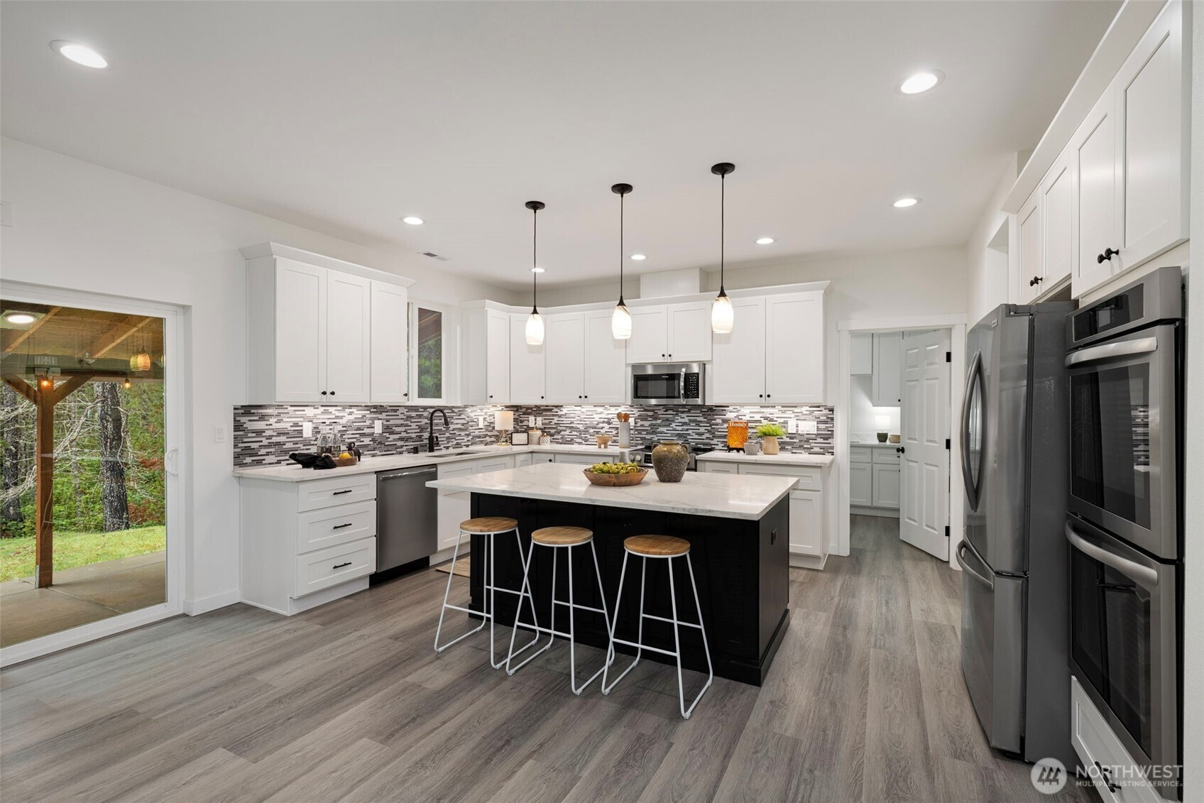 Custom-built in 2023, this stunning home sits on 5 private acres and blends NW Contemporary design with timeless comfort. The open-concept kitchen and living room feature a cozy wood-burning fireplace and seamless flow for everyday living and entertaining. A true chef’s kitchen offers quartz countertops, a large island, and three ovens—perfect for hosting and holiday gatherings. The main floor features durable LVP flooring throughout, a spacious primary suite, plus a second main-level bedroom with its own ensuite bath. A formal dining room adds flexibility for entertaining or special occasions. Upstairs, a generous rec room is plumbed for a wet bar, creating the ideal space for movie nights or game days. There are two additional guest bedrooms and a full bath upstairs. Step outside to the oversized covered back porch and relax in the hot tub while enjoying the peaceful acreage. Additional highlights include a 2-car garage with extra storage, space for a future shop, and permanent trim lights for holiday decorating ease! A whole-house Generac generator is also included. A rare opportunity to own a nearly new custom home with room to breathe.