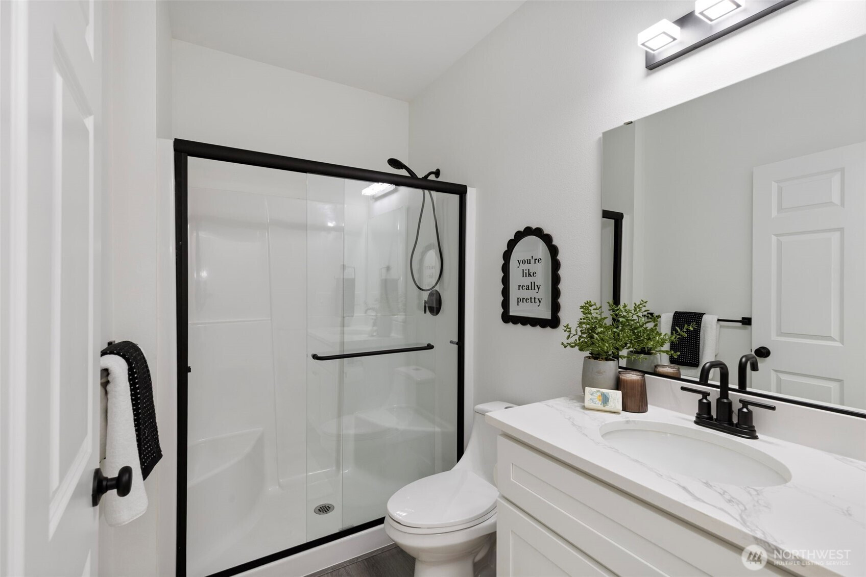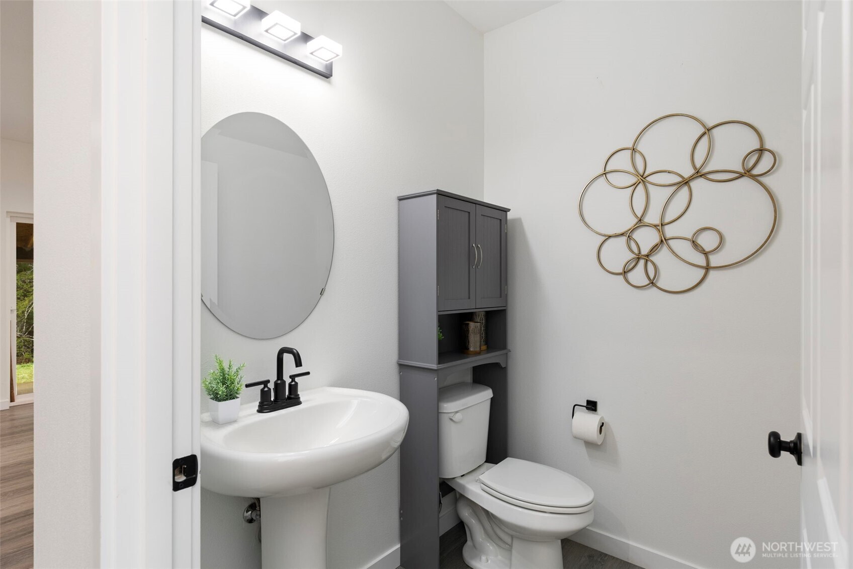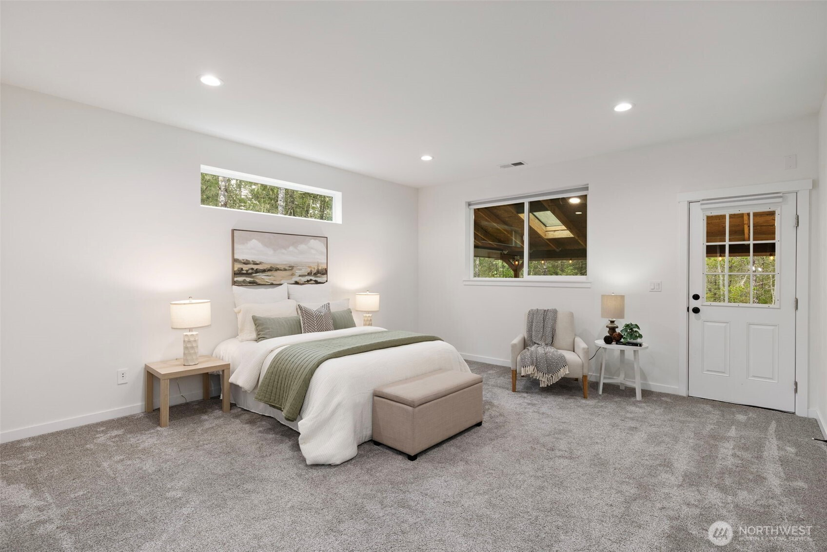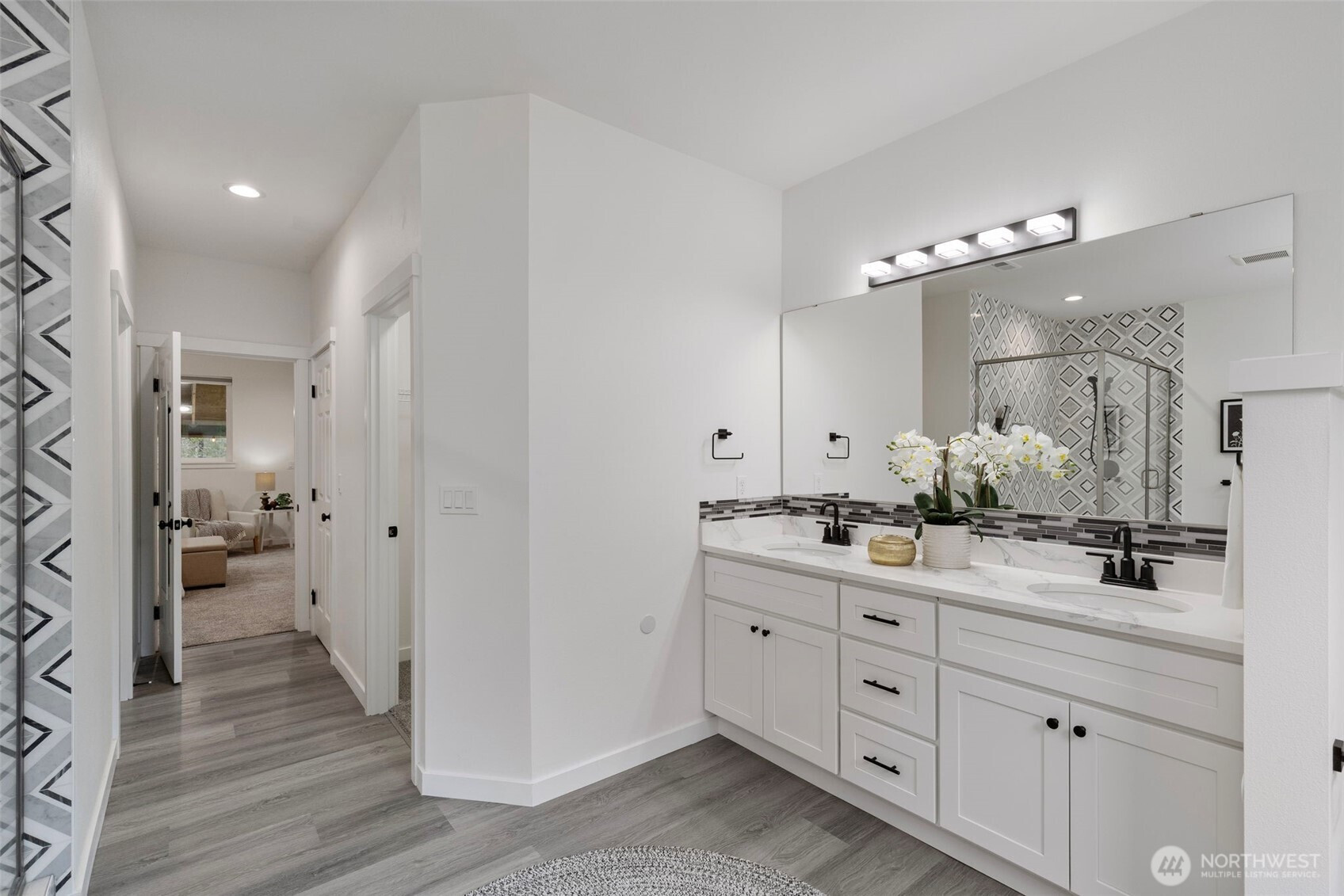 Custom-built in 2023, this stunning home sits on 5 private acres and blends NW Contemporary design with timeless comfort. The open-concept kitchen and living room feature a cozy wood-burning fireplace and seamless flow for everyday living and entertaining. A true chef’s kitchen offers quartz countertops, a large island, and three ovens—perfect for hosting and holiday gatherings. The main floor features durable LVP flooring throughout, a spacious primary suite, plus a second main-level bedroom with its own ensuite bath. A formal dining room adds flexibility for entertaining or special occasions. Upstairs, a generous rec room is plumbed for a wet bar, creating the ideal space for movie nights or game days. There are two additional guest bedrooms and a full bath upstairs. Step outside to the oversized covered back porch and relax in the hot tub while enjoying the peaceful acreage. Additional highlights include a 2-car garage with extra storage, space for a future shop, and permanent trim lights for holiday decorating ease! A whole-house Generac generator is also included. A rare opportunity to own a nearly new custom home with room to breathe.