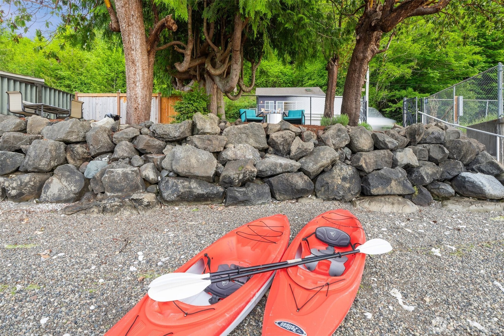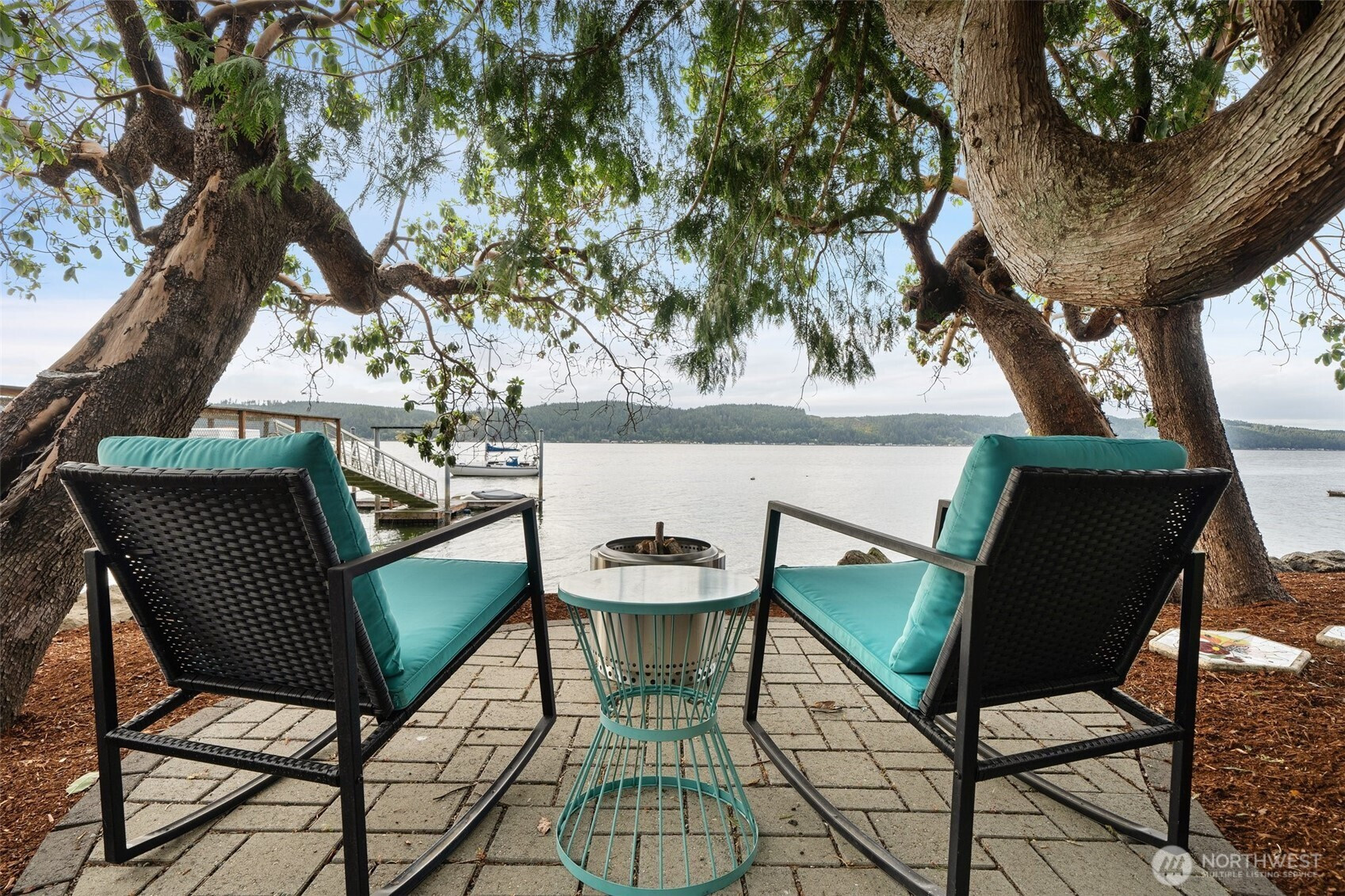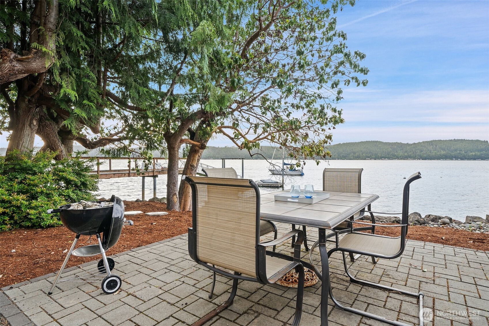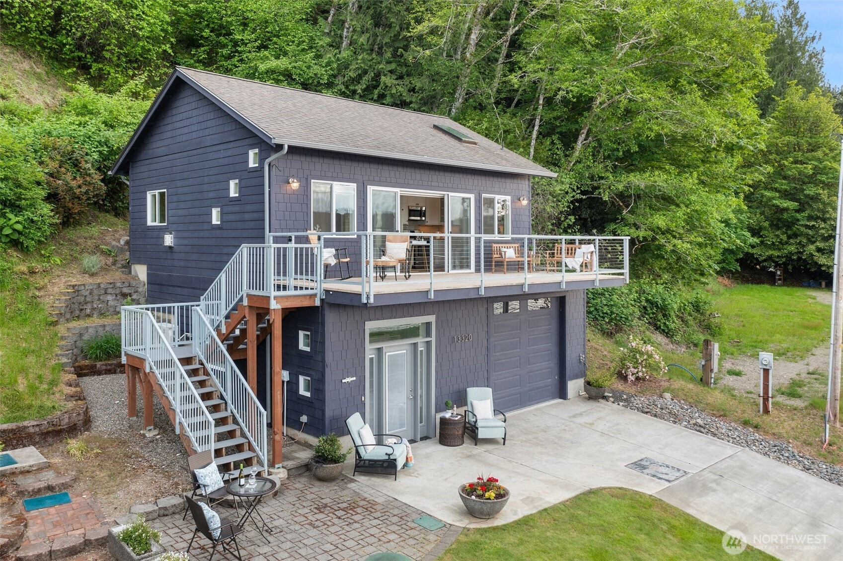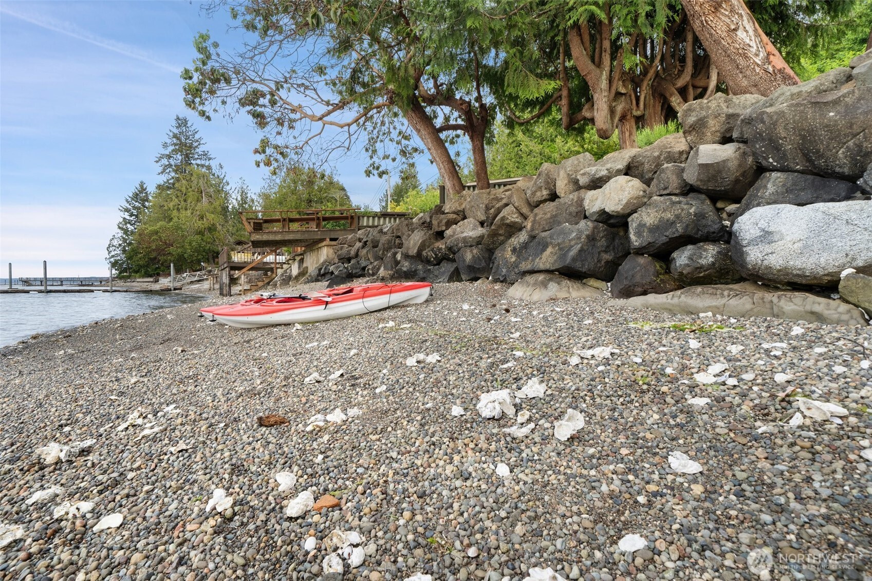 Welcome to your private Hood Canal sanctuary, where 50 feet of low-bank waterfront, owned tidelands, and breathtaking Olympic Mountain views set the stage for an extraordinary coastal lifestyle. Nestled along the coveted South Shore, this custom-crafted home offers a rare blend of comfort, design, and natural beauty. The upper level is designed to impress, with vaulted ceilings, designer wallpaper, and an open-concept layout that captures stunning views from the living room, kitchen, and dining area. Step out onto the expansive deck to enjoy fresh salt air, passing boats, and unforgettable sunsets. A cozy bedroom and ¾ bath complete this level. On the main floor, a spacious flex room offers versatility for guests, additional sleeping area, a media retreat, or private office, complemented by a full bath and generous storage. An oversized garage and ample driveway parking provide both convenience and functionality. Outdoors, the fully fenced waterside setting features multiple patios and direct, easy access to your private beach. Enjoy kayaking, shellfish harvesting, or sunsets evenings by the fire as the canal glows.