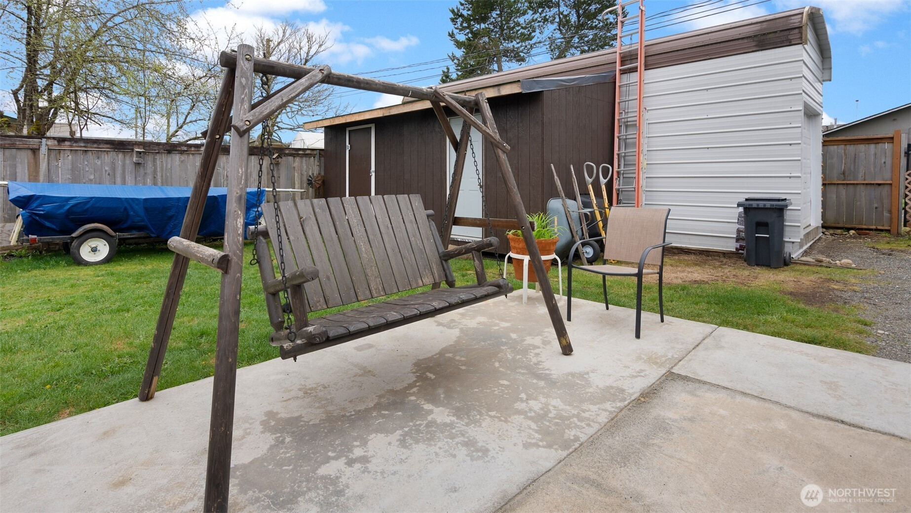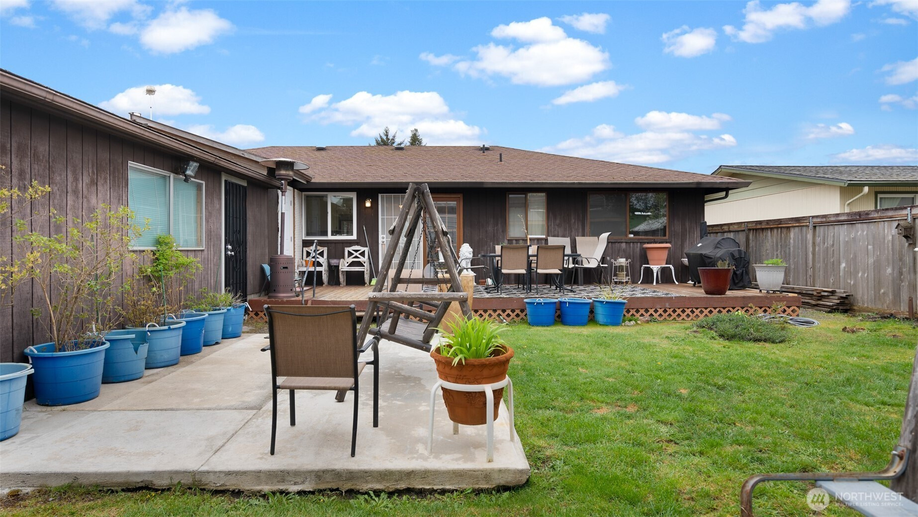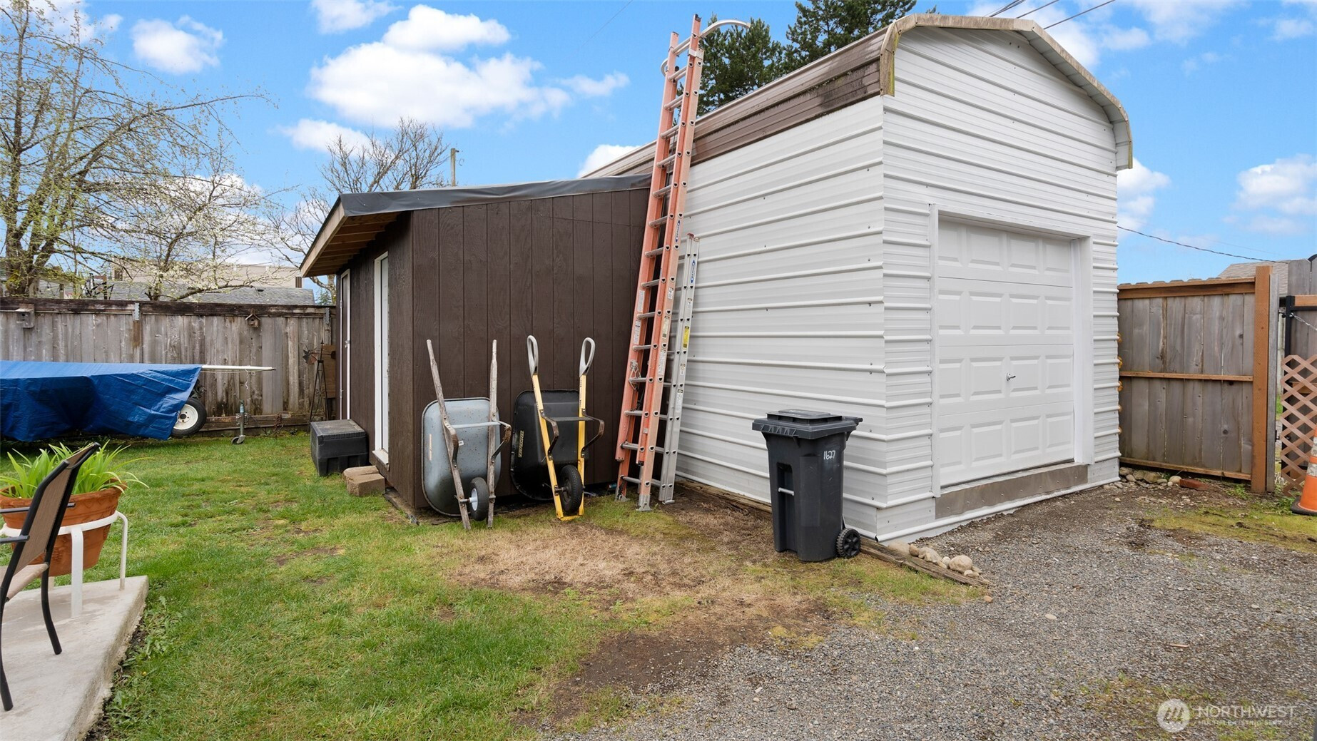 Charming one-level home offering 3 bedrooms and 1.5 bathrooms, thoughtfully maintained and full of potential. Enjoy a spacious layout with a large family room perfect for gatherings and everyday living. The galley kitchen flows into a generous pantry/utility space, providing ample storage and functionality. The property features a large 2-car garage plus an additional enclosed garage/shop space, ideal for hobbies or extra workspace and lots of shed space. Step outside to a fully fenced backyard with a large back deck perfect for entertaining, along with a wide gate for convenient alley access. Located close to town, this home combines comfort, versatility, and opportunity.
