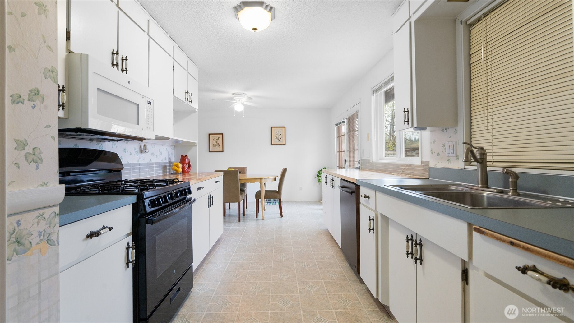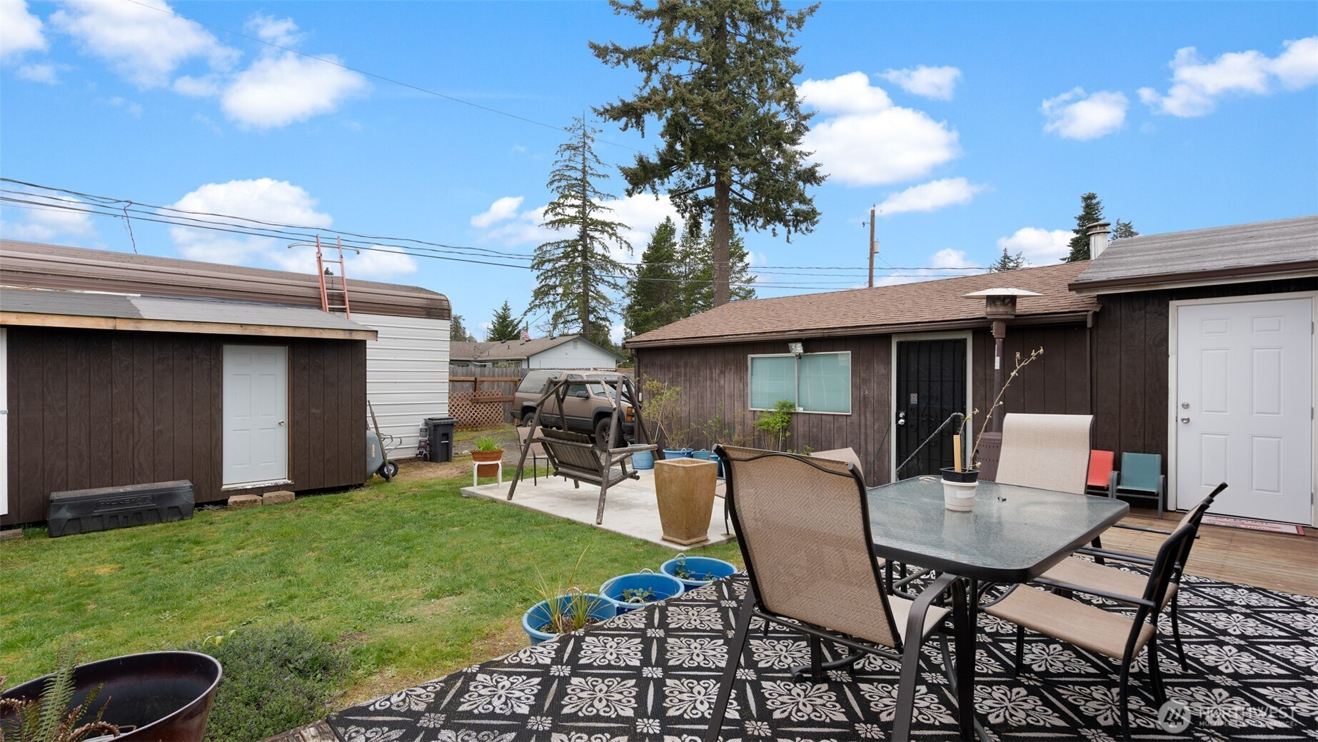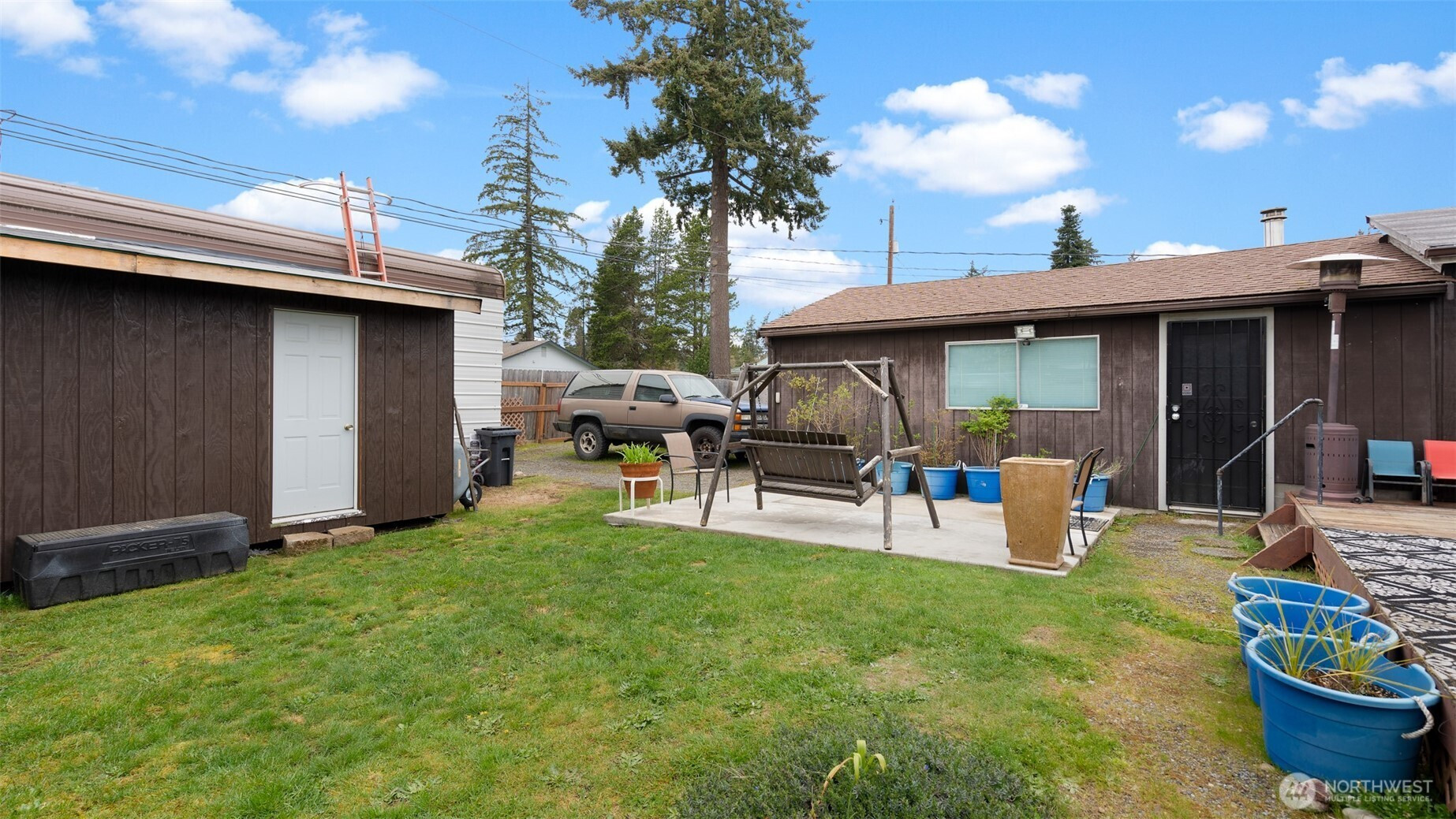Charming one-level home offering 3 bedrooms and 1.5 bathrooms, thoughtfully maintained and full of potential. Enjoy a spacious layout with a large family room perfect for gatherings and everyday living. The galley kitchen flows into a generous pantry/utility space, providing ample storage and functionality. The property features a large 2-car garage plus an additional enclosed garage/shop space, ideal for hobbies or extra workspace and lots of shed space. Step outside to a fully fenced backyard with a large back deck perfect for entertaining, along with a wide gate for convenient alley access. Located close to town, this home combines comfort, versatility, and opportunity.
