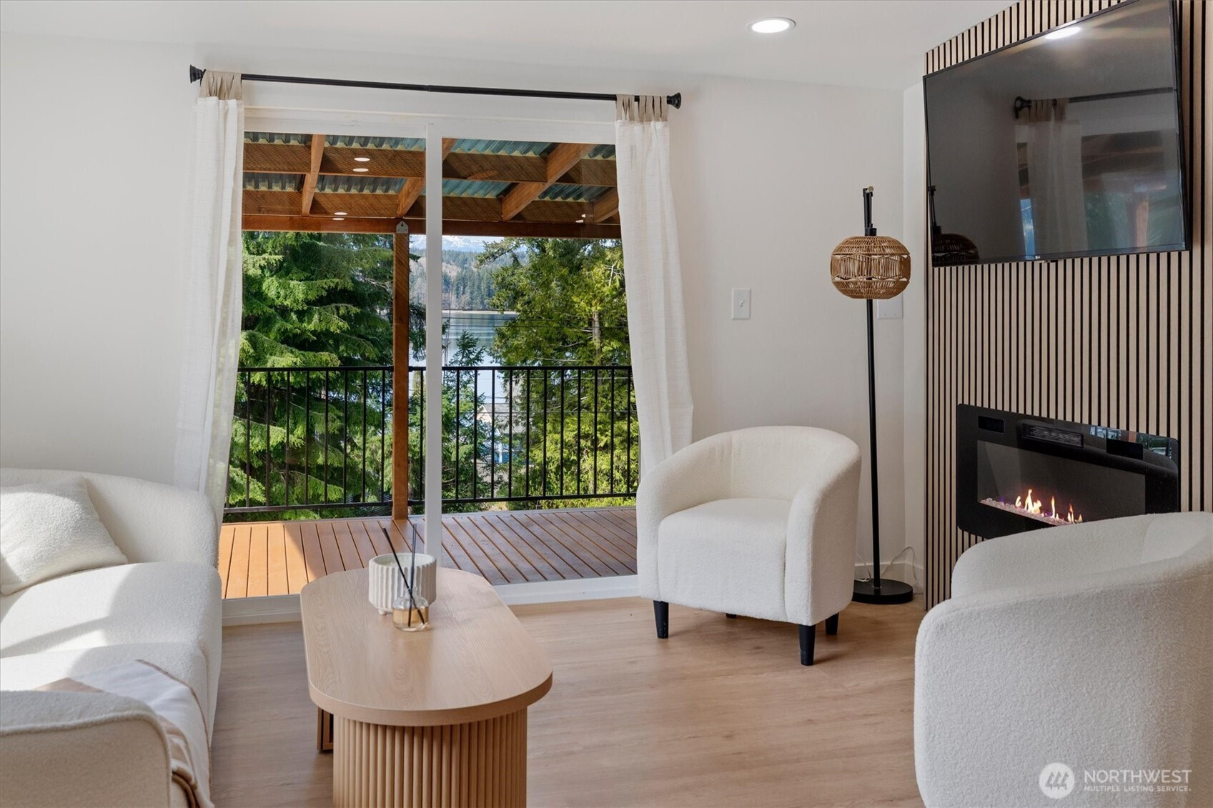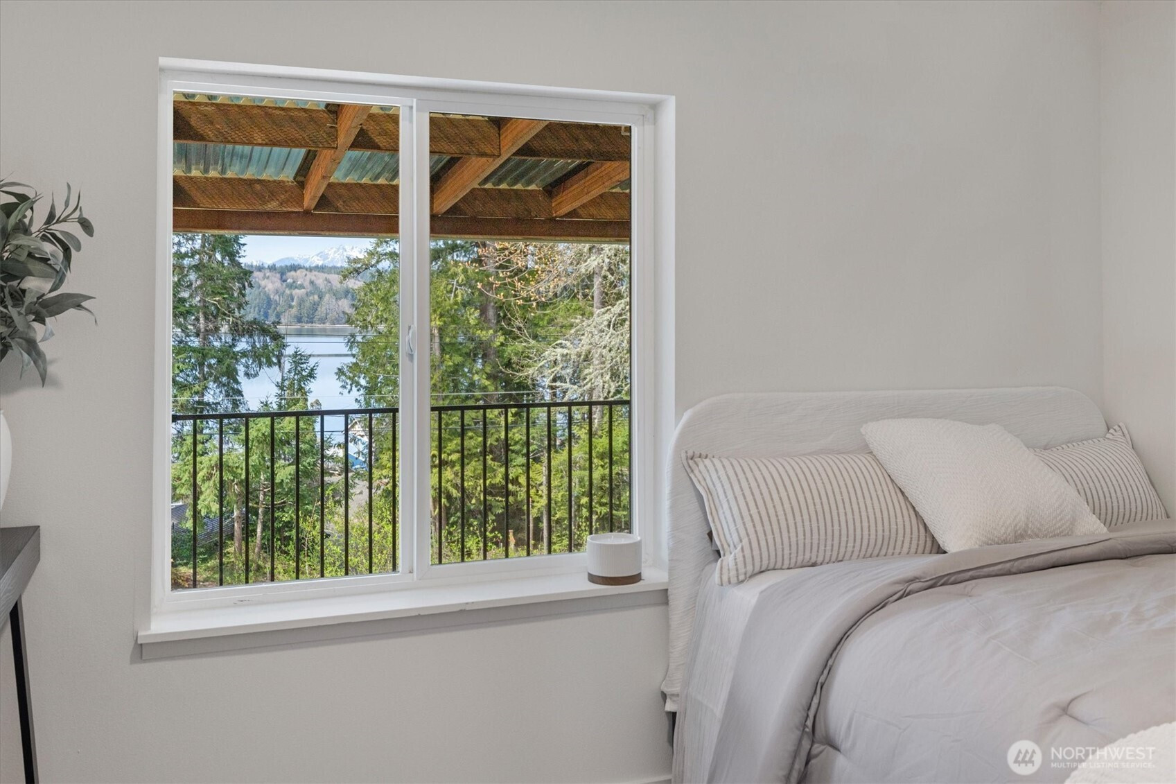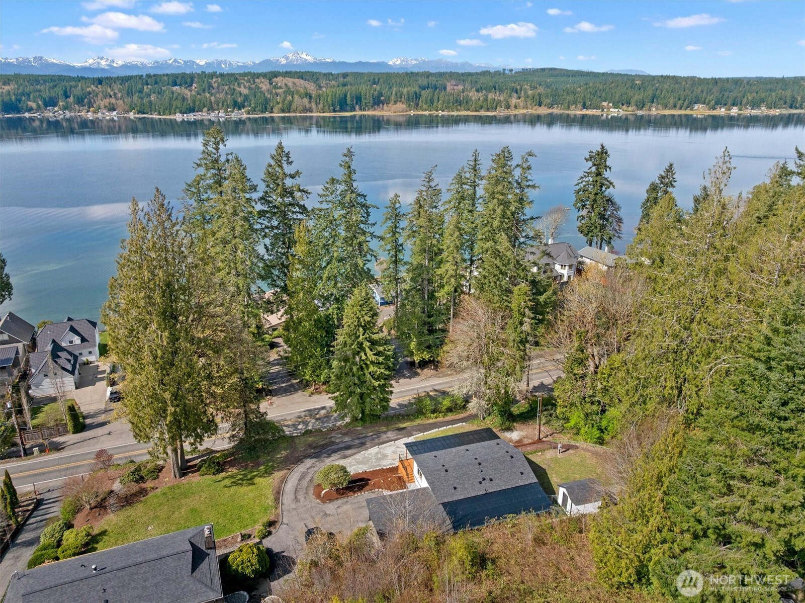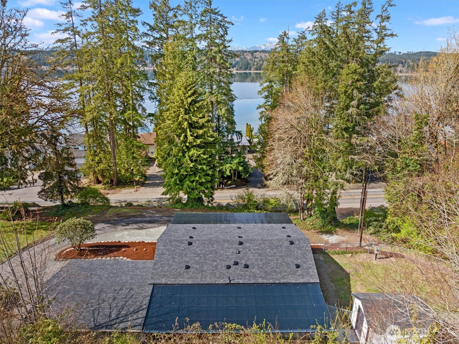 Stunningly updated home on a spacious lot with views of Lynch Cove! A long, private driveway with water views leads to the property, offering privacy and plenty of parking. Enjoy views of Lynch Cove from the driveway, wraparound deck, and even from the living room. This home has been thoughtfully updated throughout with new exterior windows, fresh interior and exterior paint, new front and back decks, and new interior doors. Beautiful LVP flooring flows throughout, while vaulted ceilings create a bright and open feel. The kitchen features modern two-tone cabinetry, stainless steel appliances, tile backsplash, farmhouse sink, and pantry, with a dining area just off the kitchen and space for a stackable washer and dryer. The inviting living room showcases a cozy electric fireplace set on a stunning feature wall and opens to the wraparound covered deck—perfect for year-round enjoyment. The fully updated bathroom includes a tile surround shower/tub combo with rain shower head, floating vanity, and stylish gold hardware accents. Outside, enjoy multiple covered deck spaces ideal for entertaining, a fully fenced side yard, detached carport, and additional storage shed. Plenty of space, privacy, water views, and updates—this one is move-in ready!