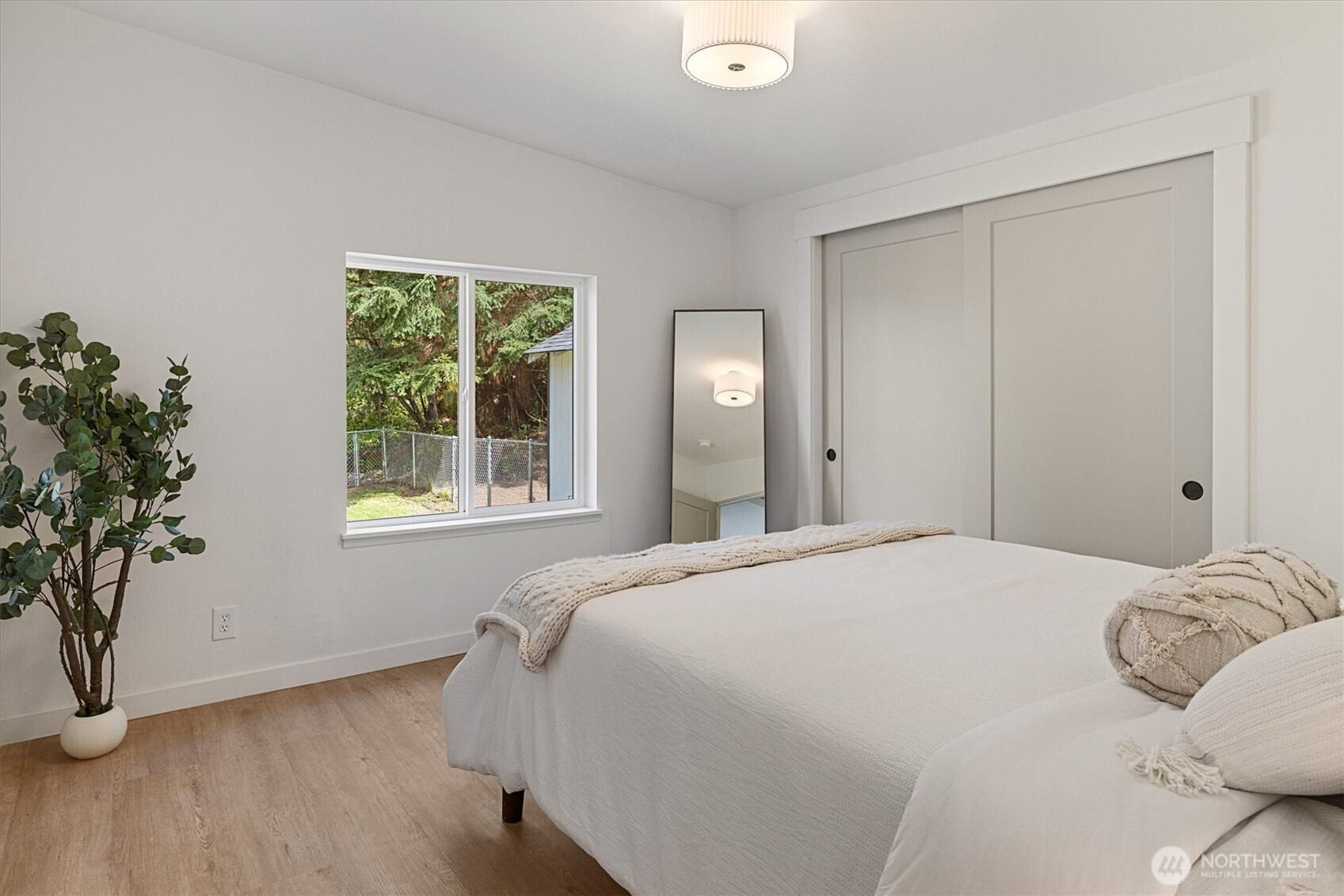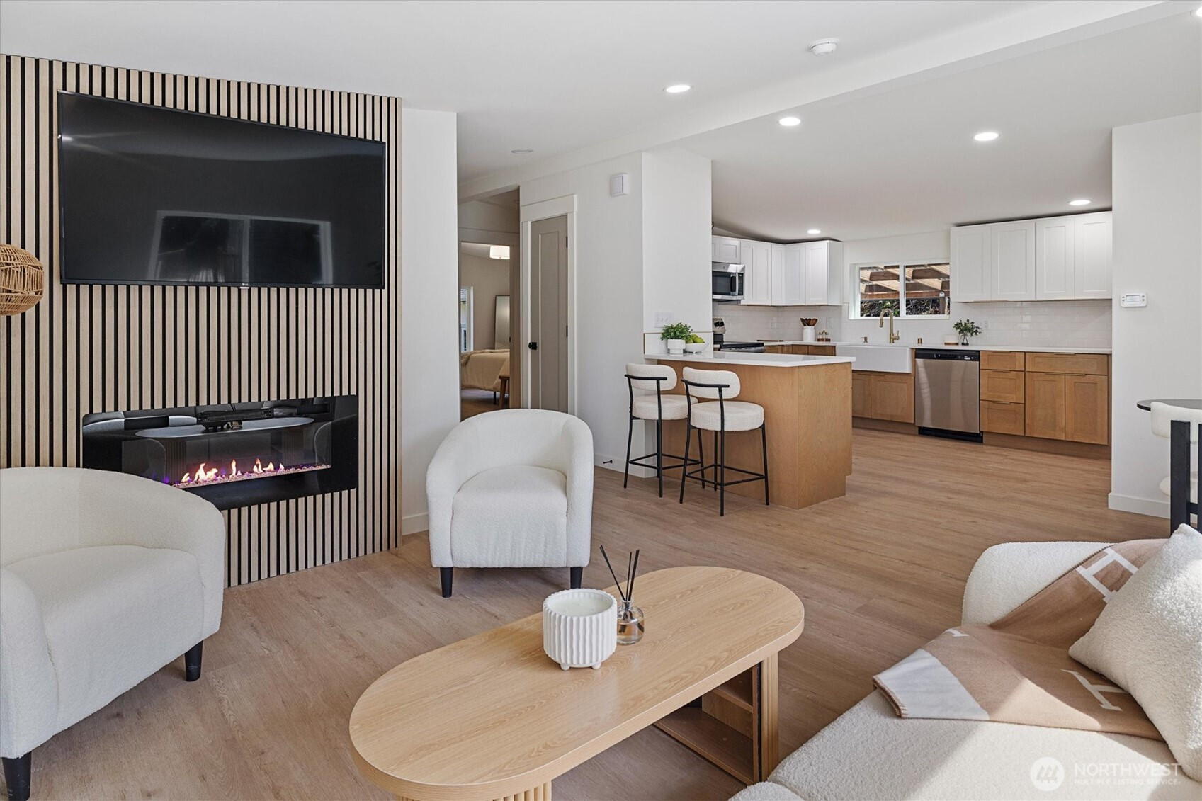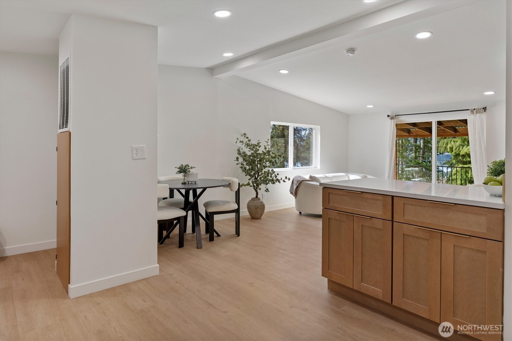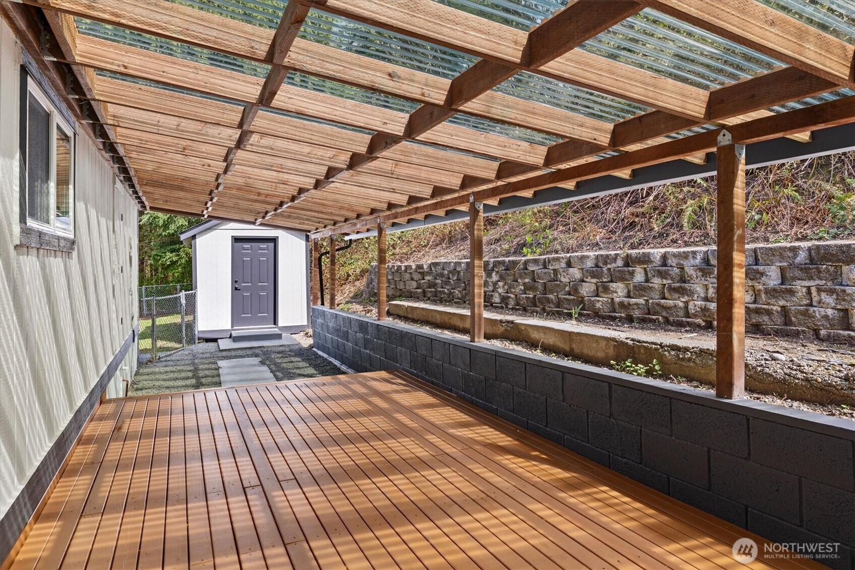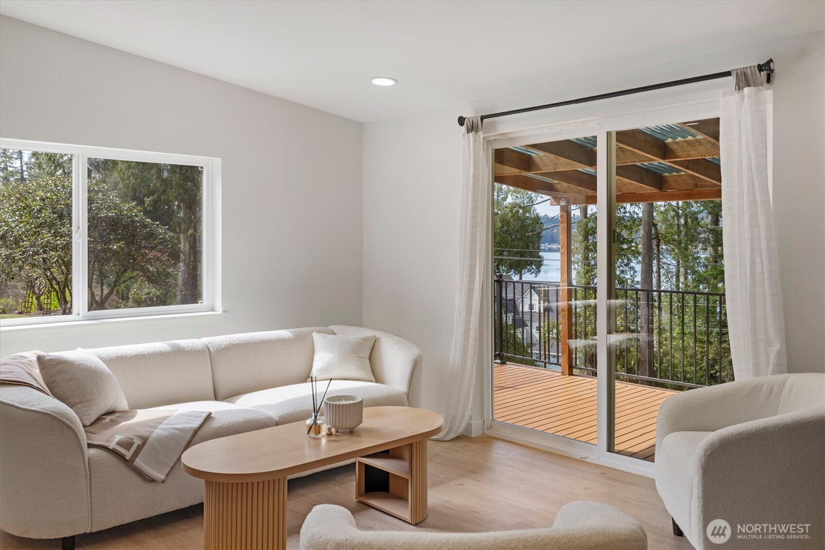 Stunningly updated home on a spacious lot with views of Lynch Cove! A long, private driveway with water views leads to the property, offering privacy and plenty of parking. Enjoy views of Lynch Cove from the driveway, wraparound deck, and even from the living room. This home has been thoughtfully updated throughout with new exterior windows, fresh interior and exterior paint, new front and back decks, and new interior doors. Beautiful LVP flooring flows throughout, while vaulted ceilings create a bright and open feel. The kitchen features modern two-tone cabinetry, stainless steel appliances, tile backsplash, farmhouse sink, and pantry, with a dining area just off the kitchen and space for a stackable washer and dryer. The inviting living room showcases a cozy electric fireplace set on a stunning feature wall and opens to the wraparound covered deck—perfect for year-round enjoyment. The fully updated bathroom includes a tile surround shower/tub combo with rain shower head, floating vanity, and stylish gold hardware accents. Outside, enjoy multiple covered deck spaces ideal for entertaining, a fully fenced side yard, detached carport, and additional storage shed. Plenty of space, privacy, water views, and updates—this one is move-in ready!