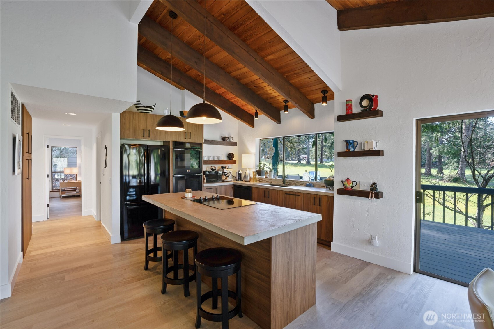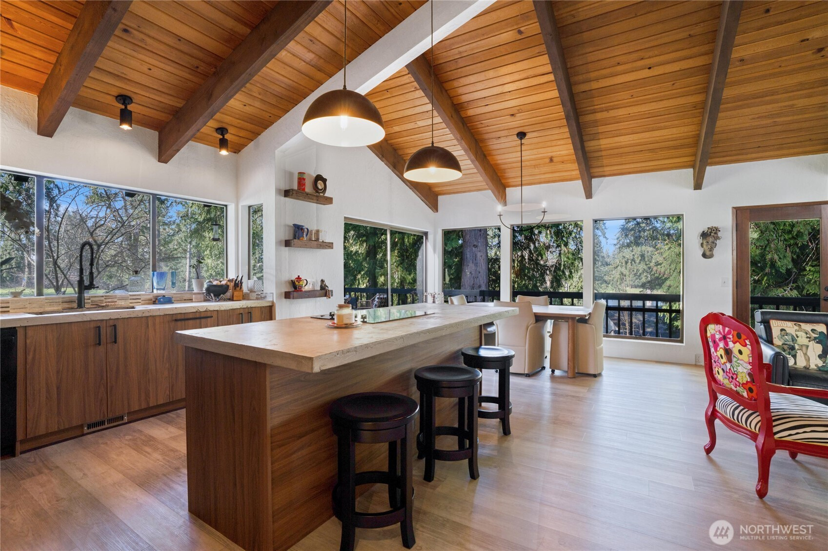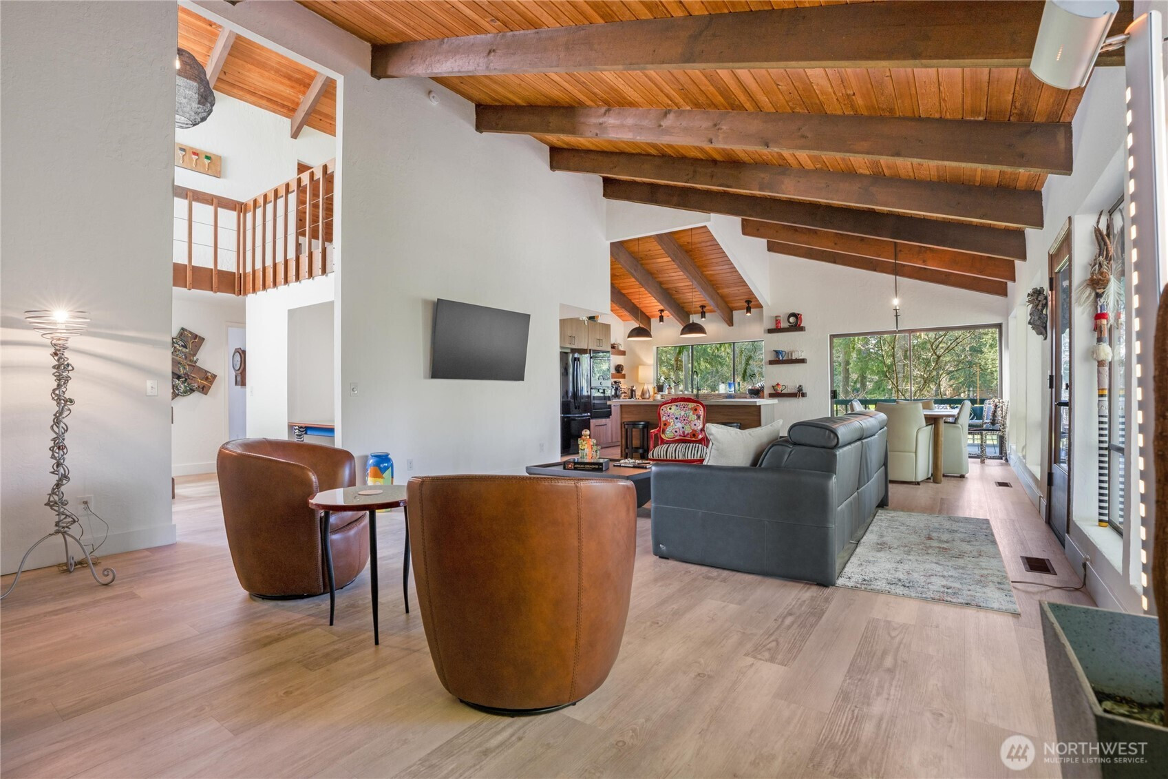 Experience Golf Course living at its finest. This 3644 sq ft tri level home thoughtfully laid out for entertaining is perfectly positioned on the 6th green of the community’s 27 hole PGA golf course . Designed to impress , this 3 bed , 3 bath home with Primary on main ,showcases breathtaking architectural character with exposed interior timber beams flowing through souring vaulted ceilings and expansive windows that frame sweeping golf course and lake views right from your backyard.Enjoy The oversized deck with plenty of room for entertaining and relaxing while watching golfers! The designer kitchen is built for both entertaining and everyday living, featuring concrete countertops, double ovens, and generous workspace, seamlessly connecting to bright and inviting living areas.Upstairs is an adorable loft that can be anything from an office space, reading area or whatever you see it to be! The lower level offers incredible flexibility with separate living quarters — complete with private entrance, full kitchen, living area, bedroom, bath, and bonus room — ideal for multi-generational living, guest accommodations, income potential, or Airbnb opportunity. Enjoy peaceful outdoor living overlooking manicured fairways, plus the convenience of an oversized garage with ample storage for vehicles, golf carts, or hobbies. A rare opportunity to own a spacious golf course home combining luxury, versatility, and unforgettable views.