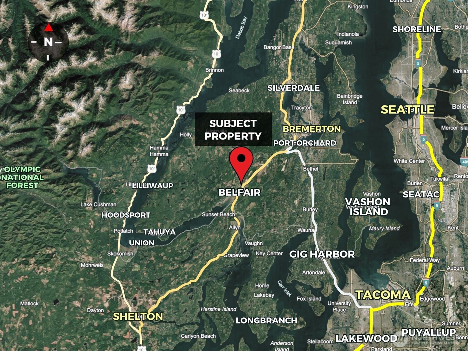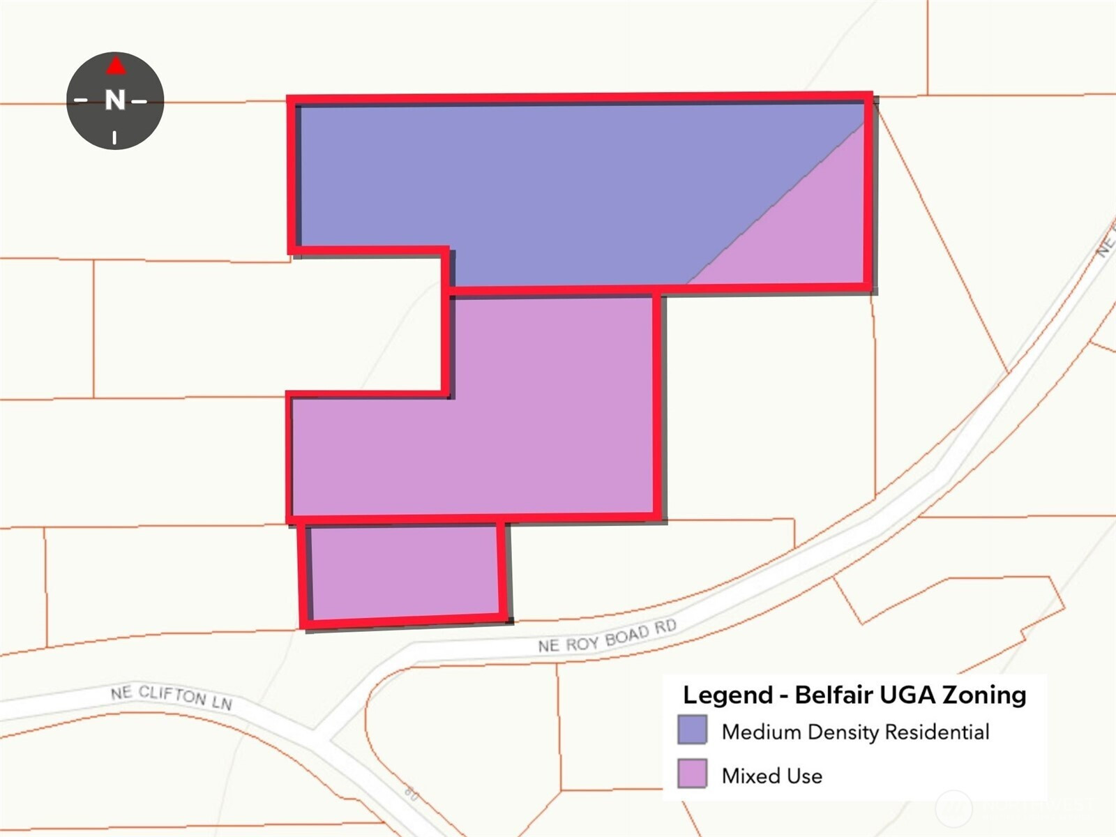 4+ acres comprised of three (3) parcels with dual zoning classifications: MU (Mixed Use) & R-5 (Residential 5). Electric on-site w/ water, sewer, & storm in-street. MU zoning allows for a wide range of commercial and business uses, including retail, restaurants, cafés/bars, medical clinics, offices, light manufacturing, multifamily housing, townhomes, and related uses. R-5 zoning permits single-family, duplex, and triplex uses at a maximum density of five (5) units per acre. This property is located directly across the street from Safeway, Verizon, and Subway, approximately two (2) minutes from State Routes 3 and 16, and about seven (7) minutes from Bremerton Airport. Situated near the intersection of NE Old Belfair Highway and NE Clifton, the site benefits from a combined average daily traffic count of approximately 35,000 vehicles making it well-positioned for commercial, mixed-use, or multifamily development.