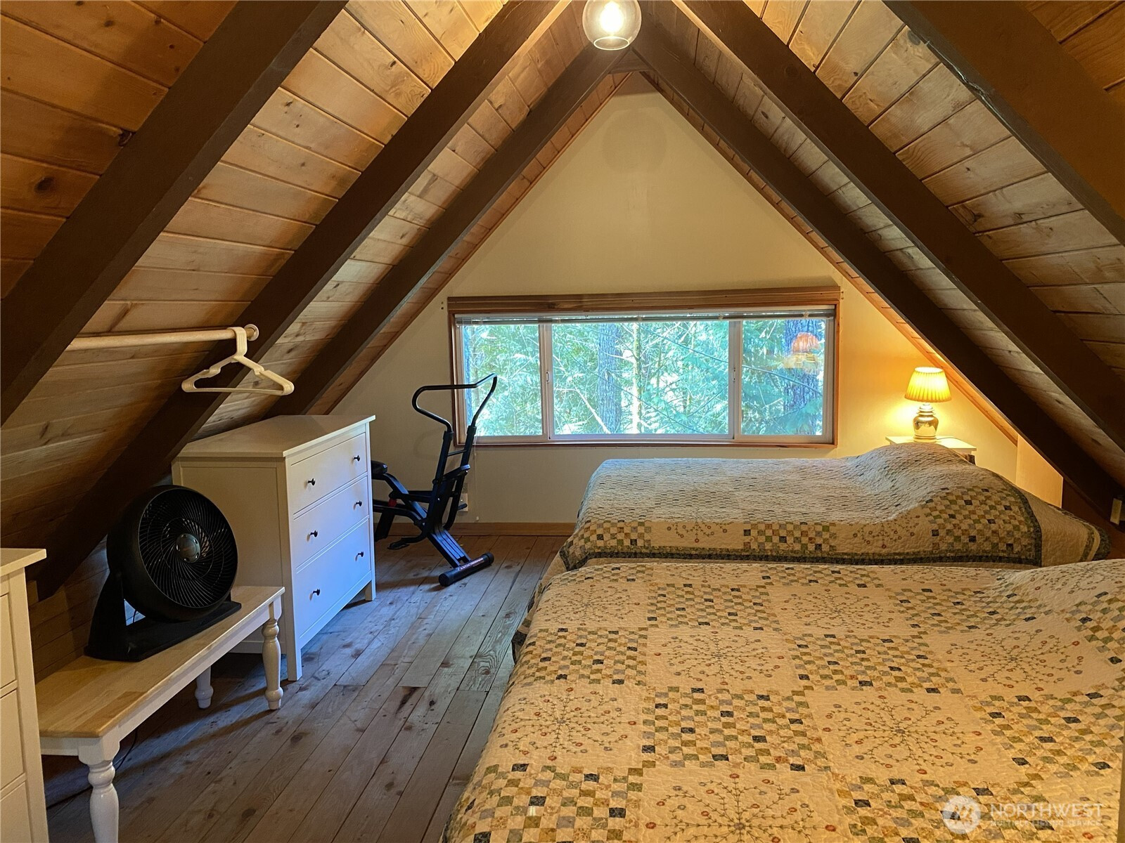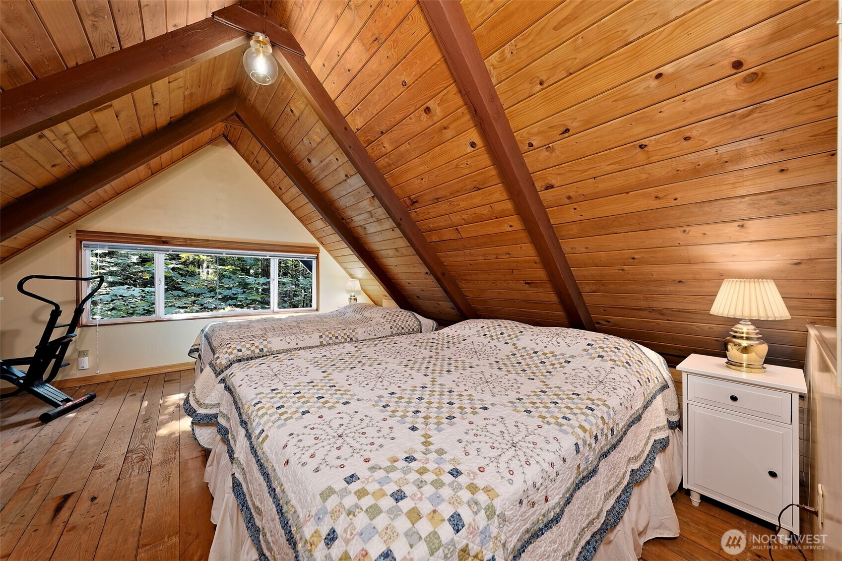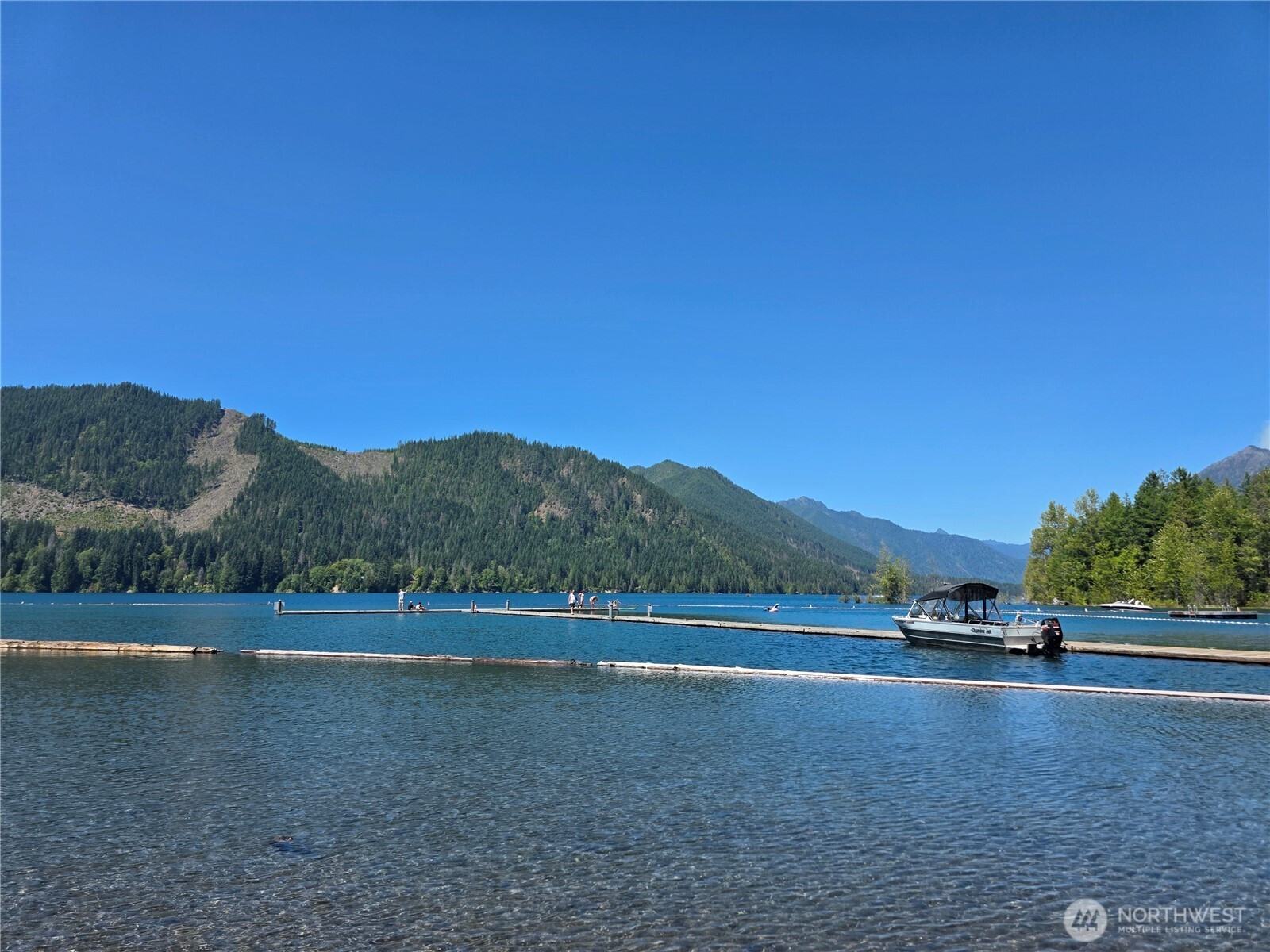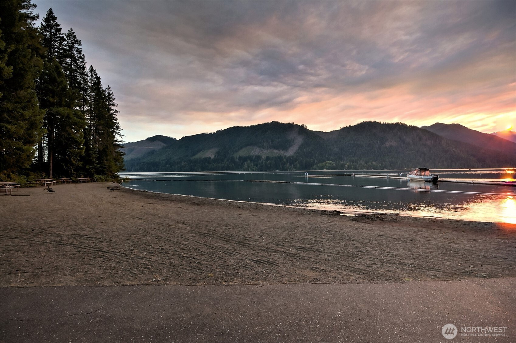 This property comes with an additional corner lot providing lots of space and privacy. Just steps away from Pioneer Village Division 1 Community Park-one of the nicest community parks on Lake Cushman with beach area, gazebo, restrooms, boat launch, dock, basketball court, volleyball court, and a playground area. Step into this PNW open concept cabin with ton and groove vaulted ceilings, laminate flooring, 3/4 bath, efficient kitchen, dining area and cozy living room with a free-standing woodstove. Sliding doors take you out to a large deck overlooking a greenbelt with a peekaboo view of the lake. Upstairs has a very large bedroom and 1/2 bath. Excellent opportunity to bring your dreams to fruition of waterfront fun without the waterfront taxes or for investment,full time, part time/recreational living.Every day is a vacation here!