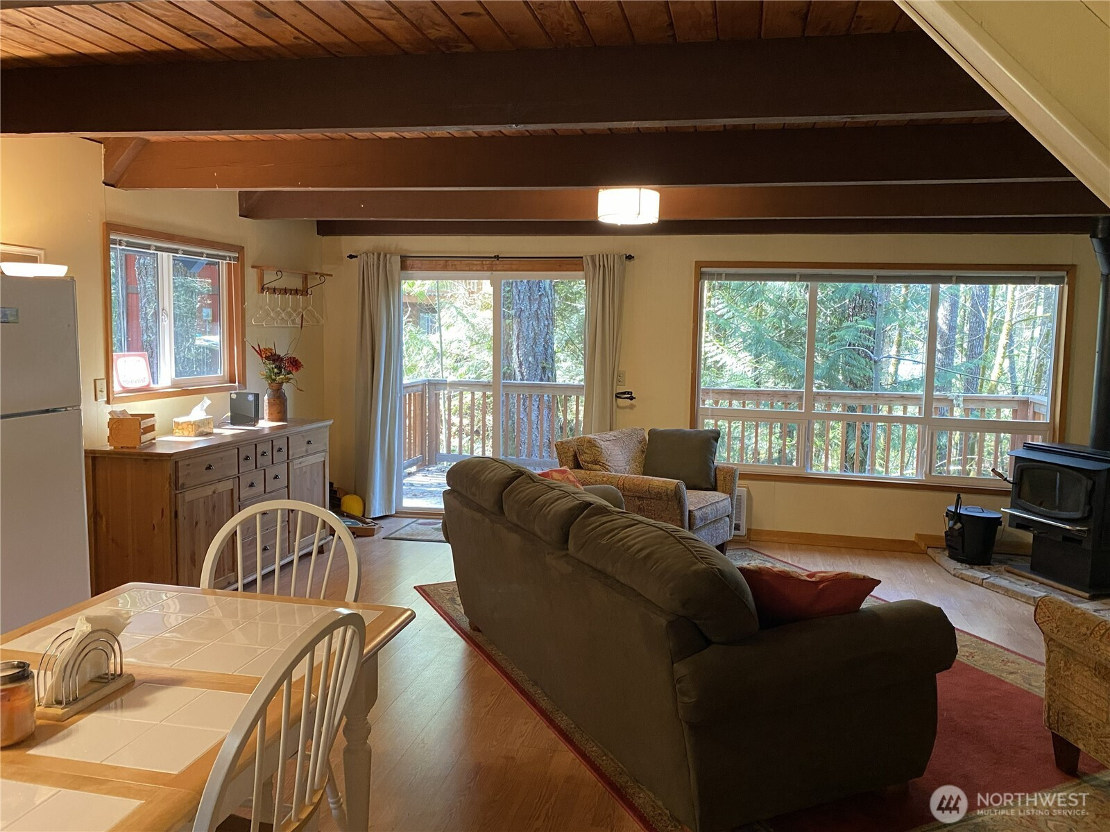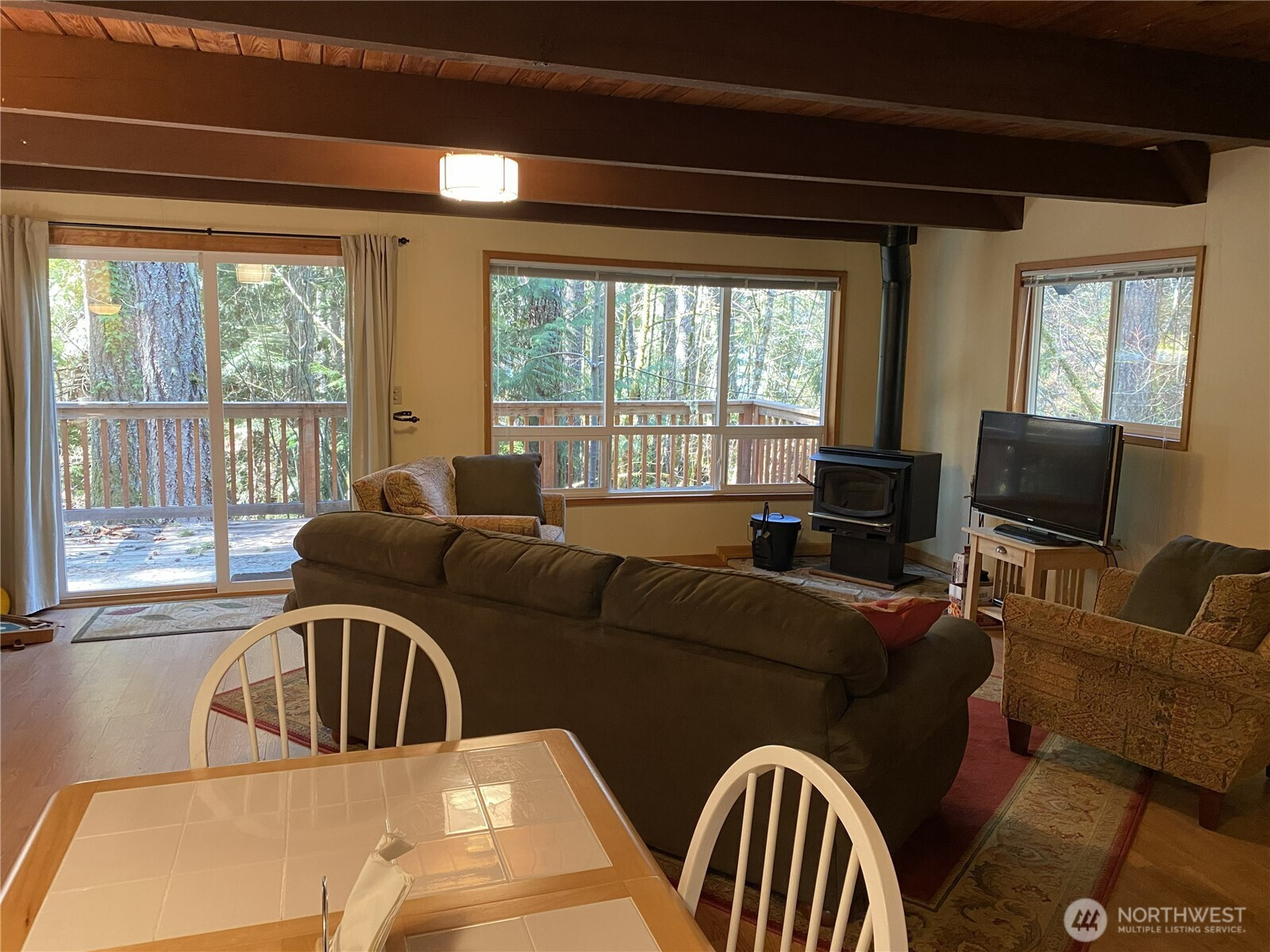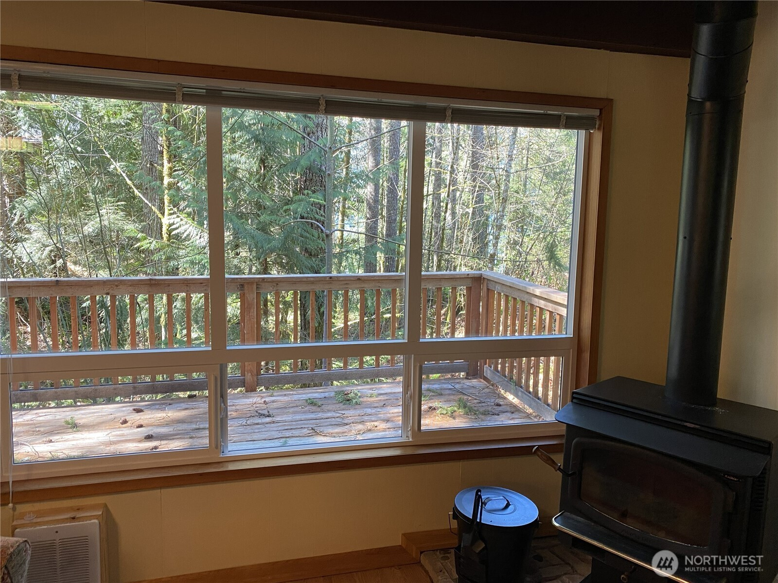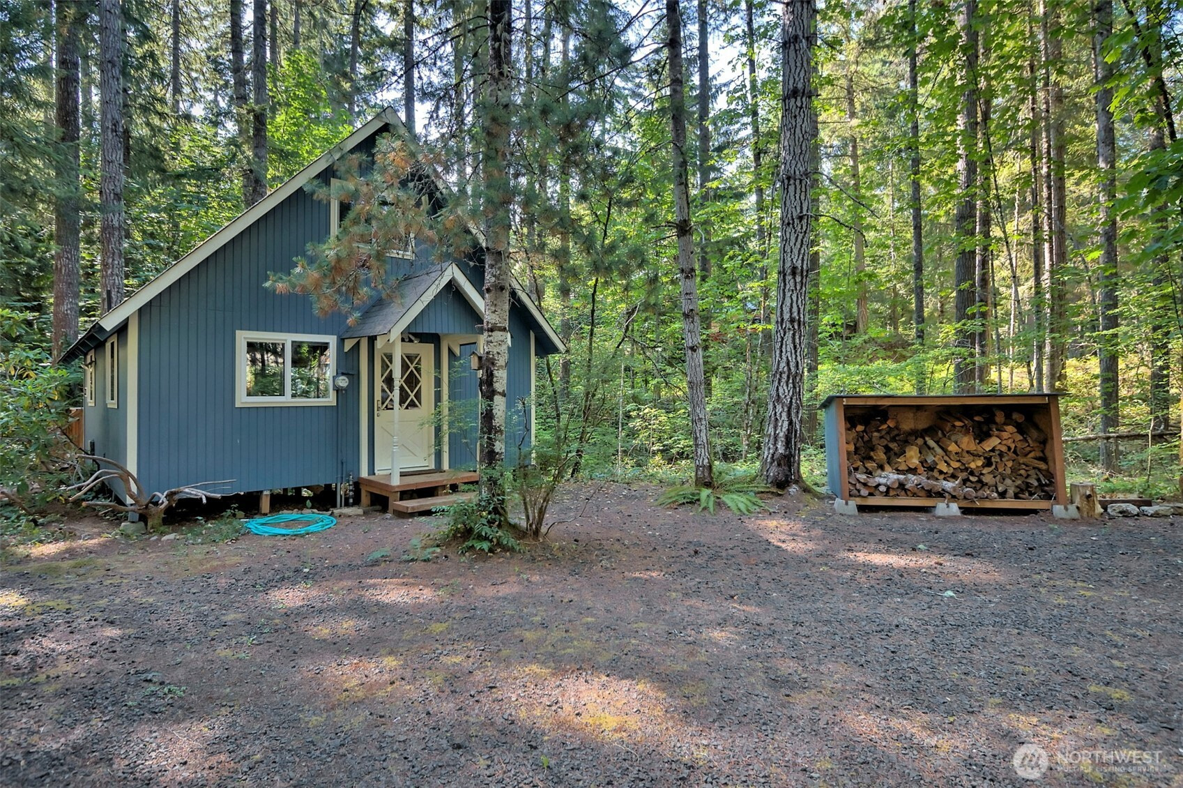 This property comes with an additional corner lot providing lots of space and privacy. Just steps away from Pioneer Village Division 1 Community Park-one of the nicest community parks on Lake Cushman with beach area, gazebo, restrooms, boat launch, dock, basketball court, volleyball court, and a playground area. Step into this PNW open concept cabin with ton and groove vaulted ceilings, laminate flooring, 3/4 bath, efficient kitchen, dining area and cozy living room with a free-standing woodstove. Sliding doors take you out to a large deck overlooking a greenbelt with a peekaboo view of the lake. Upstairs has a very large bedroom and 1/2 bath. Excellent opportunity to bring your dreams to fruition of waterfront fun without the waterfront taxes or for investment,full time, part time/recreational living.Every day is a vacation here!