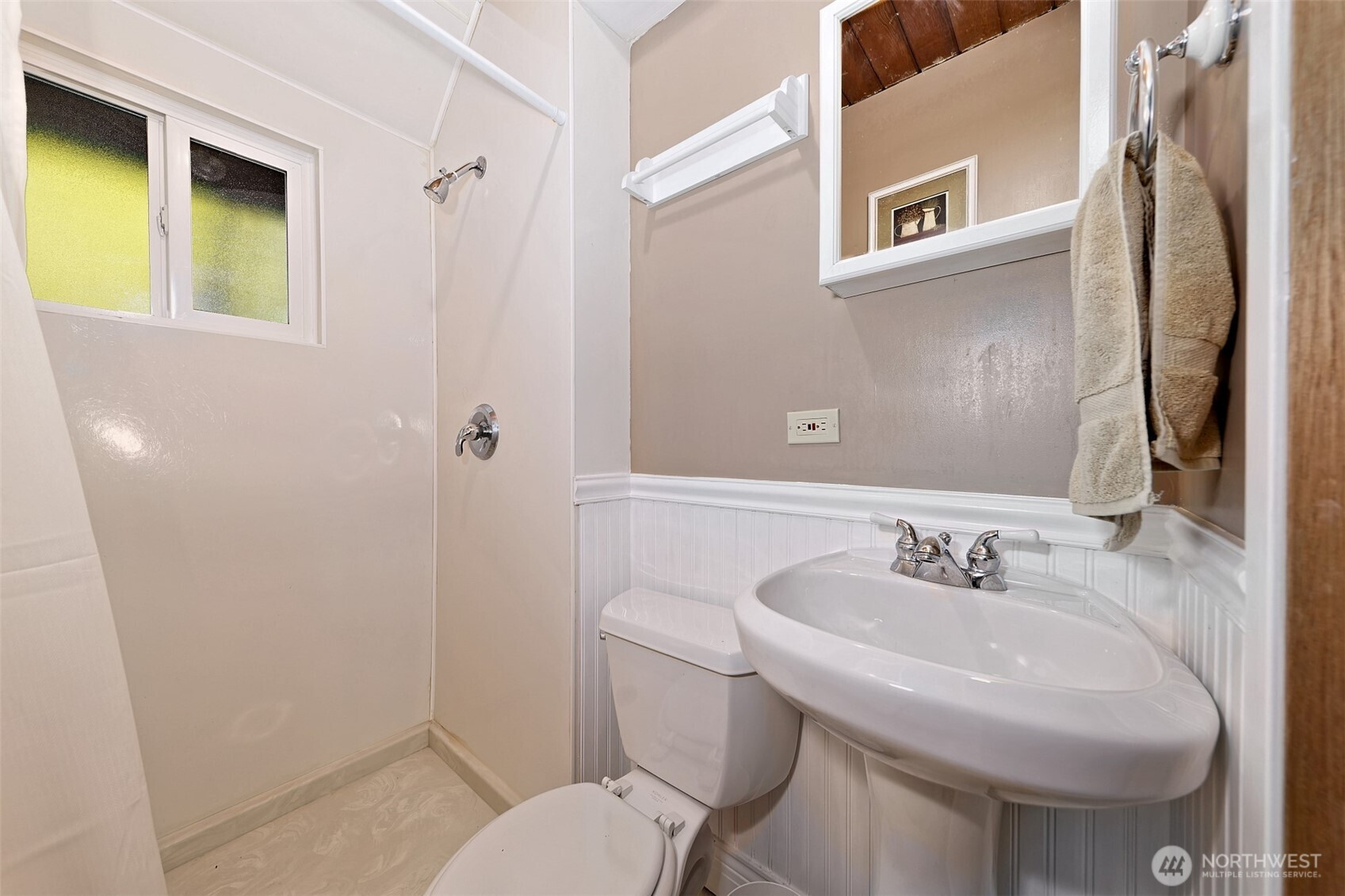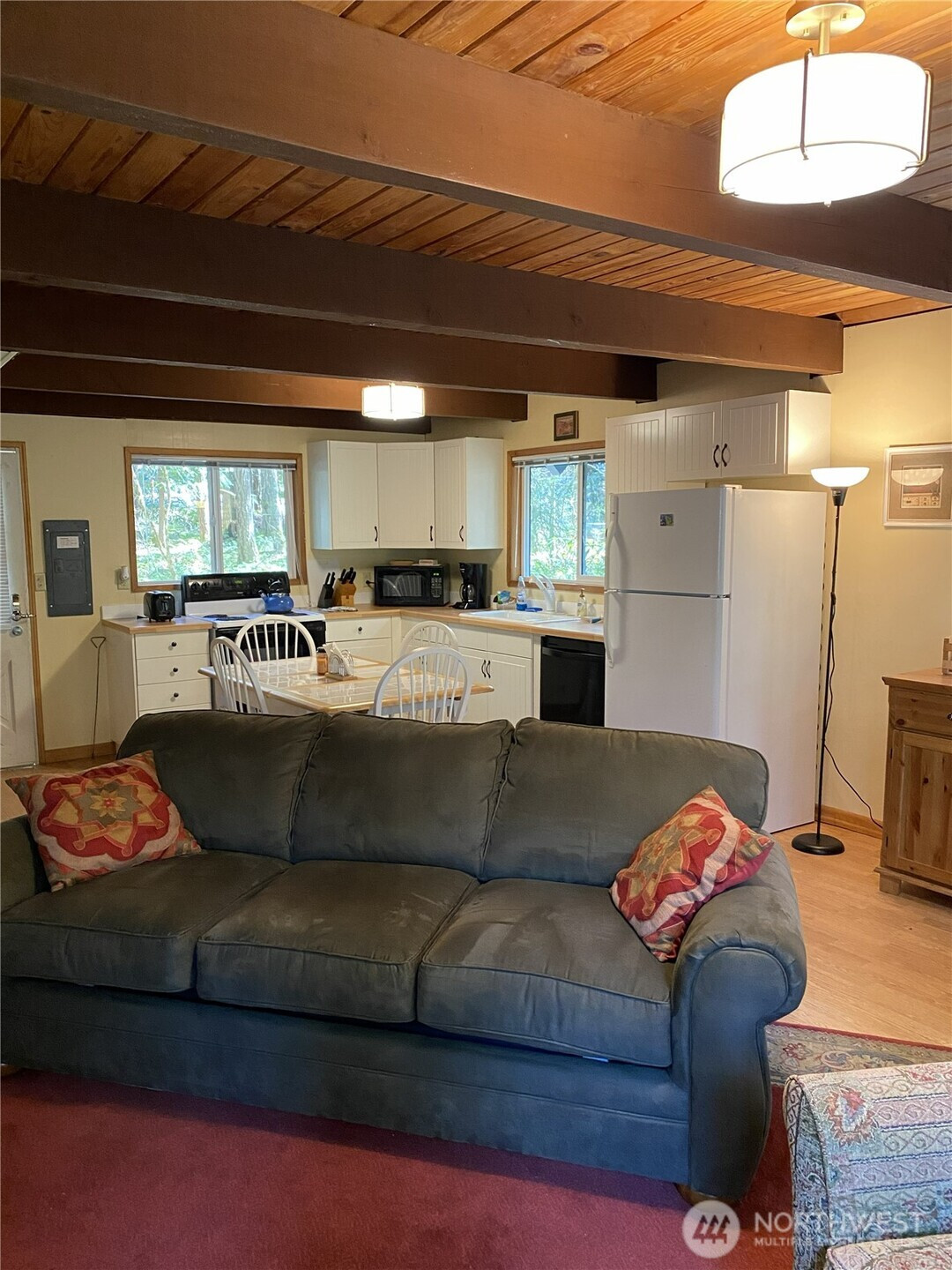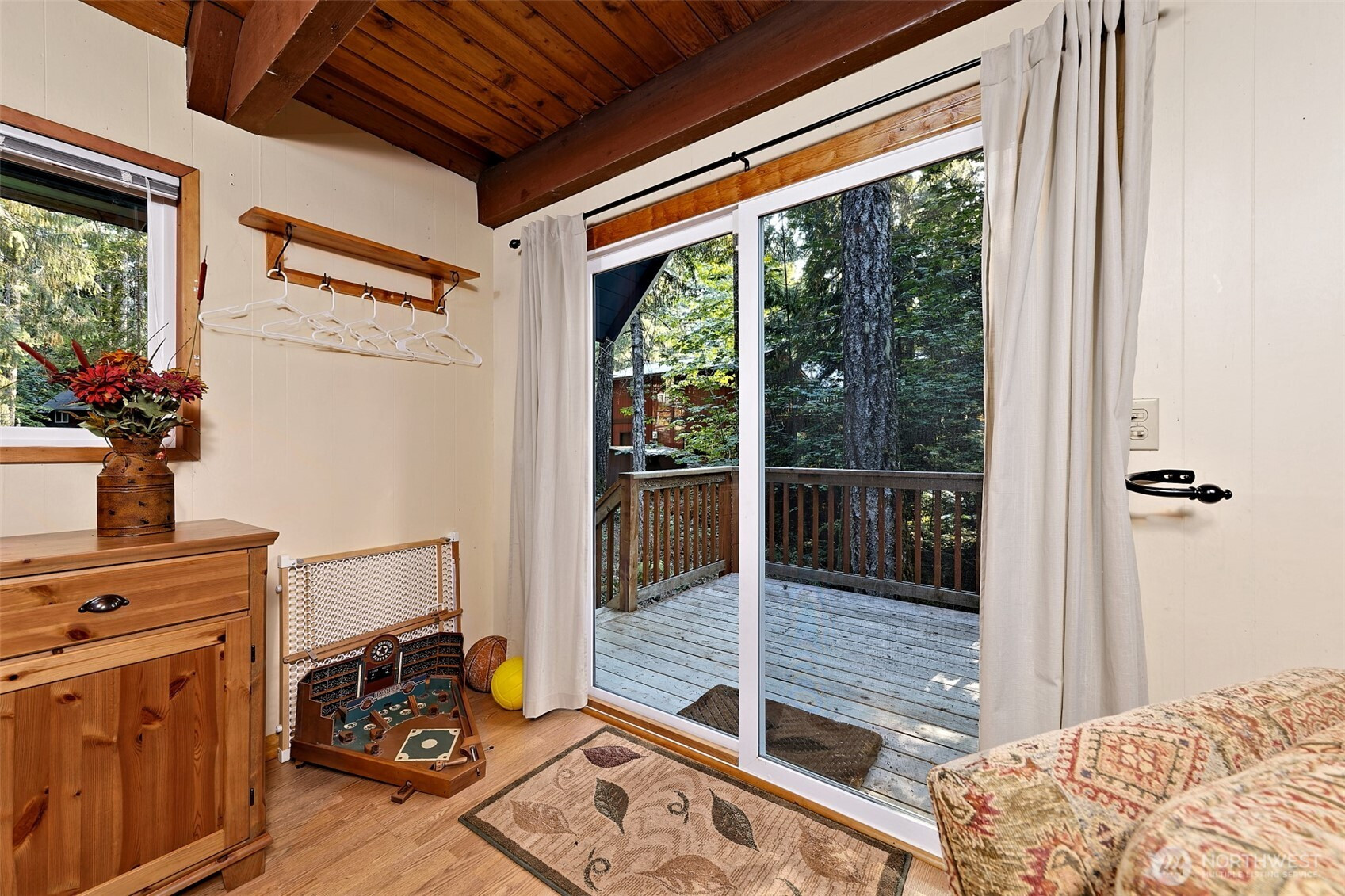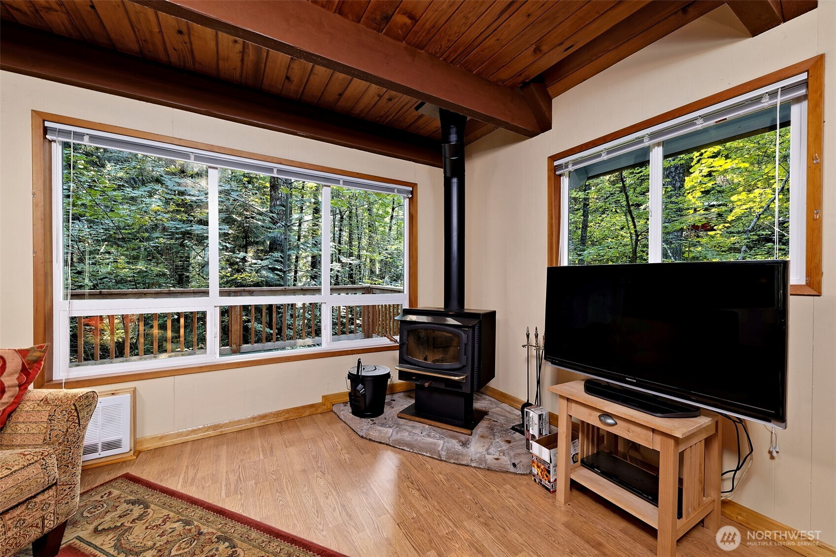 This property comes with an additional corner lot providing lots of space and privacy. Just steps away from Pioneer Village Division 1 Community Park-one of the nicest community parks on Lake Cushman with beach area, gazebo, restrooms, boat launch, dock, basketball court, volleyball court, and a playground area. Step into this PNW open concept cabin with ton and groove vaulted ceilings, laminate flooring, 3/4 bath, efficient kitchen, dining area and cozy living room with a free-standing woodstove. Sliding doors take you out to a large deck overlooking a greenbelt with a peekaboo view of the lake. Upstairs has a very large bedroom and 1/2 bath. Excellent opportunity to bring your dreams to fruition of waterfront fun without the waterfront taxes or for investment,full time, part time/recreational living.Every day is a vacation here!
