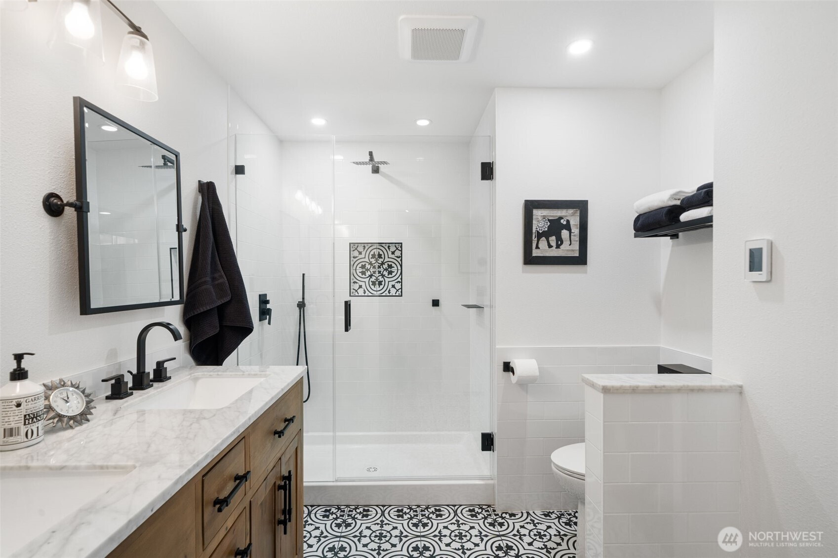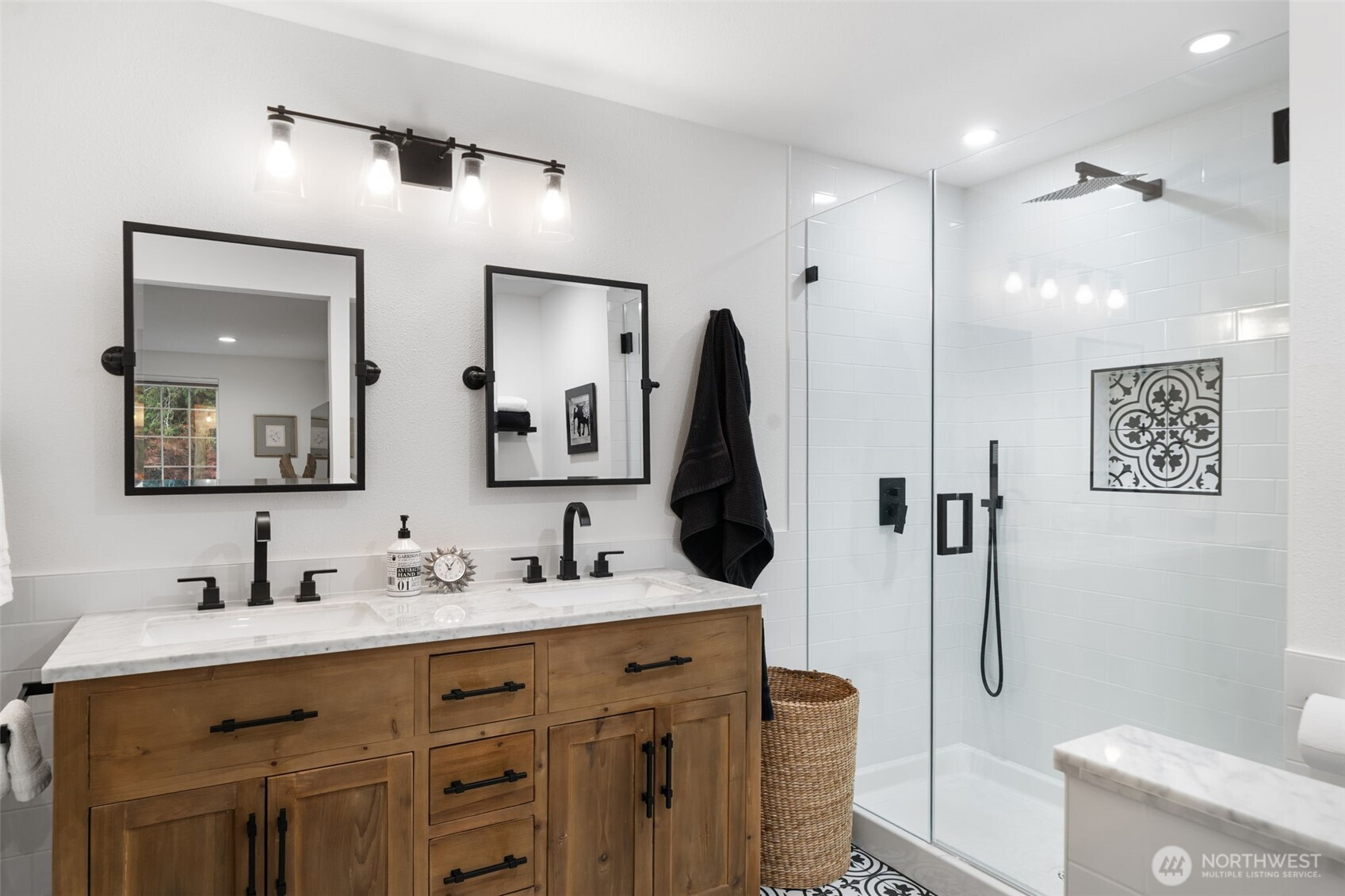 Here is a beautiful, single-level home in Lakeland Village! Located on an oversized, level lot with a one-car garage and rare RV parking, this 2-bed, 2-bath home is FULLY remodeled, top to bottom, and offers modern living with an open, well-designed floor plan. Features include a gorgeous kitchen with all-new LG appliances, engineered Acacia hardwood floors, and a stunning primary suite. All-new heating and cooling systems, new electrical service, and, for peace of mind, a 6-year-old roof. Whether it's morning or evening, you will LOVE relaxing out on the covered backyard deck. Enjoy Lakeland's private 50-acre spring-fed lake, 27-hole golf course, tennis, pickleball, and more. Close to the Allyn waterfront, dining and shops. Welcome home!