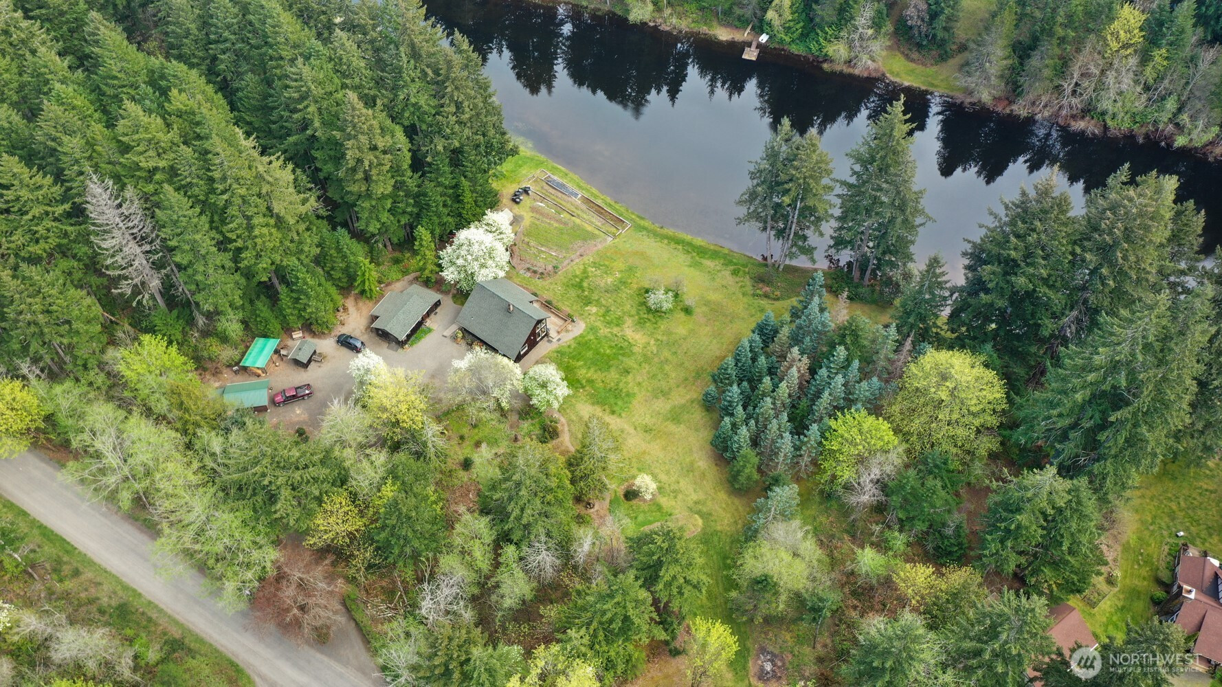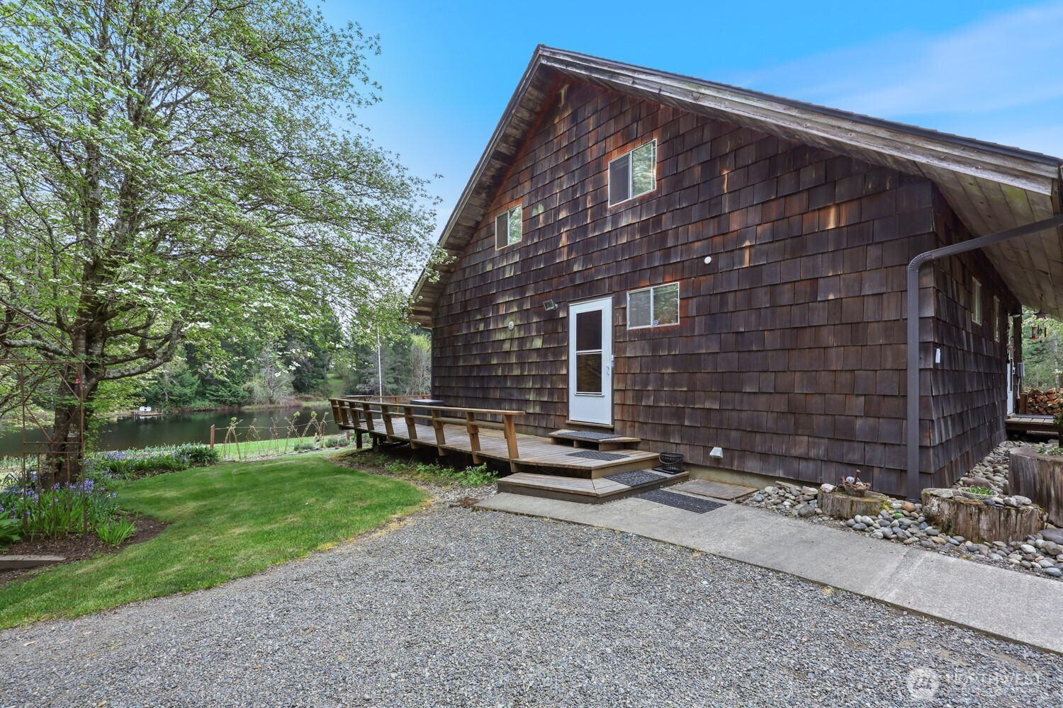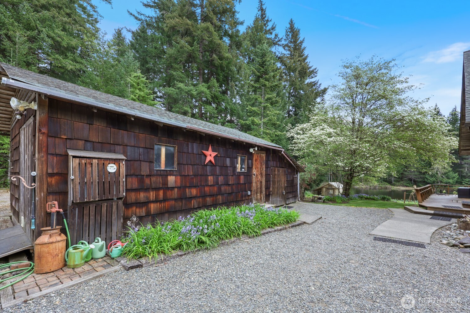Escape to your own quaint cabin-style home with 240 feet of private, no-bank lake frontage. Imagine kayaking, fishing, or simply soaking in the serene lake views. Set on just over 5.5 acres of generally flat, usable land, this property offers treed privacy on both sides and additional acreage across the street, perfect for a potential shop, outbuildings, or extra recreation space. A beautiful garden & greenhouse overlook the lake, creating a peaceful oasis for gardening enthusiasts. The home’s exterior features warm cedar planks & a large deck faces the lake, while several outbuildings provide ample storage. Main shop is 16x24. Inside, you’re greeted with rich cedar, fir & hemlock throughout, giving the cabin a cozy, inviting feel. The primary bedroom on the main floor & wood stove ensure comfort year-round. The kitchen opens to the deck, perfect for entertaining. Upstairs, you’ll find 2 cozy bedrooms & a loft space, ideal for guests or a reading nook. This unique property makes an excellent second home, vacation retreat, or private sanctuary, with a bounty of nearby recreation: Mason Lake, Hood Canal, hiking at Staircase, Lake Cushman, fishing, & diving near Potlatch—or simply enjoy your own lakefront paradise. Located within a small HOA with very few homes on Catfish Lake, this property feels like an escape while still being just 10 minutes from town. Don’t miss this rare opportunity to own a private lakefront cabin with character, privacy, & endless outdoor possibilities.