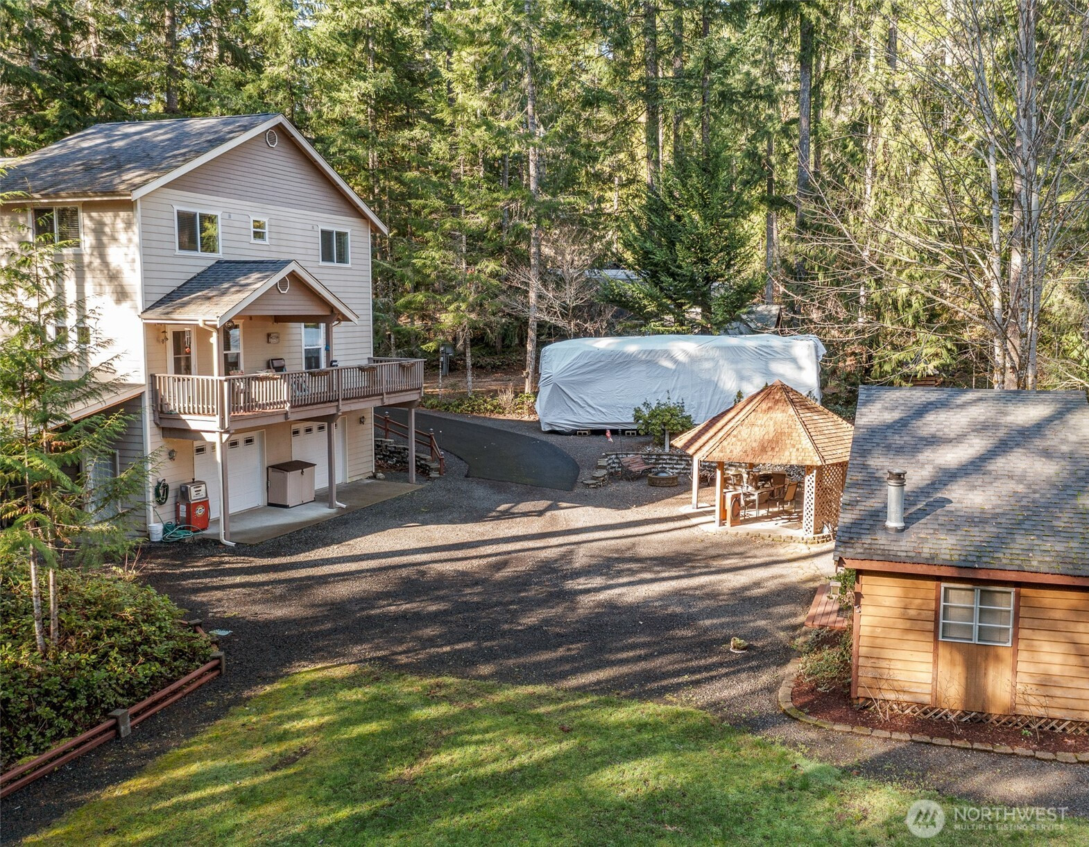 A rare offering at Lake Cushman — a custom-built lifestyle property designed for those who value craftsmanship, privacy, and exceptional garage and shop space.Tucked among mature evergreens and just a short walk to the Division 14 boat launch, this 2,800+ sq ft home blends Northwest lodge character with functional luxury. What appears modest from the road unfolds into a substantial custom retreat featuring vaulted ceilings, expansive windows, warm wood finishes, and an inviting open layout anchored by a cozy fireplace in the main living area.The main-level primary suite offers everyday comfort, while the upper level provides an oversized bedroom, dedicated office, and flexible loft space. Granite countertops, solid wood cabinetry, and generous prep areas highlight the kitchen’s quality and scale.The infrastructure sets this property apart. The attached 3-car garage includes a half bath and storage room — ideal for collectors or hobbyists. A detached shop and covered RV parking create rare versatility for boats, vehicles, or projects.The fully equipped guest house adds exceptional flexibility — ideal for extended stays, multi-generational living, or potential income-producing opportunities.Outdoors, enjoy a covered gazebo, firepit gathering space, and peaceful forest surroundings on nearly half an acre. This is more than a cabin —it’s a well-built compound designed for enthusiasts who want space, versatility, and proximity to the water without sacrificing privacy.