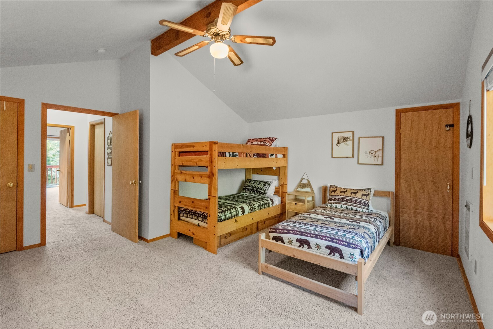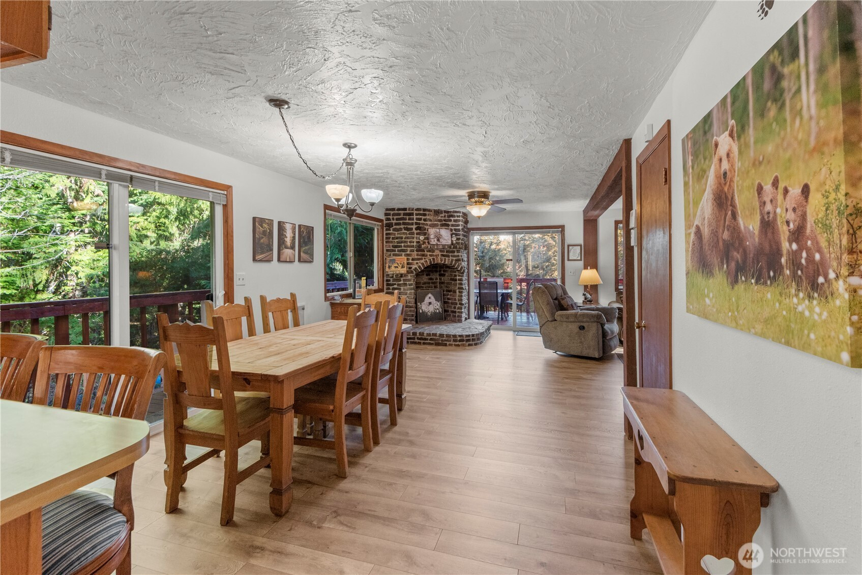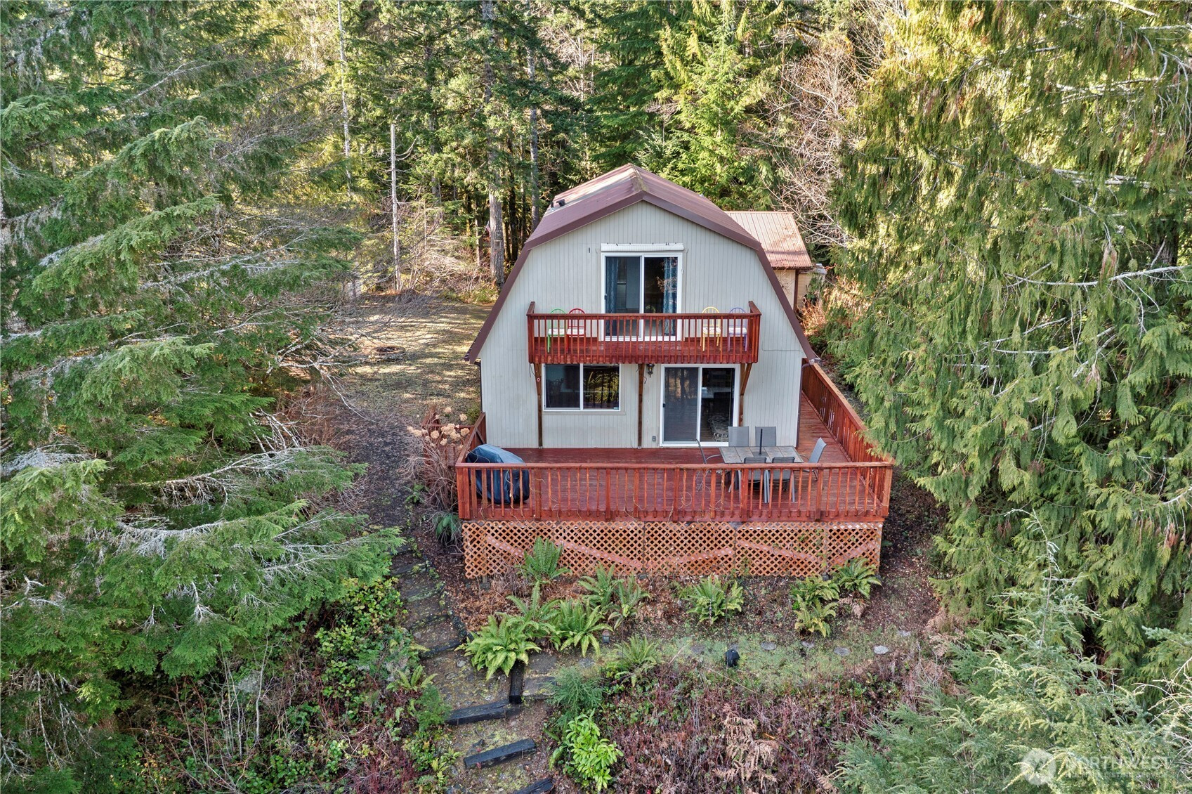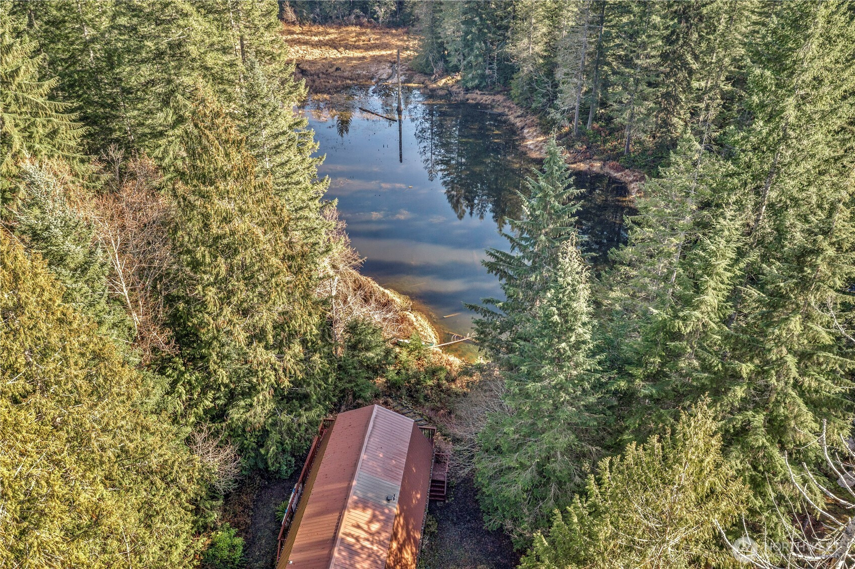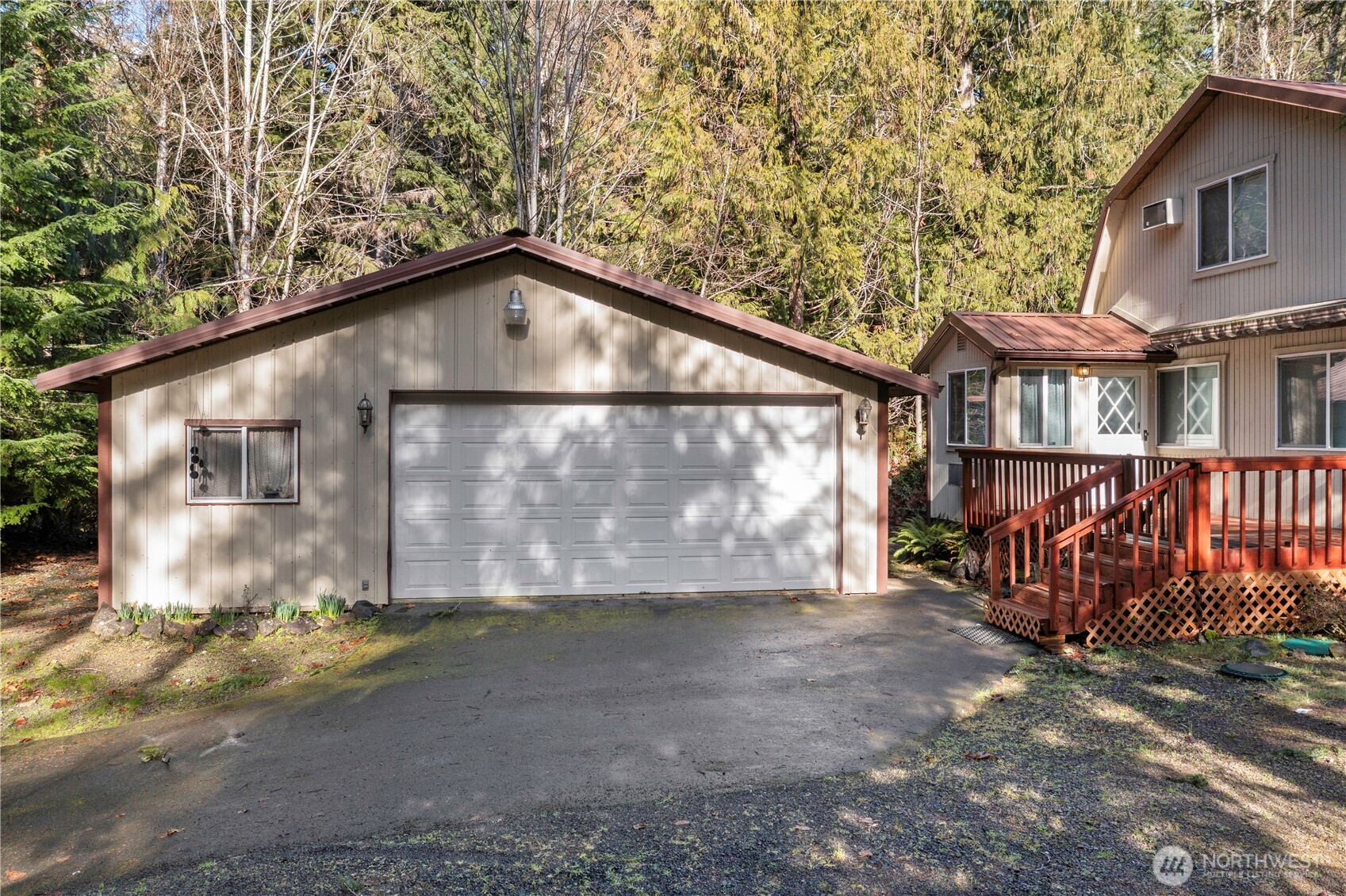 Nestled among the trees on a rare oversized .61-acre parcel, this Mt. Rose Village retreat offers exceptional privacy and peaceful views overlooking one of Lake Cushman’s secluded ponds — a unique feature rarely found in the community. The property is bordered by community greenspace, preserving the tranquil surroundings and sense of space. Inside, the home is designed for comfort and connection. The spacious kitchen features a breakfast nook and separate dining area, flowing seamlessly into the main living space — ideal for everyday living or entertaining. Large windows bring in natural light and frame serene forest and pond views. Outdoor living shines with an expansive wraparound deck, perfect for relaxing and enjoying the peaceful setting, accentuated by the soothing sound of flowing water below. The main level offers a spacious bedroom and full bathroom, while upstairs features two oversized rooms and a 3/4 bath, providing flexible space for guests, hobbies, or work-from-home needs - complete with high-speed fiber internet. A paved driveway offers ample parking, including a lower RV area with water and 50-amp power, plus a permitted RV septic holding system ready for installation. The detached garage fits up to three vehicles and includes a workshop and large storage loft. Currently operating as a successful Airbnb, this property offers both a peaceful retreat and strong investment potential — just a short walk to the Cushman Div 3 park, boat launches, and recreation.