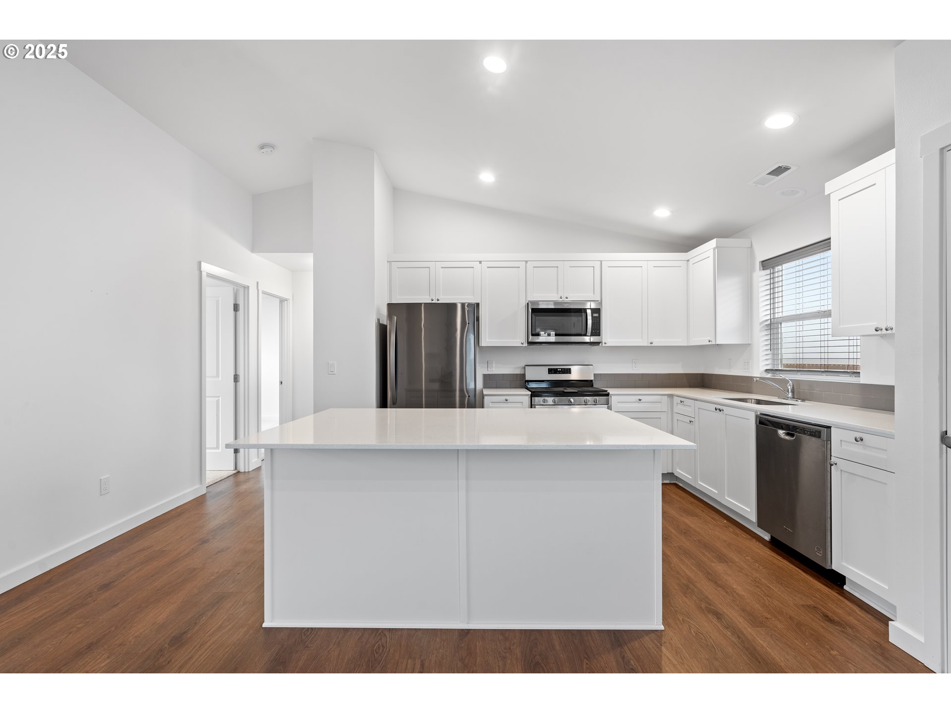 Move-in ready home in the desirable River Ridge Estates! Better than new, this energy-star certified home includes everything you need to move in, including Refrigerator. This single-level home offers 1,580 sq. ft. of living space with 4 bedrooms and 2 bathrooms. Enjoy a spacious open-concept layout with vaulted ceilings, LVP flooring, quartz countertops. Experience a split floor plan with a large primary bedroom with ensuite bathroom featuring a dual sink vanity and walk in closet. On the other side of the house, find the remaining 3 bedrooms, second bathroom, and laundry room with washer and dryer included. The 2-car garage includes a remote opener, and an EV charger. Outside, enjoy low-maintenance, established landscaping in the front and the fully fenced and landscaped backyard that's ready to be enjoyed.