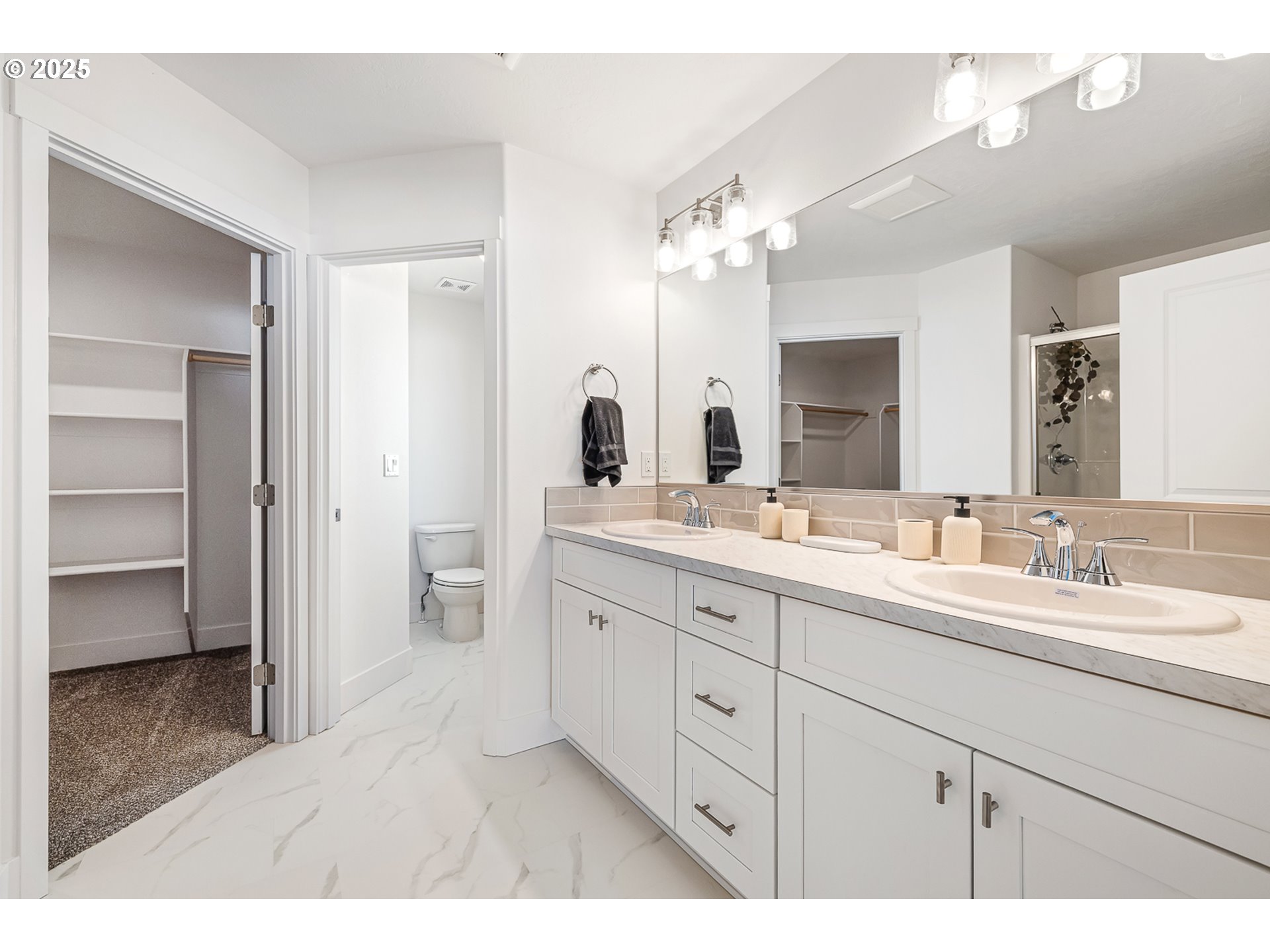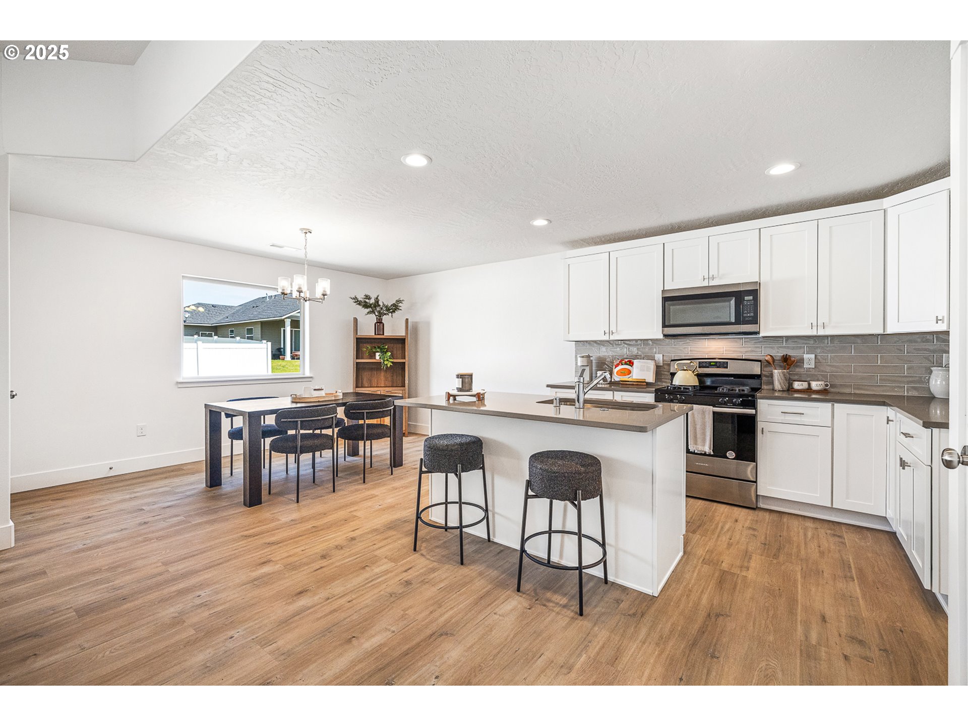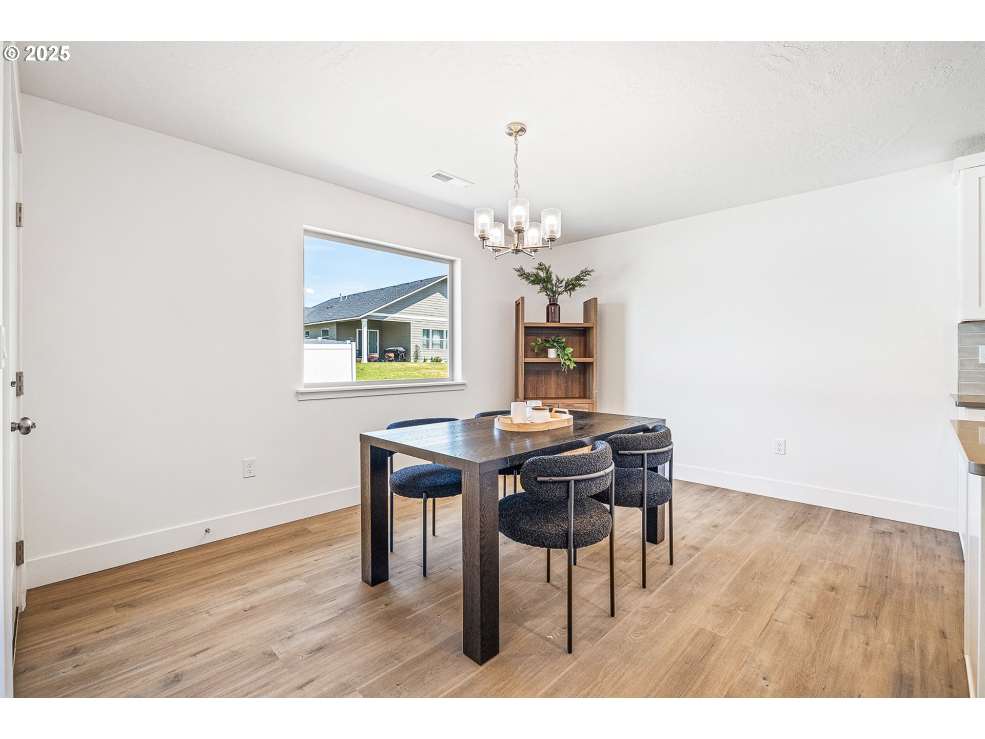 Airy open space in this floor plan! It seamlessly connects the kitchen and great room, while maintaining a warm ambiance in the dining area for memorable gatherings. The kitchen offers an L-shaped layout, offering ample counter space, a convenient island, and a discreetly tucked pantry with custom wooden shelving.The entry hallway provides extra storage with a coat closet and linen closet. Retreat to the primary suite at the opposite end of the home, featuring a spacious walk-in closet and a luxurious bathroom. Two additional bedrooms share a tub and shower combo bathroom on the opposite wing.