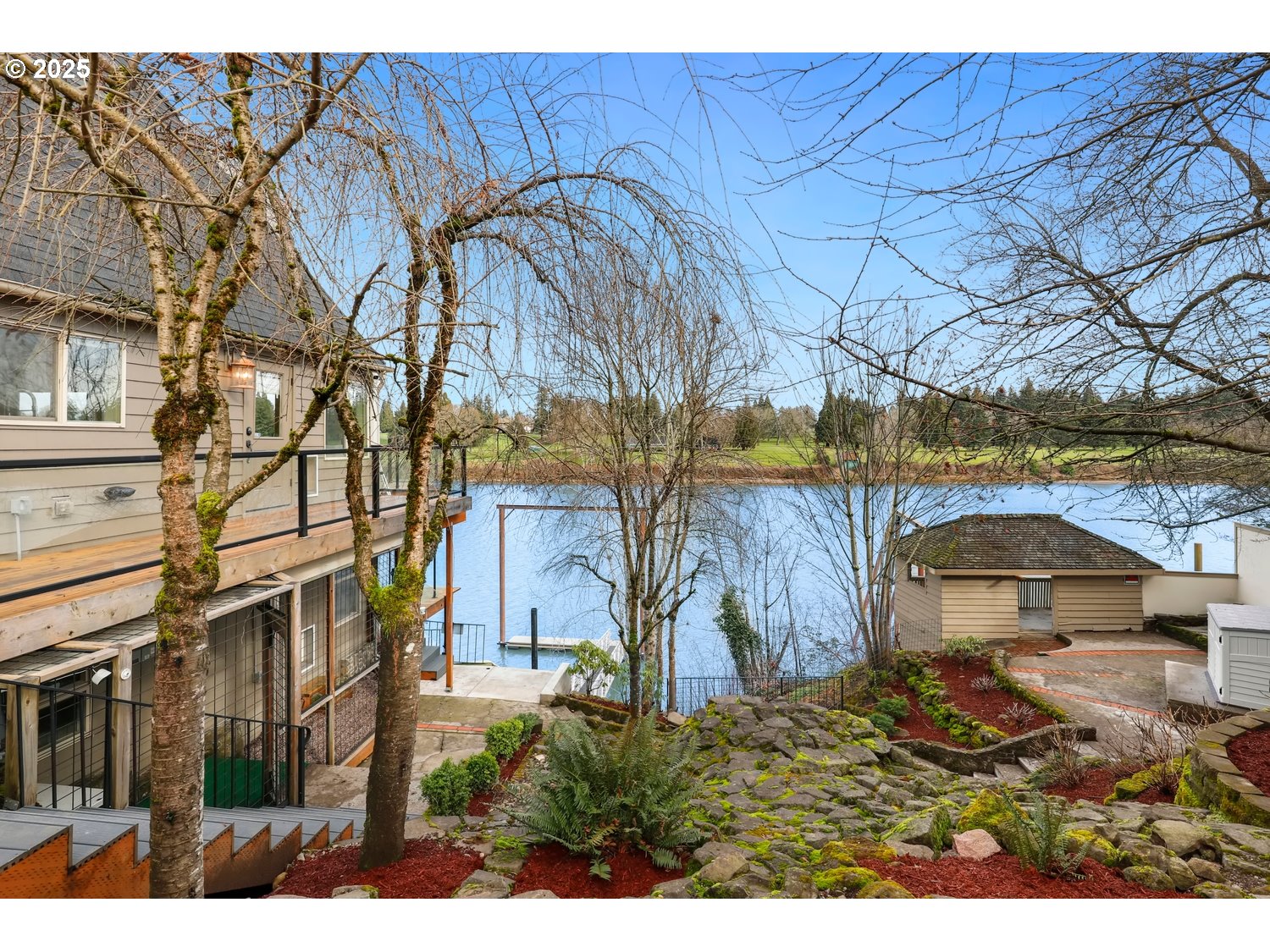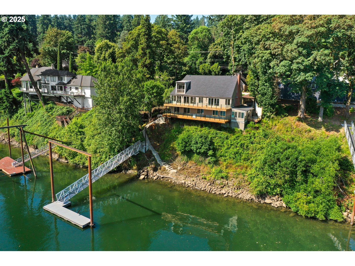 (503) 893-8874This gated Willamette Riverfront retreat offers exceptional privacy and panoramic views throughout. Inside, enjoy soaring ceilings, gleaming hardwoods, quartz countertops and a flexible lower level with potential for a fourth bedroom. The dramatic loft features a wet bar and an outdoor balcony—ideal for entertaining. Listen to the year-round waterfall as you walk down the steps that lead to a new gangway and private boat dock. Wake up to stunning sunrises and unobstructed views of the Waverley Country Club golf course and the river below. Every room offers a front-row seat to the Christmas ships, Fourth of July fireworks, sea lions, eagles, and more—visible through a dramatic wall of river-facing windows or from the many expansive decks. A large carport with stair access leads to 444 square feet of attic space with high ceilings, offering excellent expansion potential. Located in the prestigious Dunthorpe neighborhood. Plus, the seasonal Historic Willamette Shore Trolley is able pick you up at your front door, allowing easy access to downtown Lake Oswego or a scenic ride to Portland’s SW Waterfront.