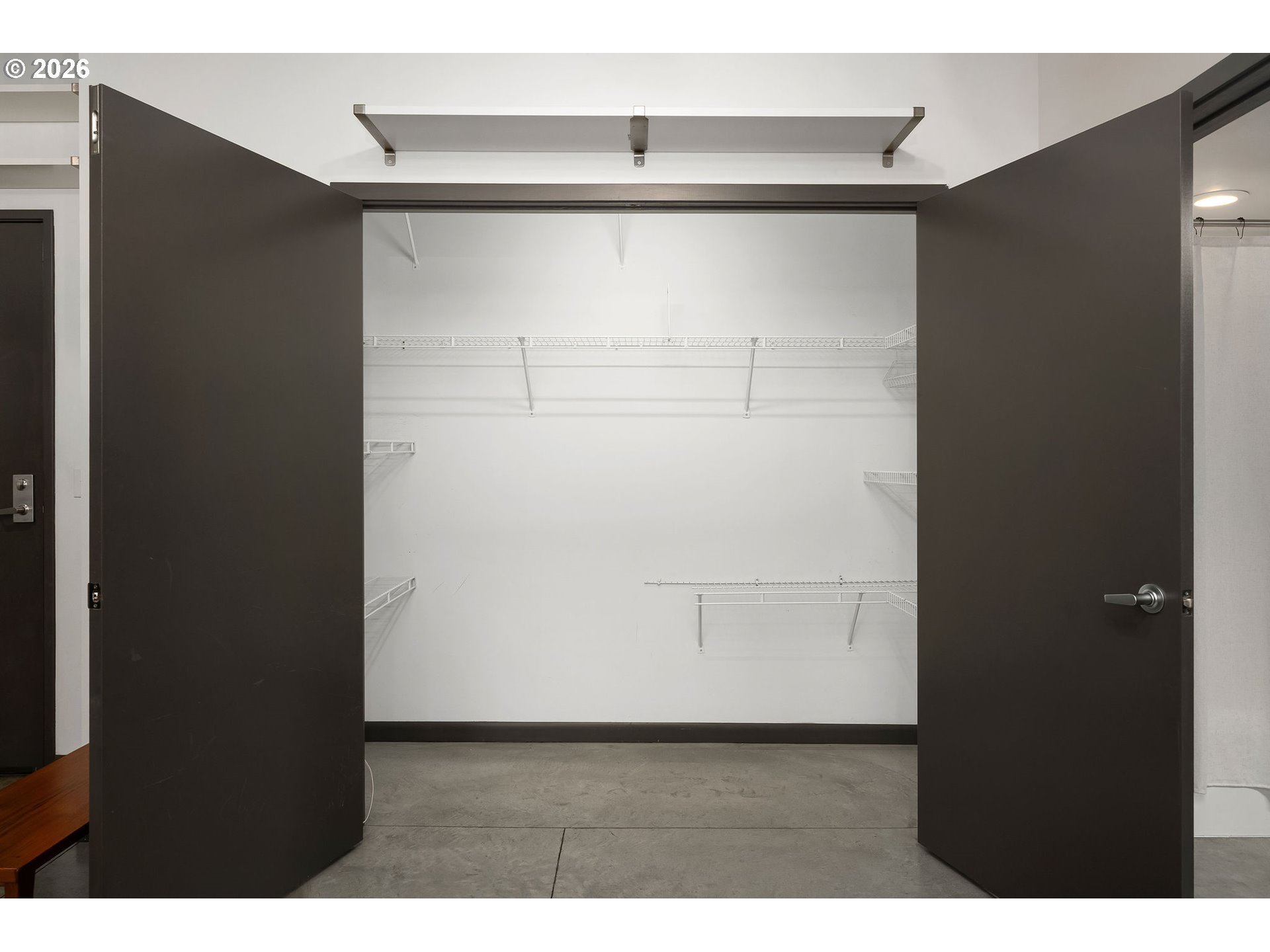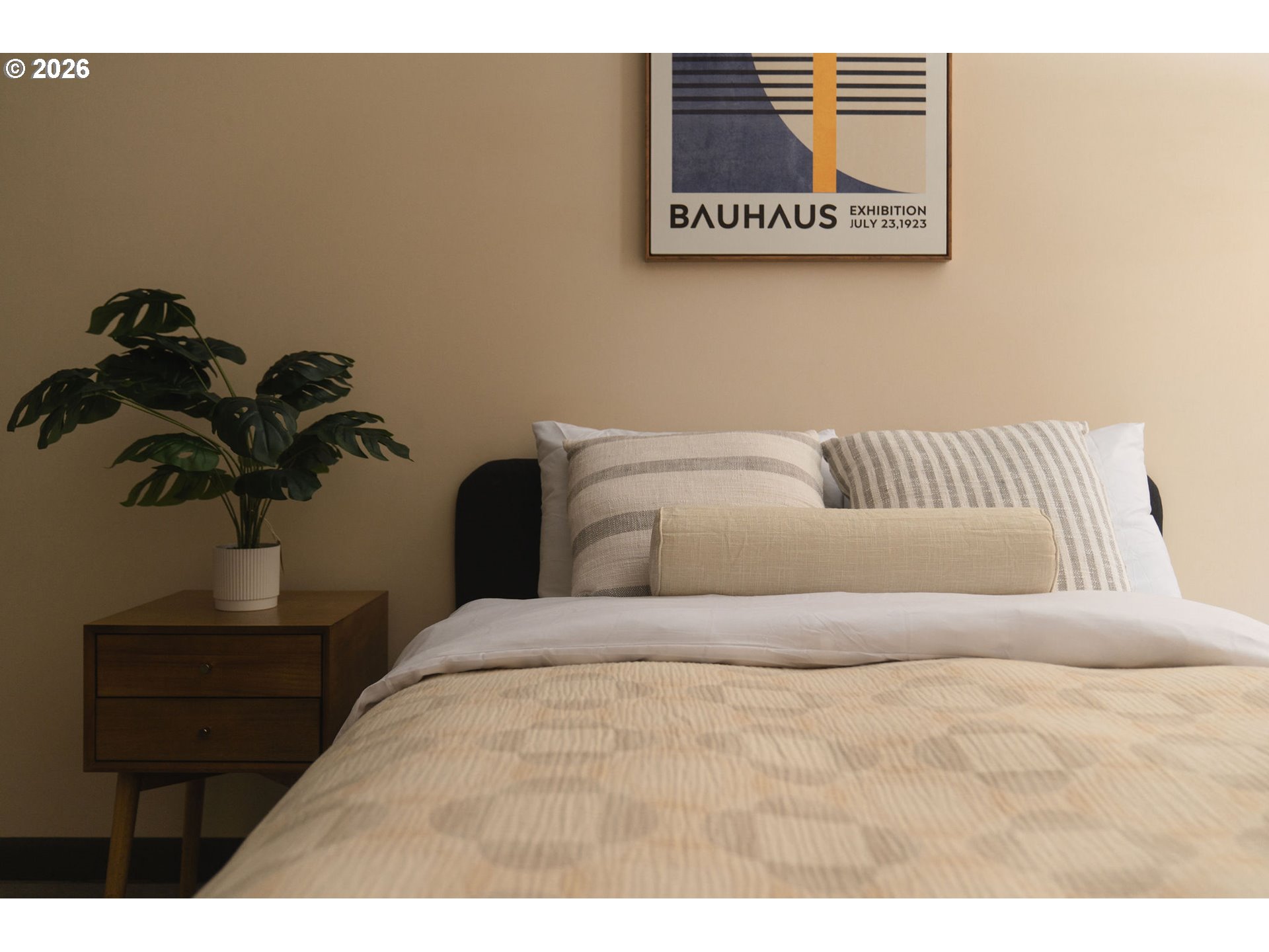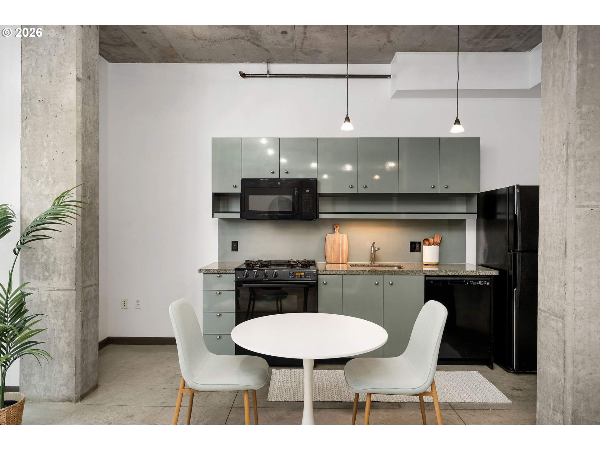Streetcar Lofts no. 415. A refined pied-à -terre with an open, west-facing living space framed by 10-foot French doors and floor-to-ceiling windows. Enjoy sunsets with peekaboo views of Portland’s West Hills. Below, the landscaped courtyard is a certified wildlife habitat, a quiet green counterpoint to the city. The fitness studio overlooks NW Lovejoy, grounding your daily routine in the rhythm of the neighborhood. Deeded parking and generous storage add rare convenience. With a 99 Walk Score, cafés, galleries, parks, and the streetcar are just outside your door.