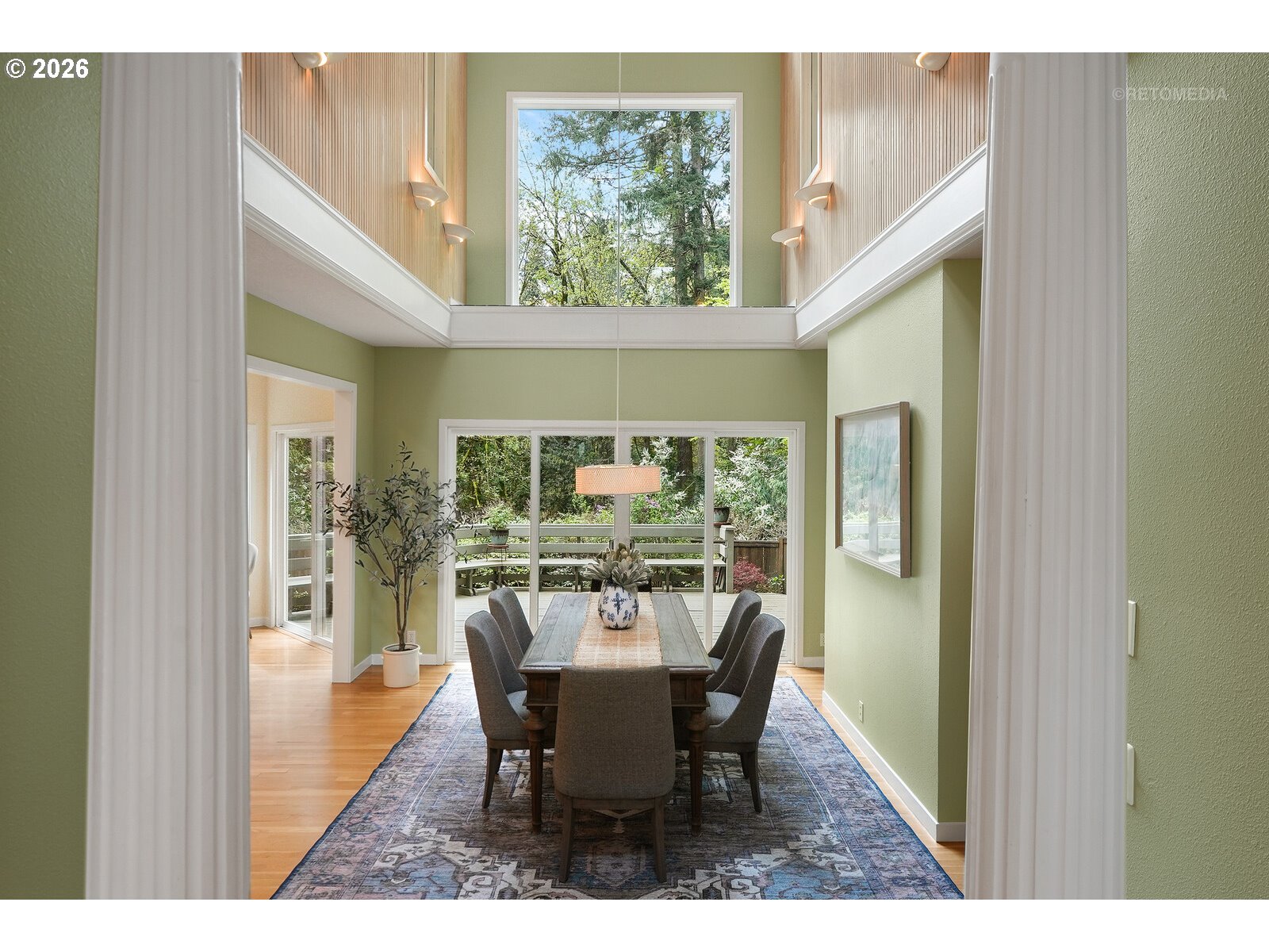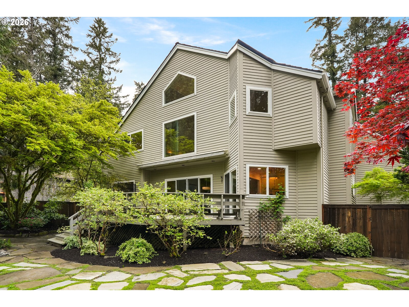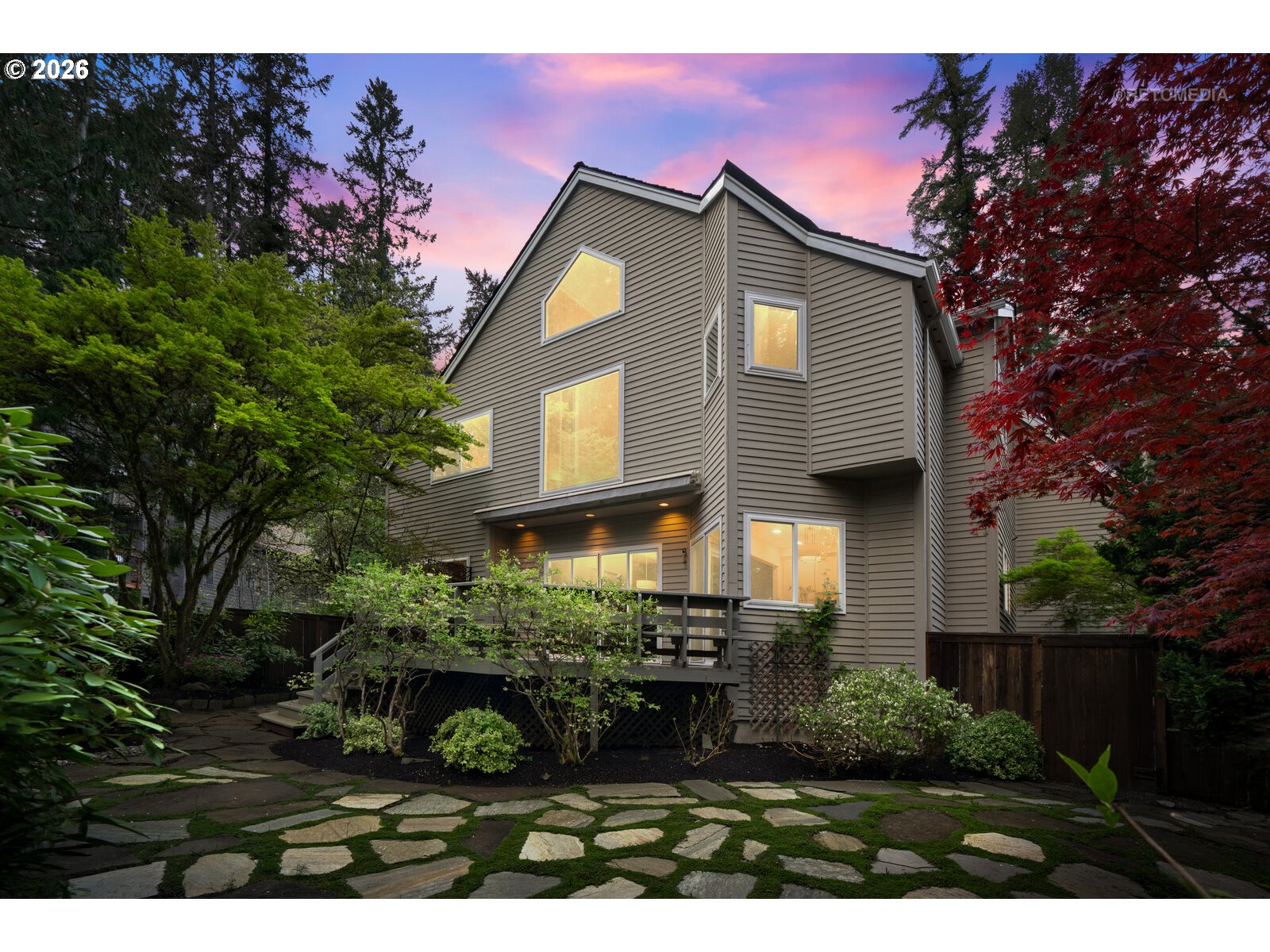 STOP scrolling—this is the Portland lifestyle everyone’s chasing.A blend of nature, character, and convenience, this home captures the essence of PNW living. Tucked on a tree-lined street w/serene views, it offers privacy while staying connected to downtown. Inside, high ceilings, hardwood floors, and clerestory windows fill the home w/natural light and views of nature. Updated kitchen features quartz countertops, SS appls and seamless indoor-outdoor flow. A living room w/FP, library/music room w/built-ins, and dramatic two-story ceiling dining room create a unique floor plan.The primary suite is a private retreat w/FP, spa-like bath, and walk-in closet. Bonus room/4th bedroom adds flexibility. Enjoy the entertaining size deck, flagstone patio, and fenced yard backing to lush greenspace. Across from neighborhood park w/pond, near trails/parks, and minutes to OHSU, Lewis & Clark, and downtown. More than a home—it’s a lifestyle. You’ve been warned—don’t wait to see it! [Home Energy Score = 1. HES Report at https://rpt.greenbuildingregistry.com/hes/OR10246647]