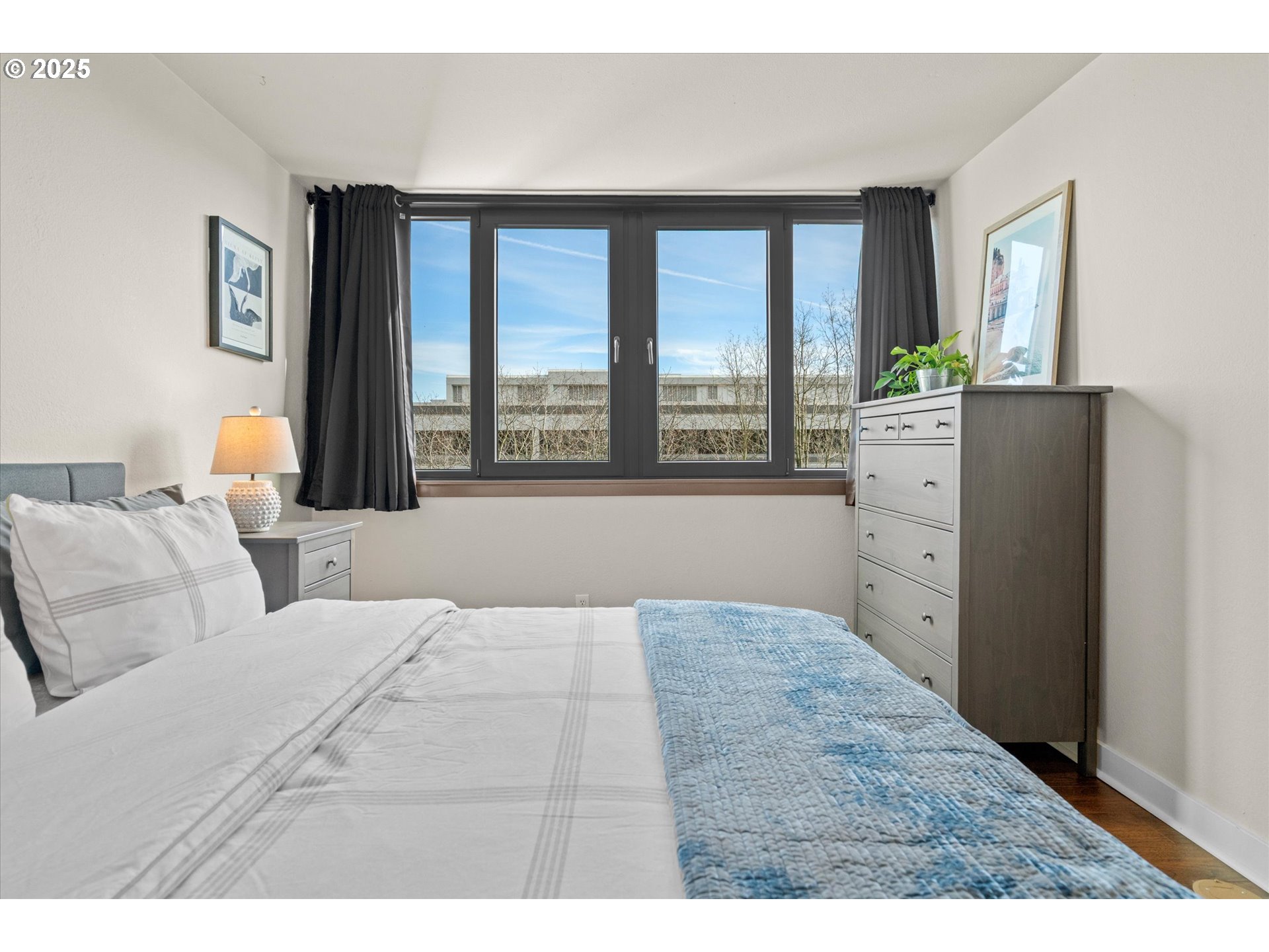 Open Sunday 12-2pm! Light and bright one bedroom corner unit with a view! Welcome to downtown Portland's beautiful Harrison East Building. Steeped in Mid-Century architecture this building offers affordable living in a quiet corner of SW Portland. It's move-in ready with all furniture included. The "F" units are a popular layout with more than 700 square set on the corner of the building. Living is comfortable with a large open living space that flows outside to the deck. Looking North East you will take in territorial views including the Willamette river and bridges. Updates include beautiful LVT flooring through-out the home, stainless steel appliance, updated light fixtures, neutral paint colors, and granite counter-tops. This unit comes with a storage locker and large deeded parking space. The Harrison building complex boasts free shared laundry, secure entry, beautiful grounds, and a shared sauna and pool! Enjoy downtown living at its best. Walk to local parks, restaurants, cafes, the river, shopping, and local entertainment. Your commute will be a breeze with the street car just outside your door!