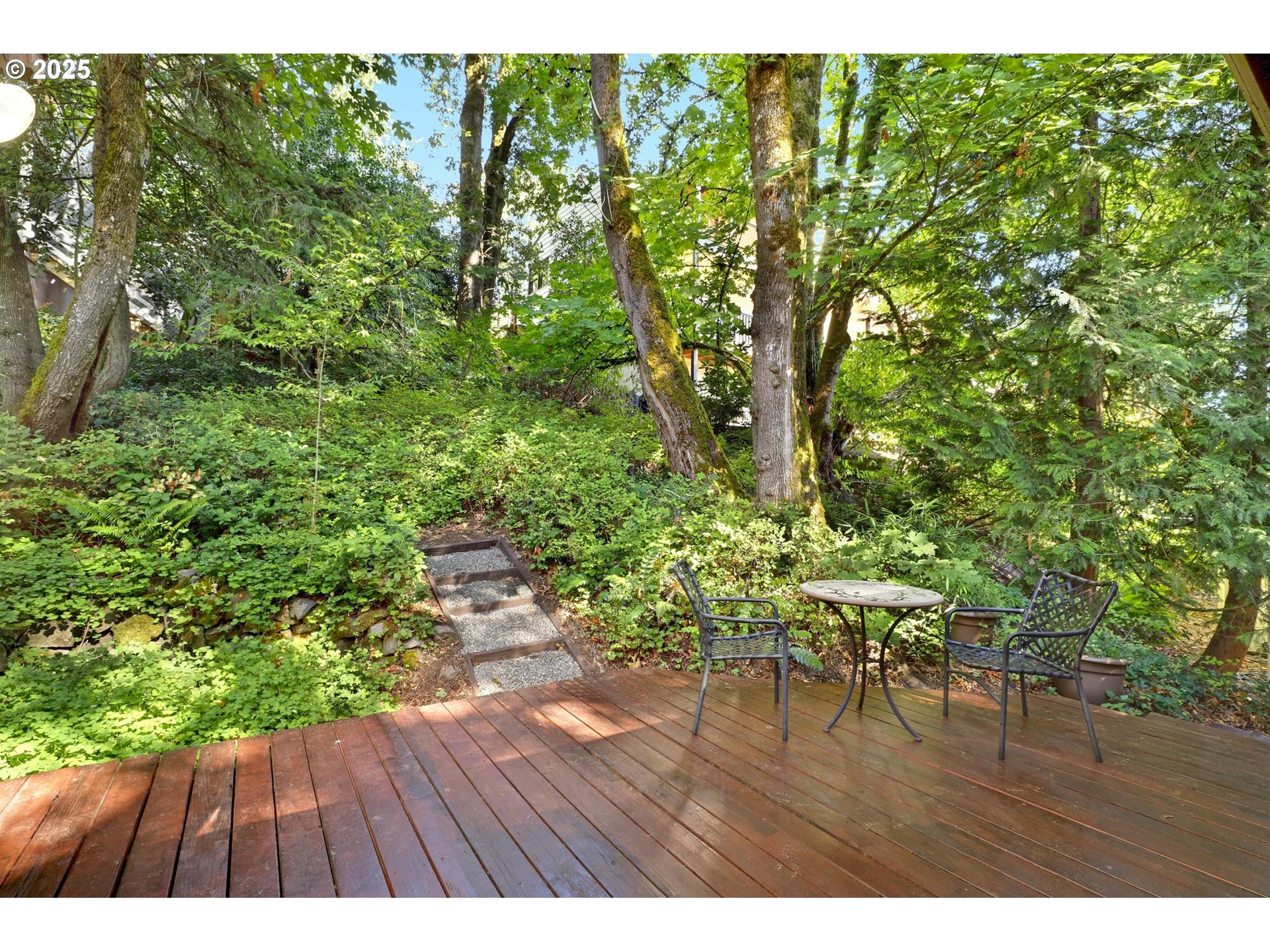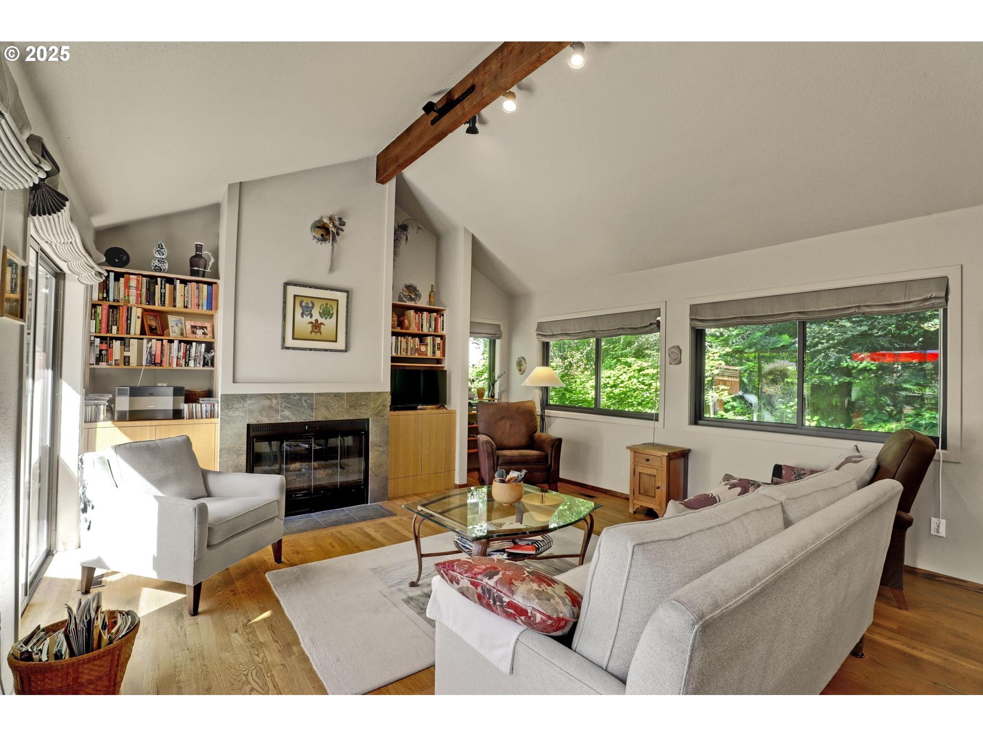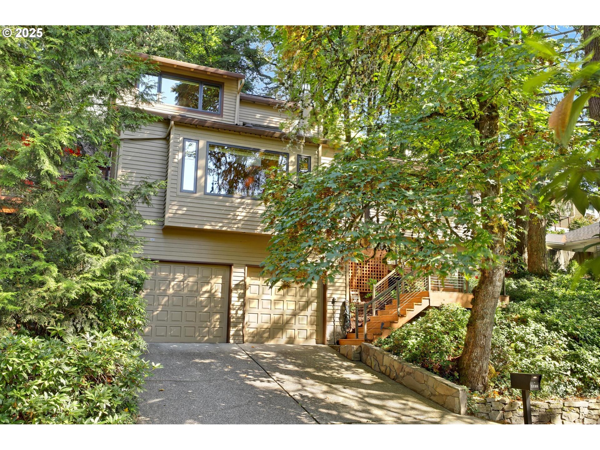 Open 11/9 from 2-4pm. John Storrs inspired NW Contemporary in the heart of the West Hills, perfectly situated between the Hillsdale shopping area and Farmer's Market, OHSU and the SW Trails. Filled with warm wood accents and soaring ceilings, and with walls of windows that bring the outside in, this home represents everything that the Pacific NW has to offer. The airy and open living and dining space is the heart of the home and has stunning vaulted ceilings, and sliding doors out to a sunny deck with forest views. Built to accommodate both elegant and casual entertaining, the kitchen features a Great Room, complete with vaulted ceilings, a wall of glass doors and a wood burning fireplace. The kitchen is a host's delight, with granite countertops, thoughtful storage, copious bamboo cabinets, double ovens, 5 burner cooktop and a breakfast bar. The primary suite features stunning South facing views of the forest with 2 walk-in closets, skylights and a special "port window" in the bath. There is a separate entrance to the guest suite, which features vintage knotty pine paneling in both the bedroom and bathroom. The two-car garage has plenty of space for vehicles and additional storage. [Home Energy Score = 1. HES Report at https://rpt.greenbuildingregistry.com/hes/OR10242008]