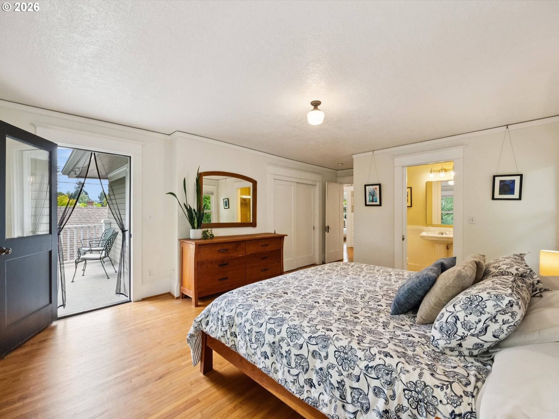 Irvington Opportunity: This early 20th-century American Foursquare offers over 3,200 sq. ft. of timeless character and modern updates in one of Portland’s most sought-after neighborhoods. A gracious formal entry opens to elegant living and dining rooms with bi-fold French doors, hardwood floors, and a fireplace enhanced by contemporary sconces. The spacious kitchen features a large island, gas cooktop, new double ovens, and stainless appliances. Upstairs, four bedrooms and two full baths include a primary ensuite with private balcony. Flexible family room (or 5th bedroom) on the main with private patio, plus a generous basement with exterior access. Double-pane windows, new water main, new sewer, new 200-amp electrical panel, PEX plumbing, upgraded insulation, and a rare two-car garage complete this exceptional home. Less than a block to Irvington Elem covered-playground and field. Room to roam and play, inside and out! [Home Energy Score = 1. HES Report at https://rpt.greenbuildingregistry.com/hes/OR10241612]