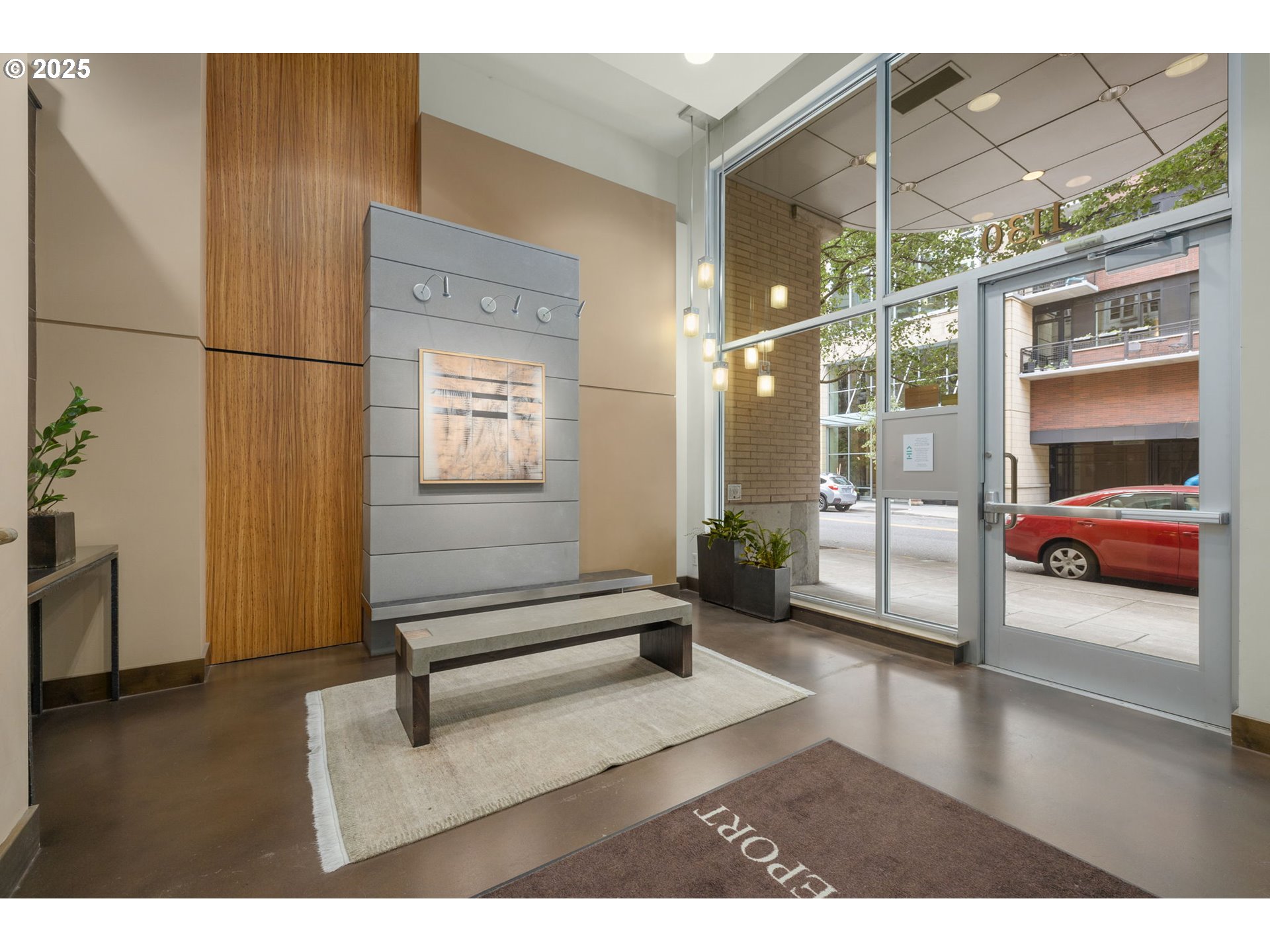 Light-filled One-Bedroom + Den at Bridgeport Condominiums. Elevated above the urban setting, this residence offers soaring ceilings and a thoughtfully designed floor plan optimized for flow. Refined upgrades include maple hardwood floors, recessed lighting and a suite of new stainless steel appliances—refrigerator, gas range, and washer/dryer. The enclosed den, framed by a sleek barn door, flexes easily between a private office or guest retreat. The main living area is anchored by a cozy gas fireplace and complemented by a Juliet balcony with French doors. A generous dining area comfortably accommodates a large table, perfect for gatherings. The tranquil primary bedroom offers privacy and a spacious walk-in closet with a custom organizer system. Added conveniences include a deeded parking space and a storage unit. Located in the heart of the North Pearl, Bridgeport residents enjoy proximity to Tanner Springs Park and The Fields Park, with shops, groceries, theaters, live music and great dining. The Portland Streetcar runs adjacent, connecting you seamlessly to the city.