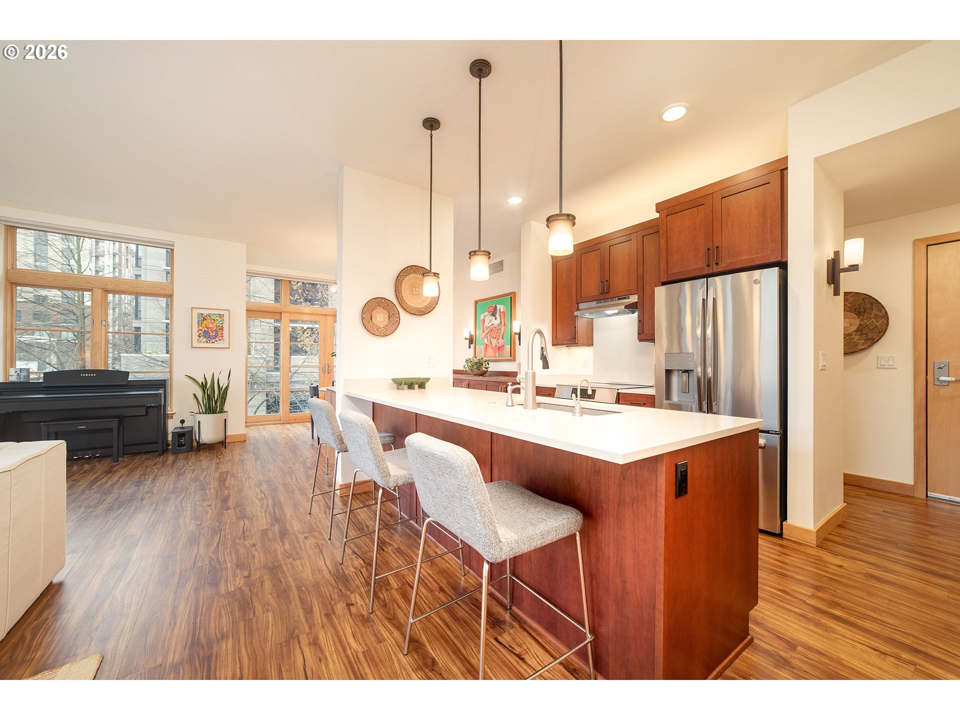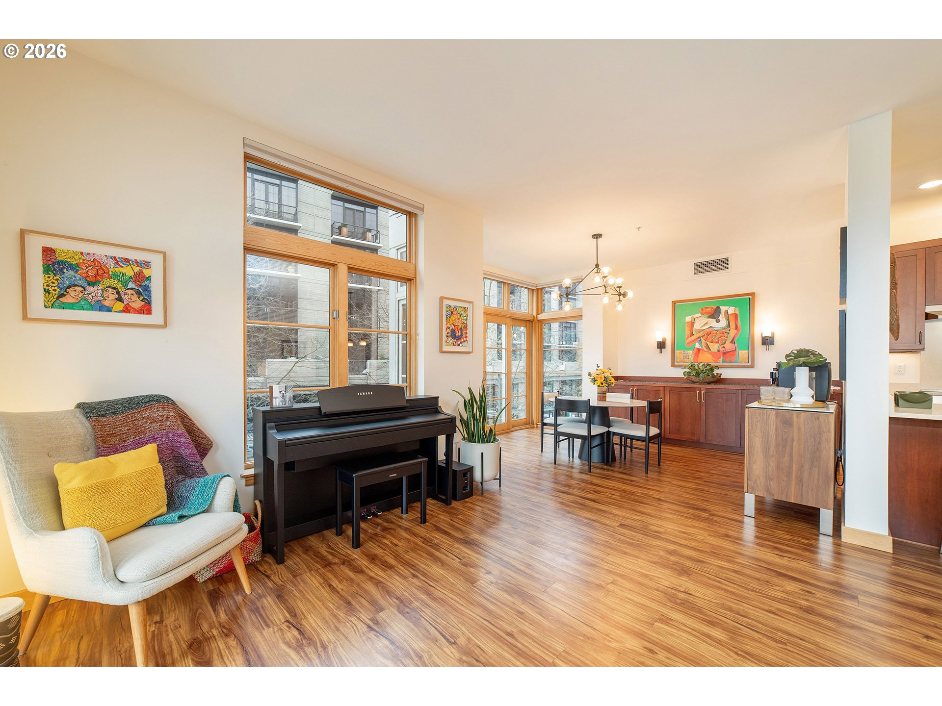 (503) 893-8874Light-filled and beautifully designed, this southeast corner residence sits in the heart of Portland’s vibrant Pearl District, with exceptional shopping and dining just moments away. Expansive floor-to-ceiling windows frame captivating views of Tanner Springs Park, creating a serene backdrop to everyday living. The open living area features sliding double doors that lead to a generous wraparound deck—seamlessly extending the living space and bringing the best of Portland’s lush, urban landscape right to your doorstep. Perfect for both quiet mornings and effortless entertaining. A cozy gas fireplace and new automatic blinds add comfort and convenience. The kitchen is thoughtfully updated with quartz countertops, a new Bosch gas range, and a Miele dishwasher. The spacious primary suite offers a walk-in closet, built-ins, and a well-appointed en suite bath. A second bedroom also includes a walk-in closet, providing flexibility and ample storage. Additional highlights include a new HVAC system (2025), deeded parking, and a dedicated storage unit. A truly special home in one of Portland’s most sought-after neighborhoods.