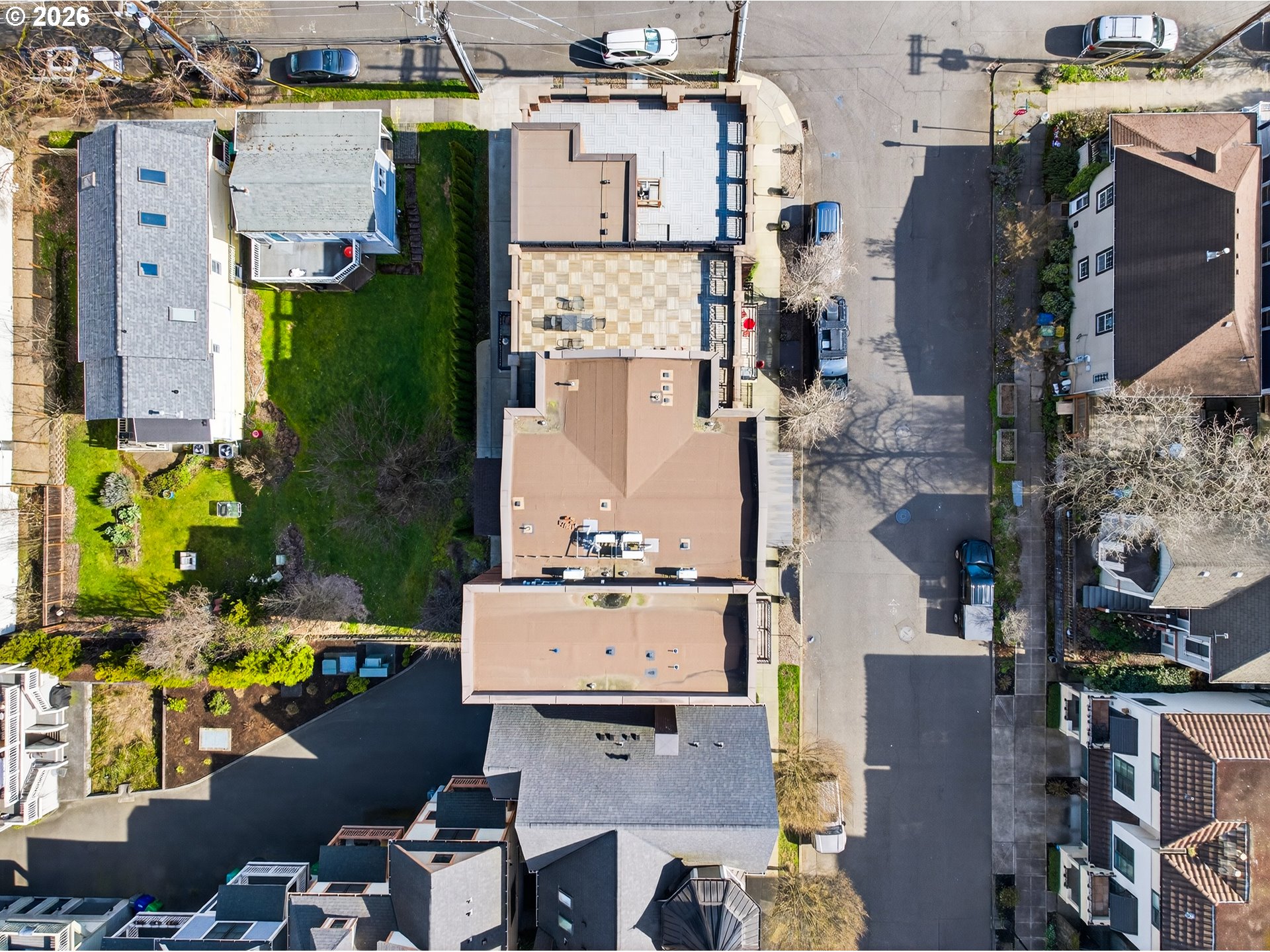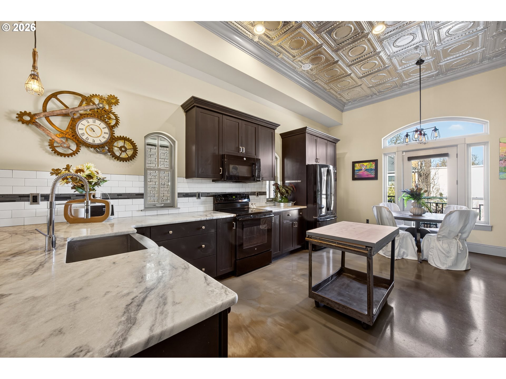 Modern three-level Portland townhome offering distinctive architectural details and a prime location in the desirable Lair Hill neighborhood near OHSU, South Waterfront, and downtown Portland. This well-designed residence features a welcoming covered front porch entry and an open main level highlighted by dramatic vaulted tin ceilings, exposed brick accents, and durable sealed concrete flooring that create a warm yet contemporary urban feel. The kitchen blends character and function with Carrera marble countertops, a farmhouse sink, black GE appliance package, reclaimed barn wood wrapped peninsula, custom lighting, and generous space for cooking and gathering. The thoughtful floor plan provides excellent flexibility with three private en-suite bedrooms, each featuring built-in closets, transom windows, and individual heating and cooling controls for personalized comfort. A fourth bedroom or office offers additional versatility for guests, work-from-home space, or creative use. Infrastructure and convenience are equally impressive with Cat-5 and cable wiring to every room, dual instant hot water heaters, a stacked washer and dryer, ADT security system, and digital entry with Ring camera. The upper level opens to a private balcony ideal for enjoying fresh air and neighborhood views, while the street-level entry provides the feel of a traditional townhome rarely found in condo-style living. Additional highlights include two deeded parking spaces and a separate locked storage area for bikes, gear, or seasonal items. Ideally positioned with quick access to OHSU, the South Waterfront district, riverfront trails, public transit, parks, dining, and downtown employers, this property offers a unique opportunity to enjoy refined urban living in one of Portland’s most connected and historic neighborhoods.