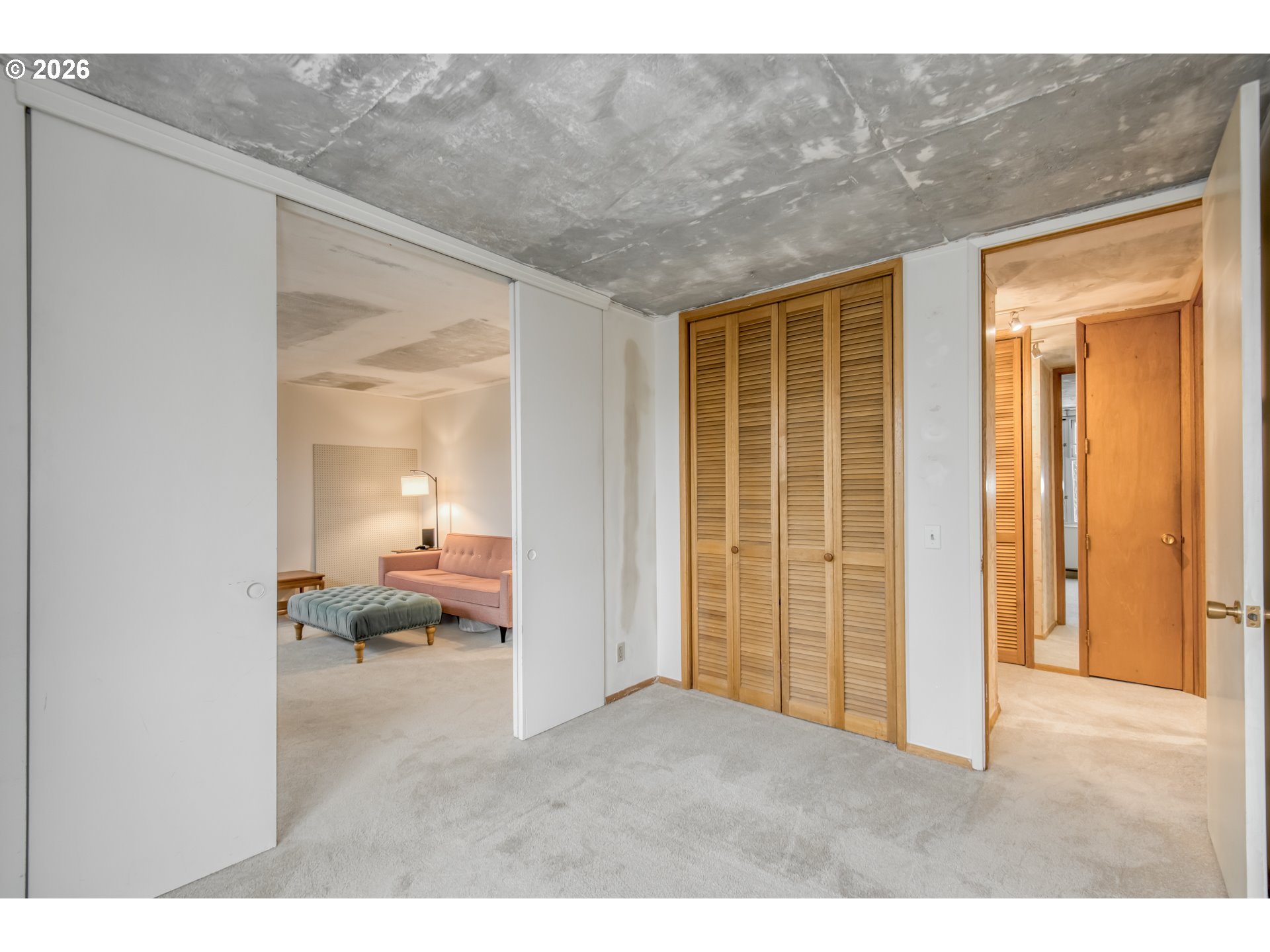 Experience mid-century charm at The Fontaine, ideally located steps from movies, restaurants, and local coffee shops. This bright and inviting condo offers two bedrooms and one bath, a light-filled living room, and a kitchen with granite countertops and air conditioning. The second bedroom, with a sliding door to the living area, makes a perfect den or home office. Enjoy the convenience and peace of mind with secure entry, deeded parking, and a private storage unit. The exposed ceiling finish is an intentional design choice, left after the removal of the popcorn ceiling, adding character to this classic home.