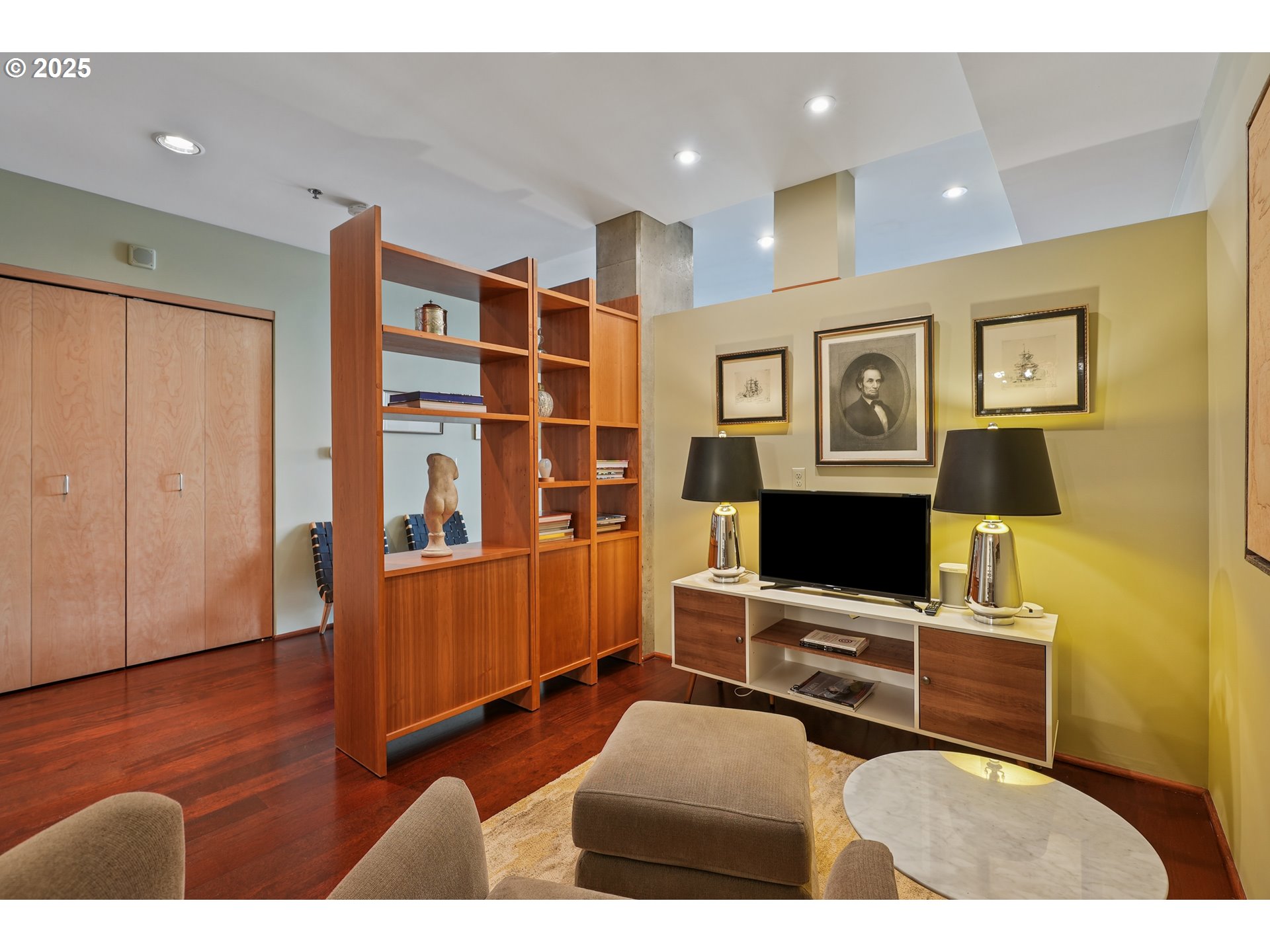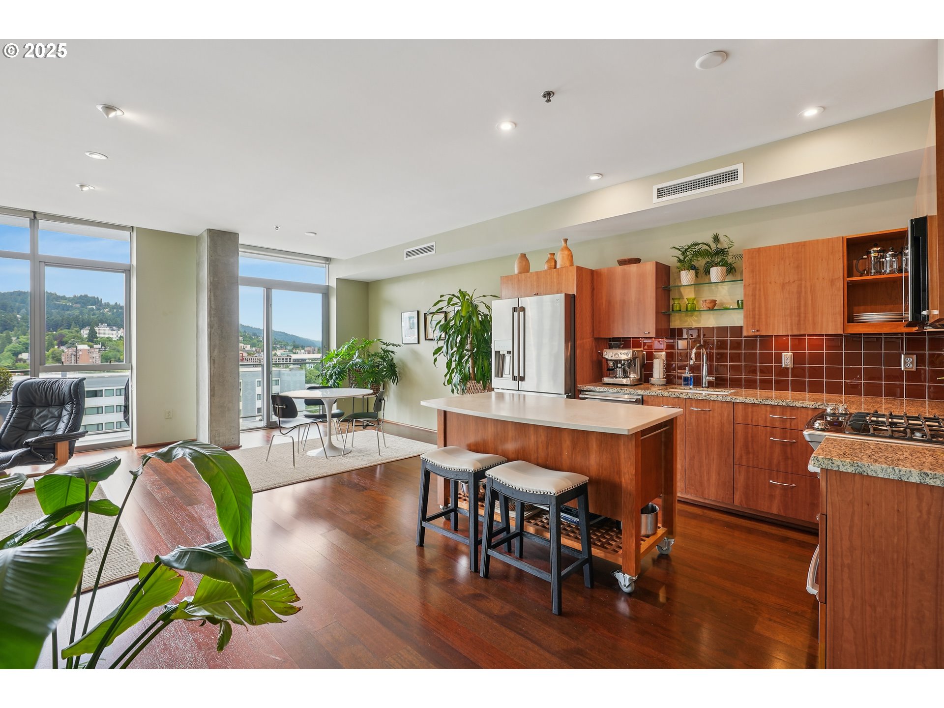 This beautifully updated condo is bright, spacious, and thoughtfully designed with hardwood floors throughout and smart storage solutions. A full wall of floor-to-ceiling windows fills the space with natural light and showcases incredible views —sunsets, the West Hills, and the city stretching up the river valley. The wide living area gives you room to spread out, with space for formal dining and a separate sitting area. Sliding glass doors with Phantom screens open to a generous 27-foot balcony—perfect for grilling or just enjoying the fresh air. Love to cook or entertain? The kitchen is updated with recessed lighting, Electrolux and Bosch stainless steel appliances, double ovens, a gas range, touch-activated faucet, and an enlarged island countertop. The private primary suite features double closets and a spacious bath, separated from the main living area by a custom divider that casts a soft evening glow. The second bedroom is flexible and functional—ideal as an office, den, or guest area—with easy access to a second full bath and double closets in the entry hall. You’ll also appreciate the oversized laundry room with custom built-ins for added storage and a workspace, and a water leak detection system with automatic shut-off for extra peace of mind. Secure, deeded parking is included. The building offers great amenities: a fitness room and library, a meeting space and common terrace with kitchen and bath, and 24/7 concierge service. Plus, you’re just blocks from the Portland Art Museum, the Schnitz, PSU, Farmers Market, great dining, shopping, and all the charm of downtown.