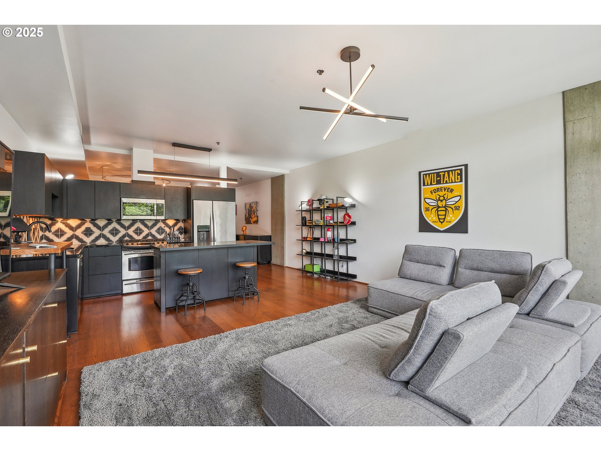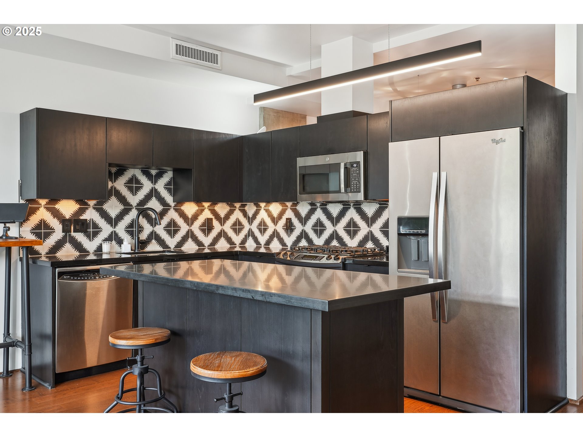 This contemporary condo has been remodeled with modern style & incredible updates. You are greeted with sleek storage cabinets running from the entry to the living area, floor-to-ceiling windows and almost 18' of covered balcony space. Enjoy peaceful views of the green trees, sunsets, the West Hills, and the city. Entertain from the remodeled kitchen with well suited dark cabinets, solid surface countertops, modern tile backsplash, and a built-in island with more storage & eating space. The open living area is perfect for displaying art, offers more built-in storage cabinets & custom lighting. The bedroom is full of style with an accent wall, built-in lighting & custom closets. The remodeled bathroom is crisp & clean with marble tile gracing the floors and walls, a big marble shower & solid surface vanity. The extra large laundry room is stylish & large enough to be an office with a custom tile floor, plenty more storage cabinets & washer/dryer. Separately deeded & secure parking space is included in the building. EV outlet included at the deeded parking space. The building has many wonderful amenities: fitness room & library on the 2nd floor, meeting room & common terrace with kitchen & bath on the 3rd floor, plus 24/7 concierge service. Strong HOA & very well managed building. In addition to the Portland Art Museum across the street, enjoy events at the Schnitz, Oregon Historical Society, Farmers Market, classes at PSU, downtown shopping, dining & iconic architecture all within reach.