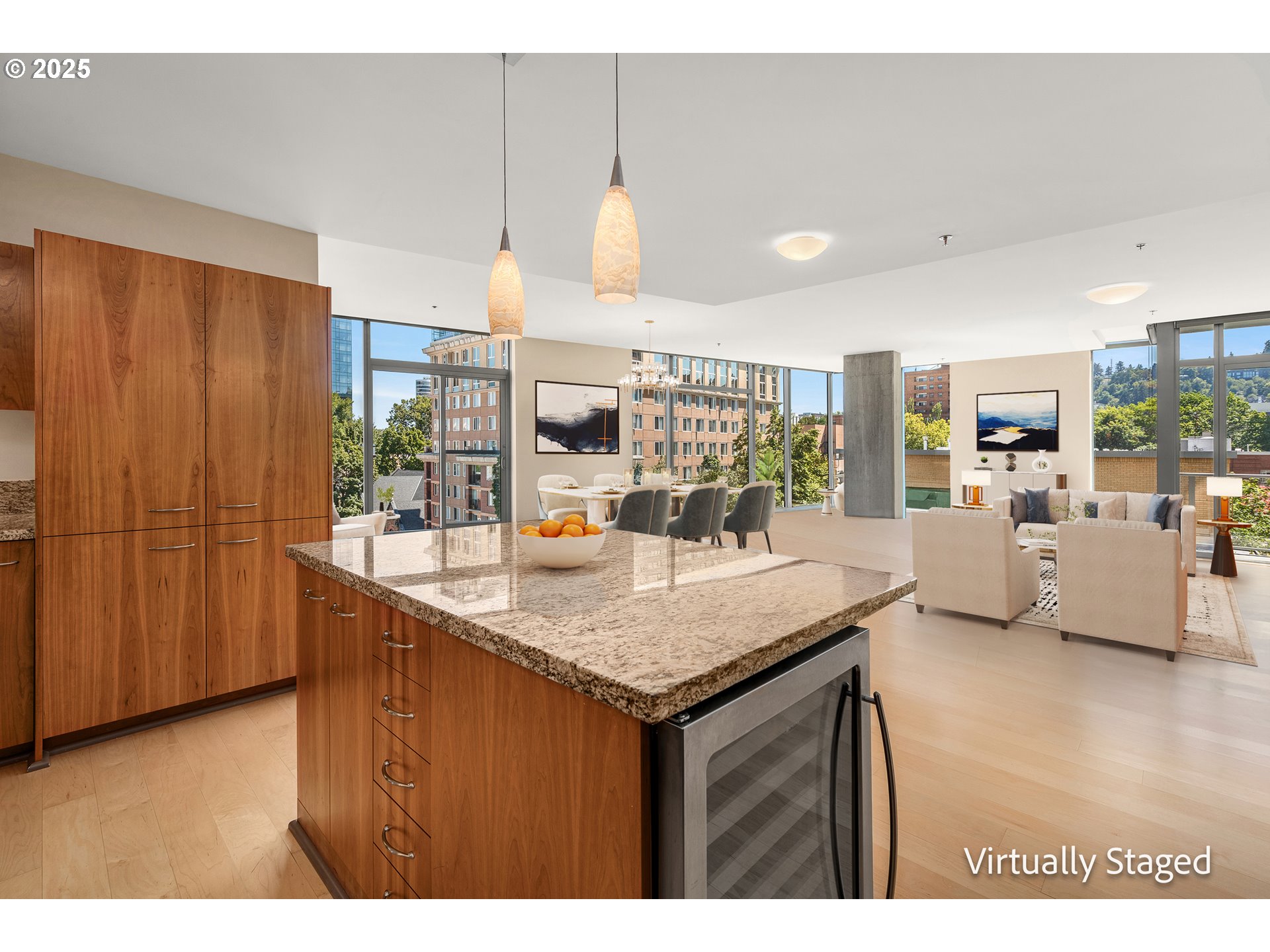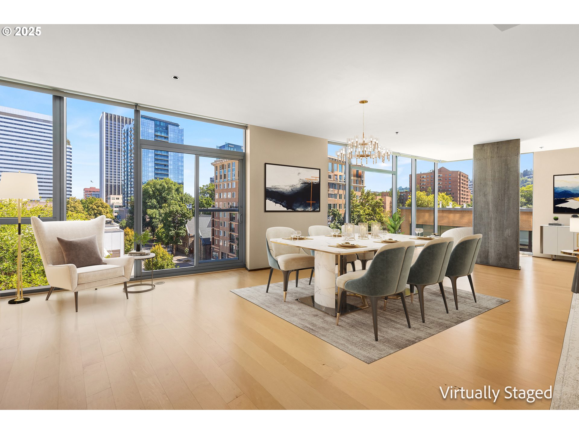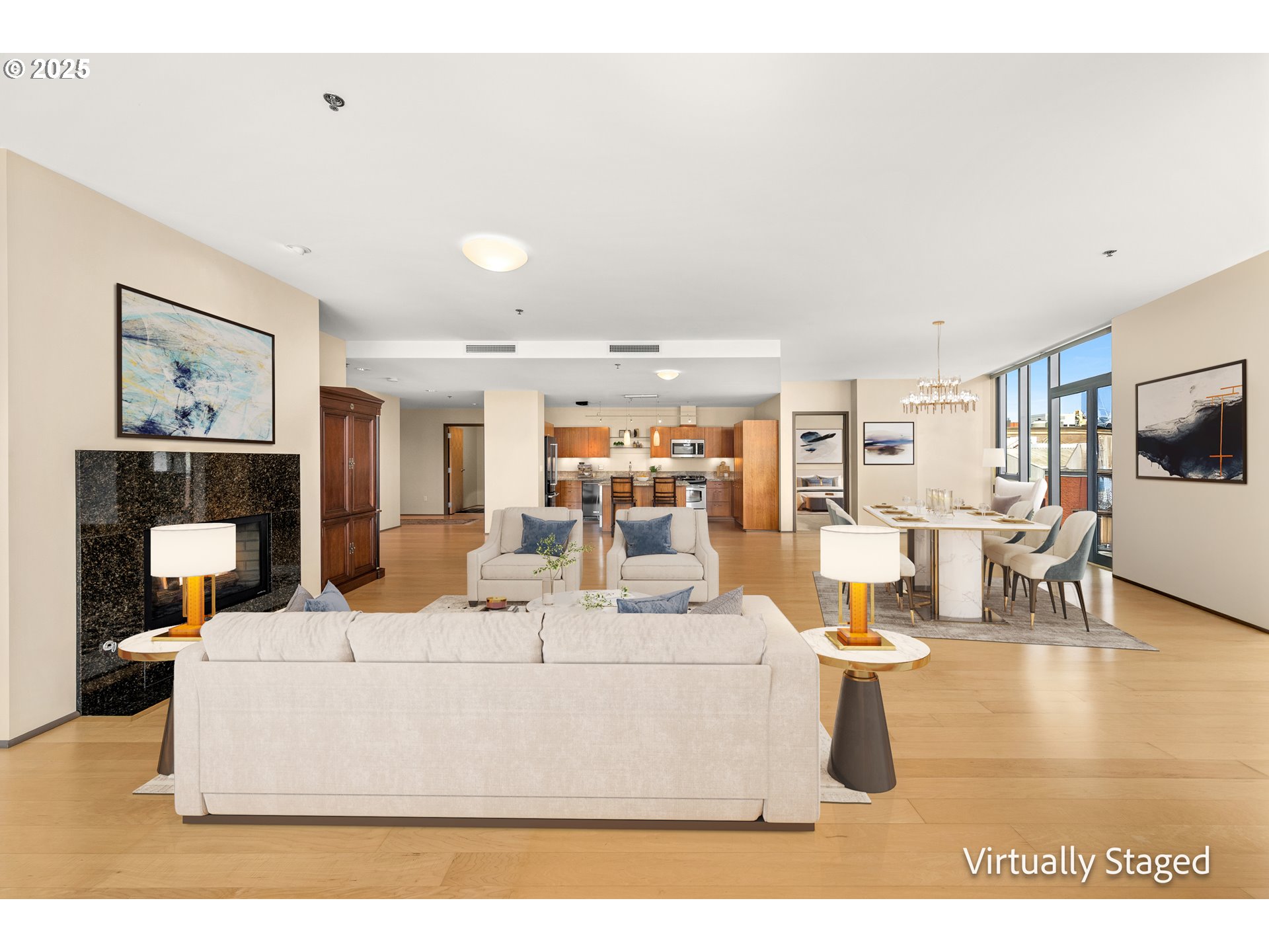 Experience nearly 2,150 sq ft of open-concept condo living located in the heart of Portland’s vibrant Cultural District! Across the street from the soon-to-open, newly renovated Portland Art Museum and the newly opened Coquelico Cafe. Expansive design of this Eliot Tower unit is complemented by a gourmet kitchen with a wine cooler, island and convection oven with gas cooktop. A granite-framed fireplace adds warmth to the spacious living room, which opens onto a south-facing balcony. The primary en suite bath features a walk-in shower and porcelain soaking tub with travertine tile throughout. Thoughtful built-ins maximize storage in the laundry room, and the second bedroom has tall built-in bookcases. Modern upgrades include a WaterCop leak protection system, newer fridge, dishwasher, and microwave and an HVAC system replaced in 2018. All major appliances included. Deeded 2-car tandem parking is located near the elevators. Enjoy 24/7 concierge service, a well-equipped gym, library, conference room and an outdoor entertainment area with kitchen. Leading attractions nearby are the Portland Art Museum, which is nearing completion on a $110 million remodel, and the Madrina Cocina Mexicana, recently featured in Forbes Magazine. Also nearby are PSU (those 65 y/o+ can audit classes for free), 2 Farmers' Markets, a grocery store with pharmacy, Arlene Schnitzer Concert Hall, Newmark Theater, Keller Auditorium, The Oregon Historical Society, gourmet restaurants, a new food hall and more!