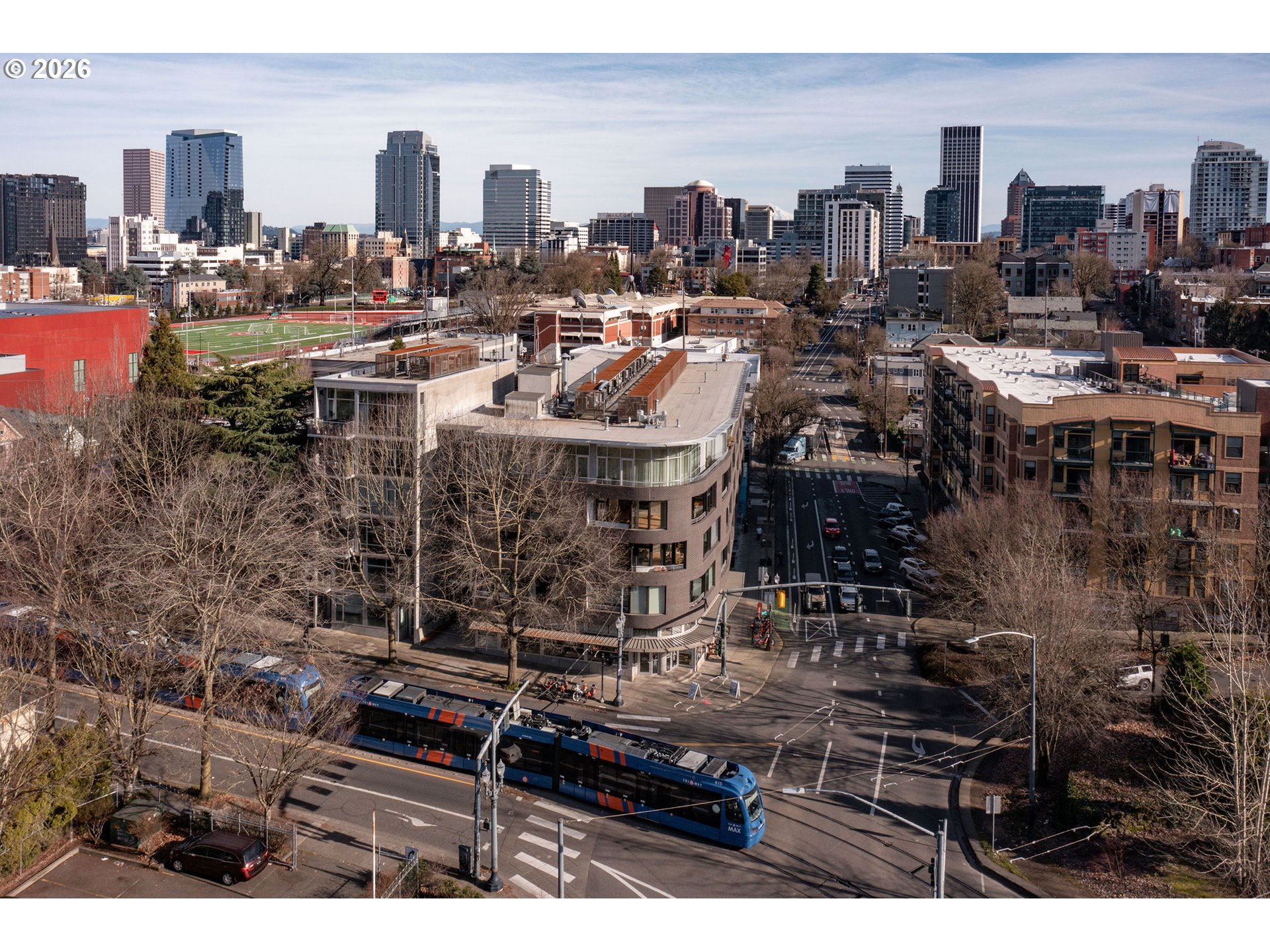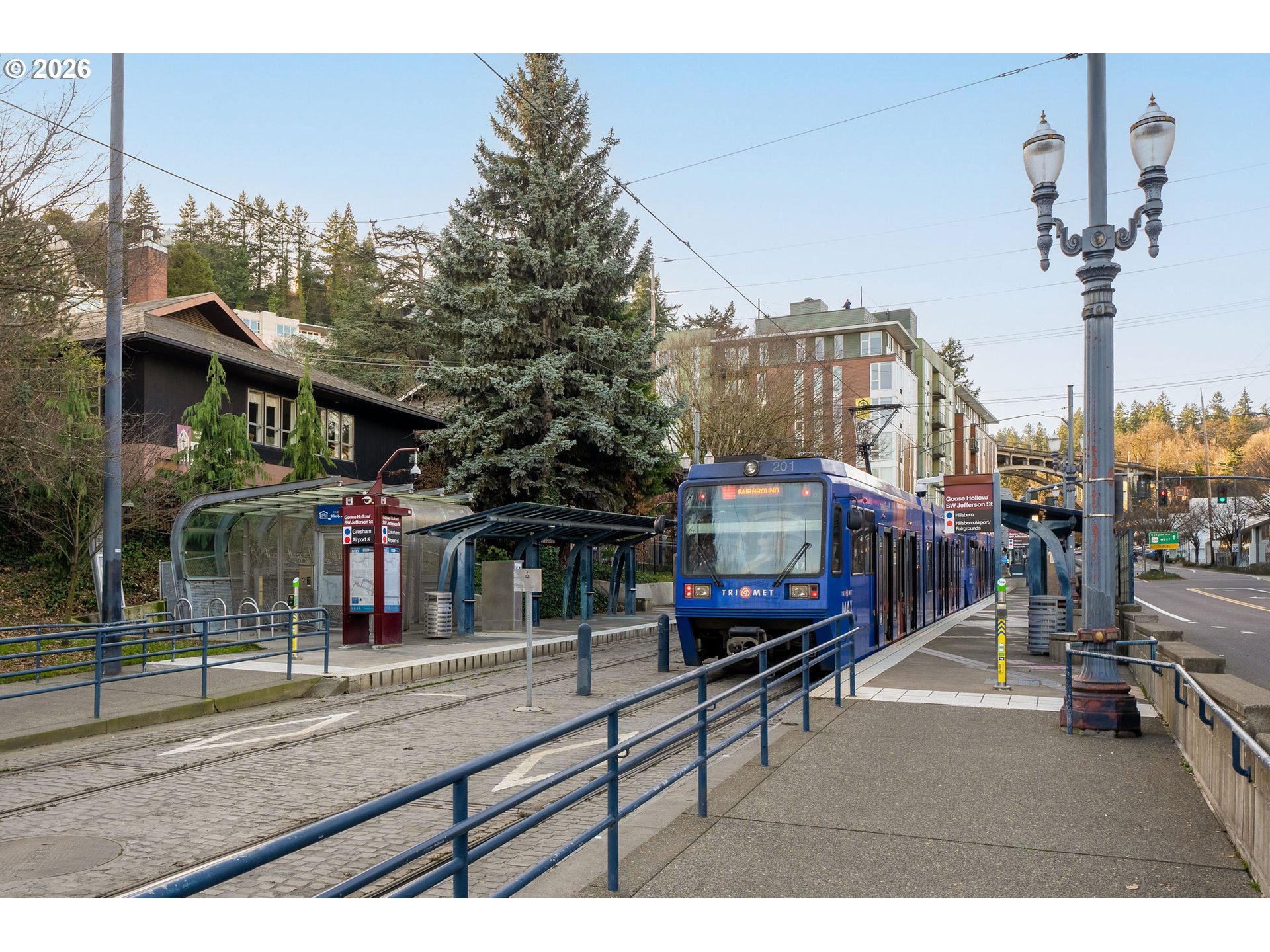 Nestled in historic Goose Hollow, just down the hill from Washington Park, this light-bright, south-facing sanctuary offers a convenient, understated, and high-quality lifestyle. The minimalist design with an open floor plan and huge windows is elevated by ingenious features, including a primary bedroom made private by solid-wood pocket doors and a functional Tatami platform bed with built-in storage. The bathroom, designed for ease and function, opens to both the entry and the bedroom. This versatile space flows into a walk-in closet and includes a tucked-away washer and dryer, finished with a private, split-layout shower and water closet. A versatile flex room at the entry easily adapts to a guest room or an office and features a raised platform with storage, and a built-in motorized desk that seamlessly tucks into the raised platform. The custom kitchen island has an eating bar and creative storage solutions, while the balcony offers the perfect place to relax, listen to the birds, and take in the neighborhood. With the wall-mounted Frame TV, speakers, and custom-designed sofa made for the space, this home is turnkey. You'll be able to move right in and start enjoying neighborhood favorites like Fehrenbacher Hof, Goose Hollow Inn, Bold Coffee & Books, and easy access to the Max Light Rail, Pearl District, NW 23rd, Downtown, and Providence Park Stadium. Built in 2008, the Jefferson is a distinguished 6-story boutique condo building of concrete and steel construction with a secure entry access system and gated garage; it feels solid, with clean lines, high ceilings, and an eco-roof. NEW HEAT PUMP for perfectly functioning heating & air conditioning installed in 2023.