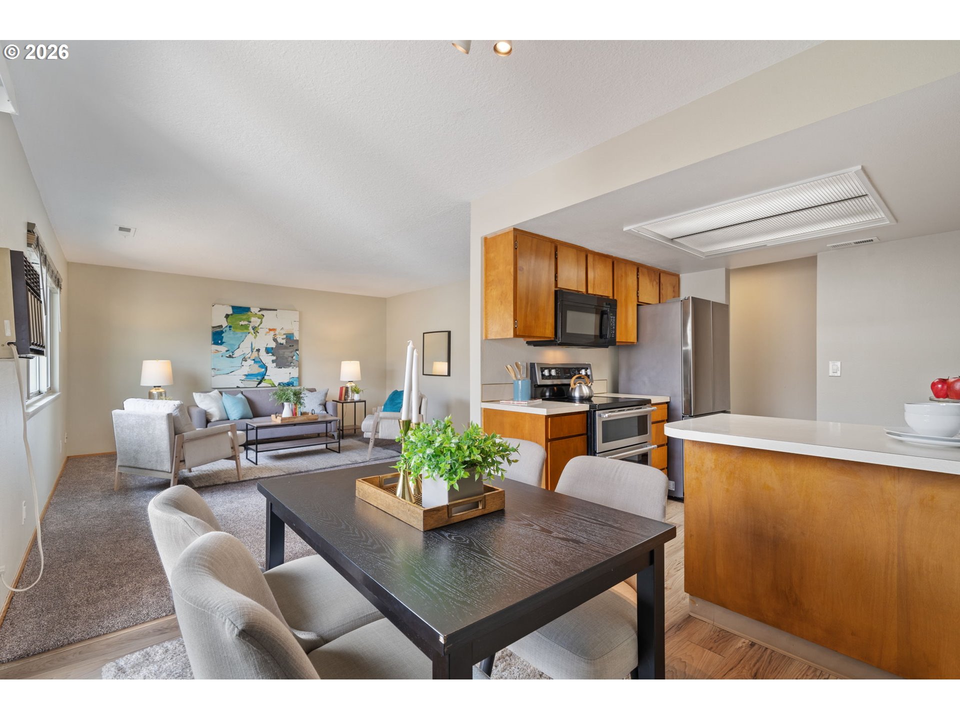 Tired of choosing between apartment living and the dream of a place all your own? This RARE 2-bed, 2-bath condo solves that problem. While many condos feel like glorified apartments in run-down complexes, this one breaks the mold! Set down a private drive, well off the street, the entire community is well maintained, peaceful, and lets you shake off the cares of the day. Picture starting your morning with coffee on your own deck, surrounded by bucolic views you'd never expect in condo living and then coming home after work to a place that feels like your sanctuary, not just another unit in a complex. Fresh updates make it move-in ready: newer paint and carpet, windows and slider, and H20 heater, along with newer kitchen appliances that make daily routines simple and stress-free. Your primary suite becomes a true retreat with a walk-in closet and full ensuite bath where you can unwind in private, while the second bedroom and second full bathroom give you the flexibility to host guests, work from home, or spread out however life demands. The washer and dryer stay, built-in AC keeps you comfortable year-round, and assigned parking means you’ll never circle the block looking for a space. You're five minutes from 205, a quick jump to PDX, minutes from Floyd Light park and Glendoveer trails, tennis, and golf. Target, Fred Meyer, and local spots like Jubilee Hall PDX and Sayler's keep errands and life's essentials within reach. This isn't just another condo, it's the answer to controlling your own future.