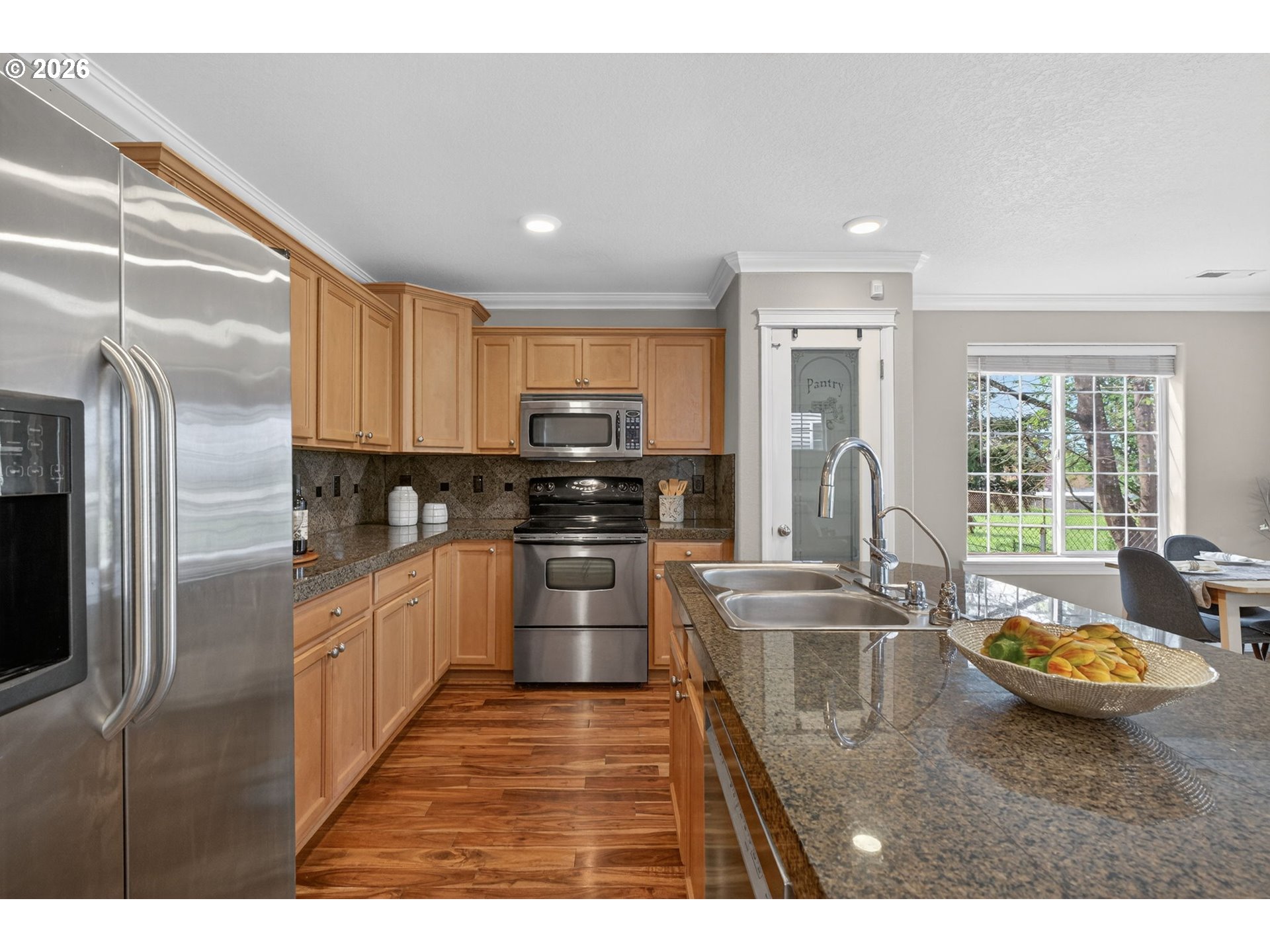 Dishwasher, FreeStandingRange, Granite, Island, Microwave, Pantry, StainlessSteelAppliance