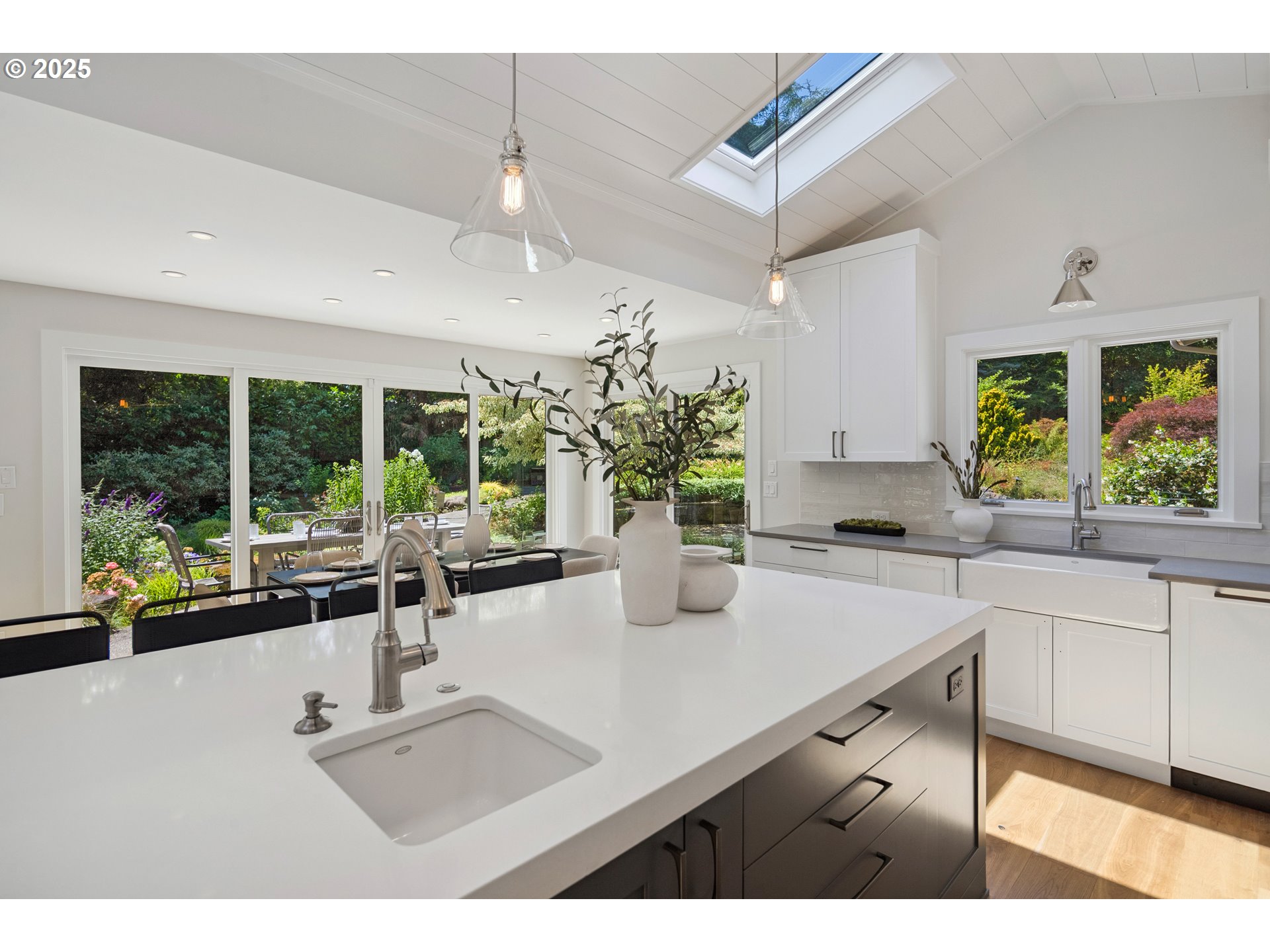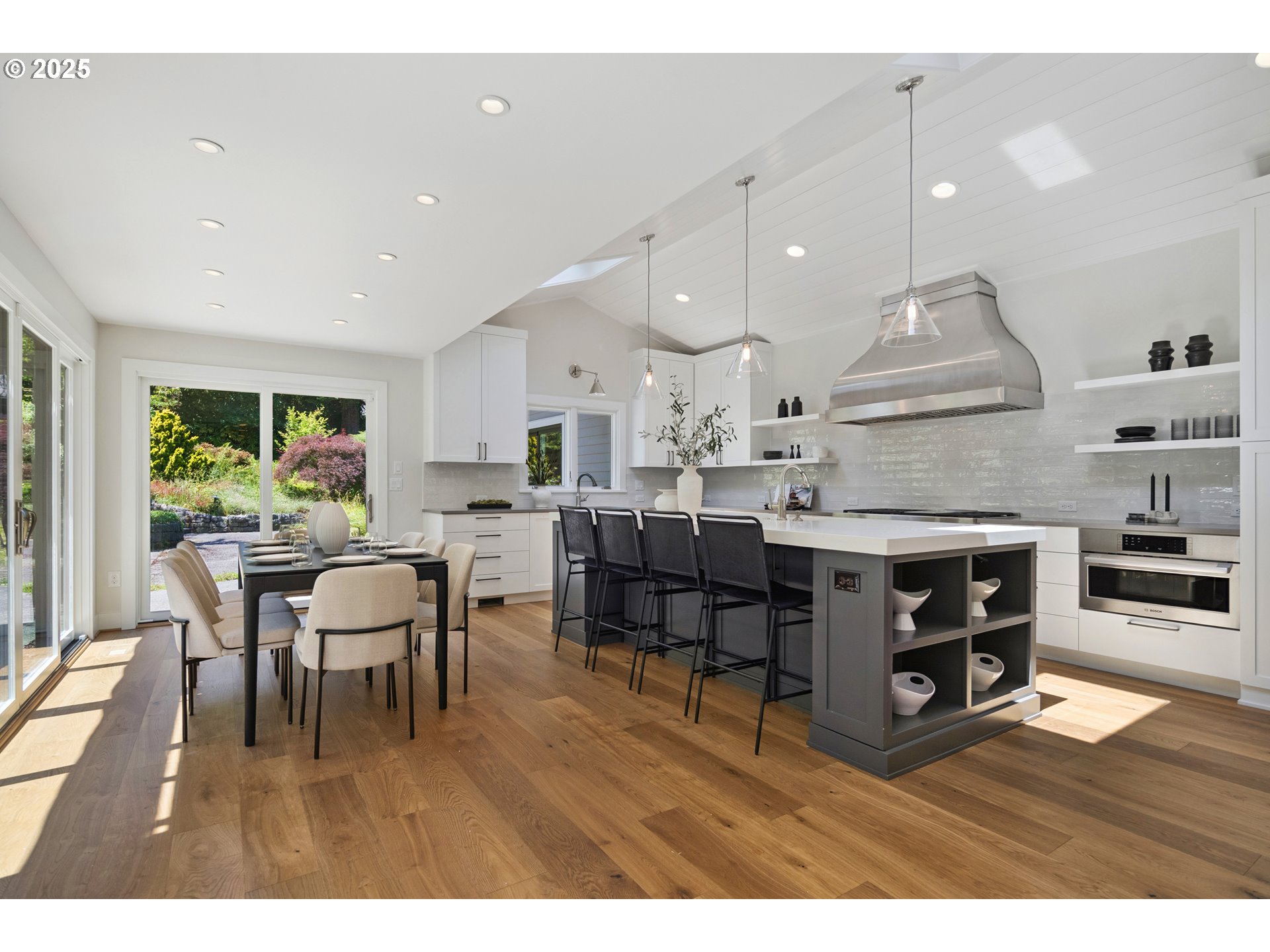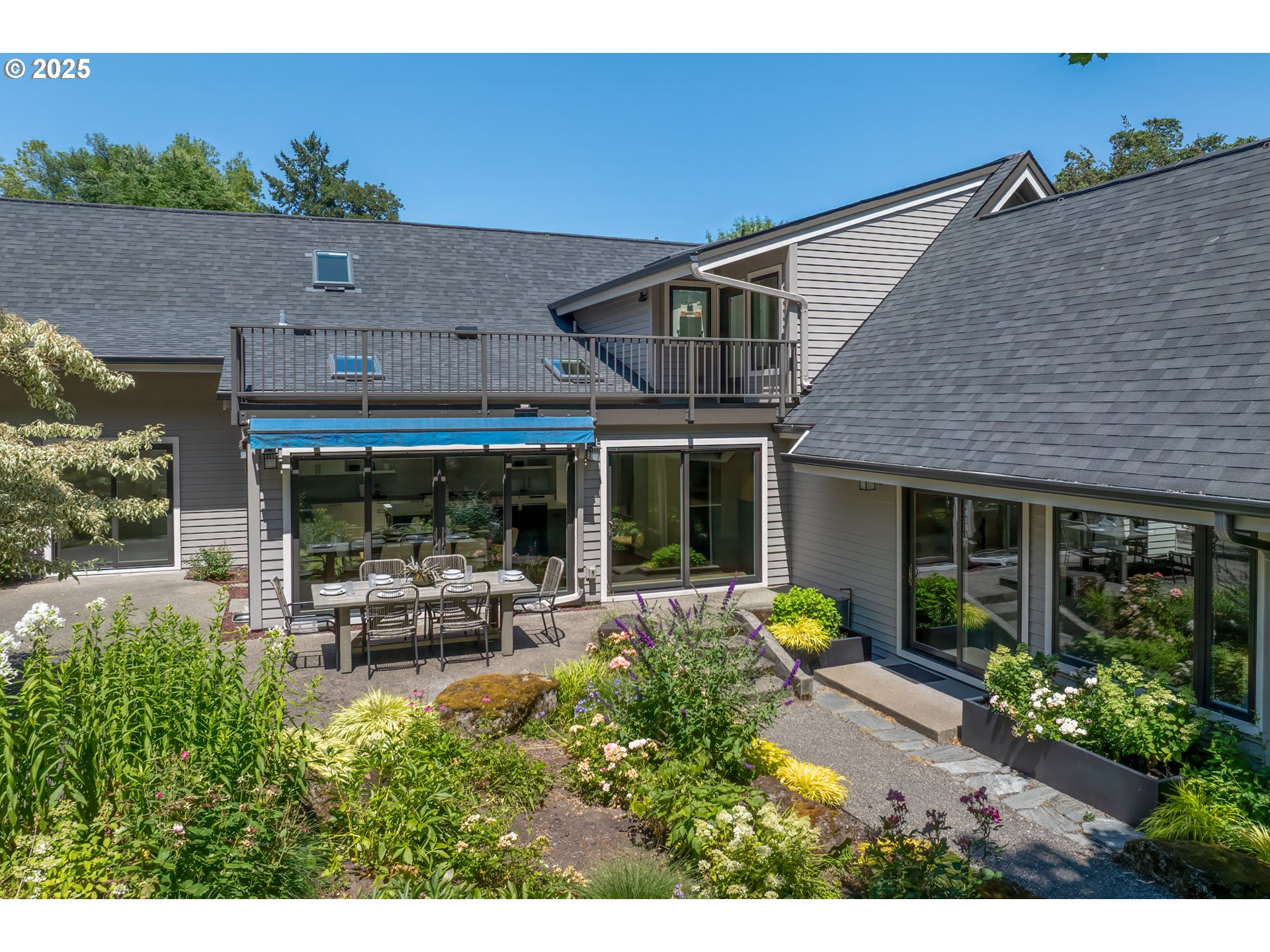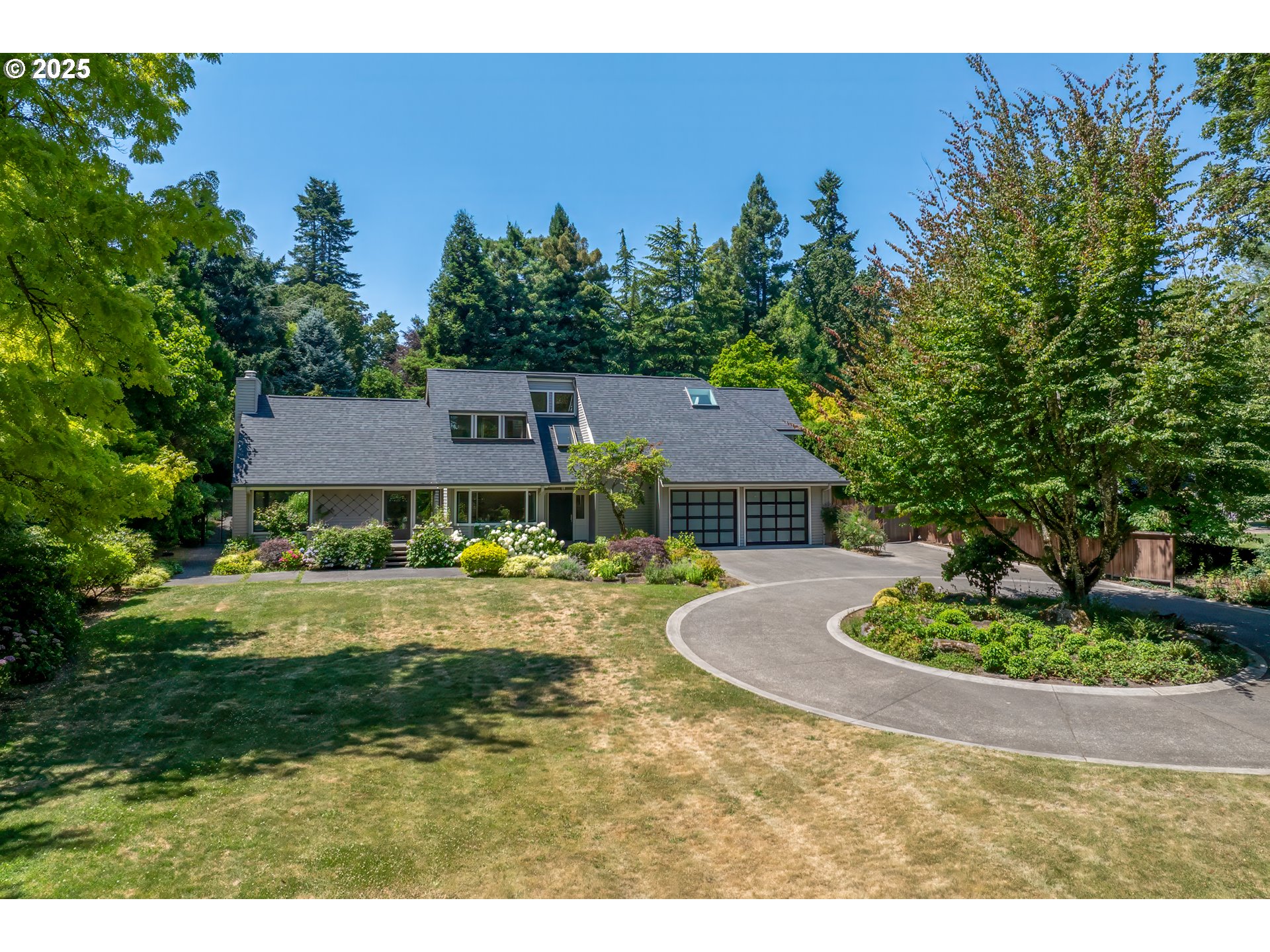 (503) 893-8874Nestled on nearly an acre on one of the most sought-after streets in Dunthorpe, this stunning contemporary residence has undergone a comprehensive renovation with meticulous attention to detail. The result is a bright and refined interior where clean modern lines are beautifully balanced by new white oak flooring and elegant shiplap accents. Throughout the home, expansive picture windows, sliding glass doors, and skylights dissolve the boundary between indoors and out, framing the stunning natural beauty of the grounds and flooding nearly every room with natural light. In the living room, a dramatic recessed tray ceiling complements a fireplace framed by artful stonework and flanked by custom built-ins. The gourmet kitchen showcases brand-new Sub-Zero, Wolf, and Bosch appliances, quartz countertops, a farmhouse sink, and a vaulted tongue-and-groove ceiling with a skylight. A spacious center island faces a wall of glass that opens to an outdoor dining area and serene garden sanctuary with vibrant perennials and ornamental trees, interwoven with stone pathways that invite quiet exploration. A separate butler's pantry with dual Sub-Zero beverage centers provides additional prep space. The home offers five bedroom suites - three on the main level and two upstairs - including dual primary suites, one on each floor, for exceptional flexibility. A spacious bonus area with enclosed office space is ideal for a family or media room, while a separate guest house with kitchenette provides additional guest accommodations. The impeccably landscaped park-like grounds are surrounded by towering trees, offering maximum privacy in addition to manicured gardens, lush rolling lawns, and a sport court. The home is located in the esteemed Riverdale School District - consistently ranked one of the best in the state - minutes from downtown Portland and Lake Oswego.