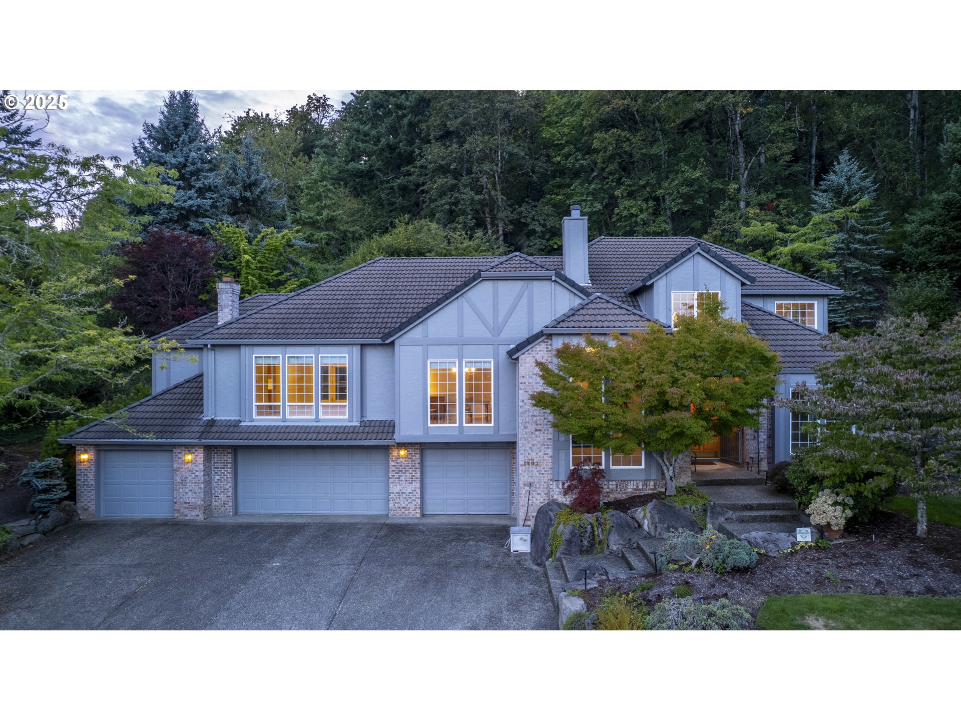 Perched near the top of Gresham Butte in a serene forested private space with magnificent western views of Mount Hood, this Tudor-inspired estate blends timeless elegance with meticulous updates. With a tile roof, roof inspection in 2022, and every system maintained to exacting standards, this residence showcases rare quality. In a Distinguished Neighborhood, it delivers Privacy, Peace and Tranquility, and Craftsmanship seldom found. Set on over half an acre of beautifully terraced grounds, the home boasts lush landscaping with irrigation, a newer deck for entertaining, and a four-car garage. Inside, the grand kitchen with dual islands anchors the expansive floorplan, offering abundant space for gatherings. Thoughtful upgrades ensure peace of mind and modern comfort: HVAC (2021), hot water heater, exterior paint (2024), new blinds, garage door, ductwork cleaning (2023), deck (2019), and irrigation pump (2025).