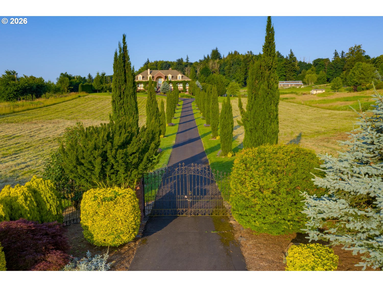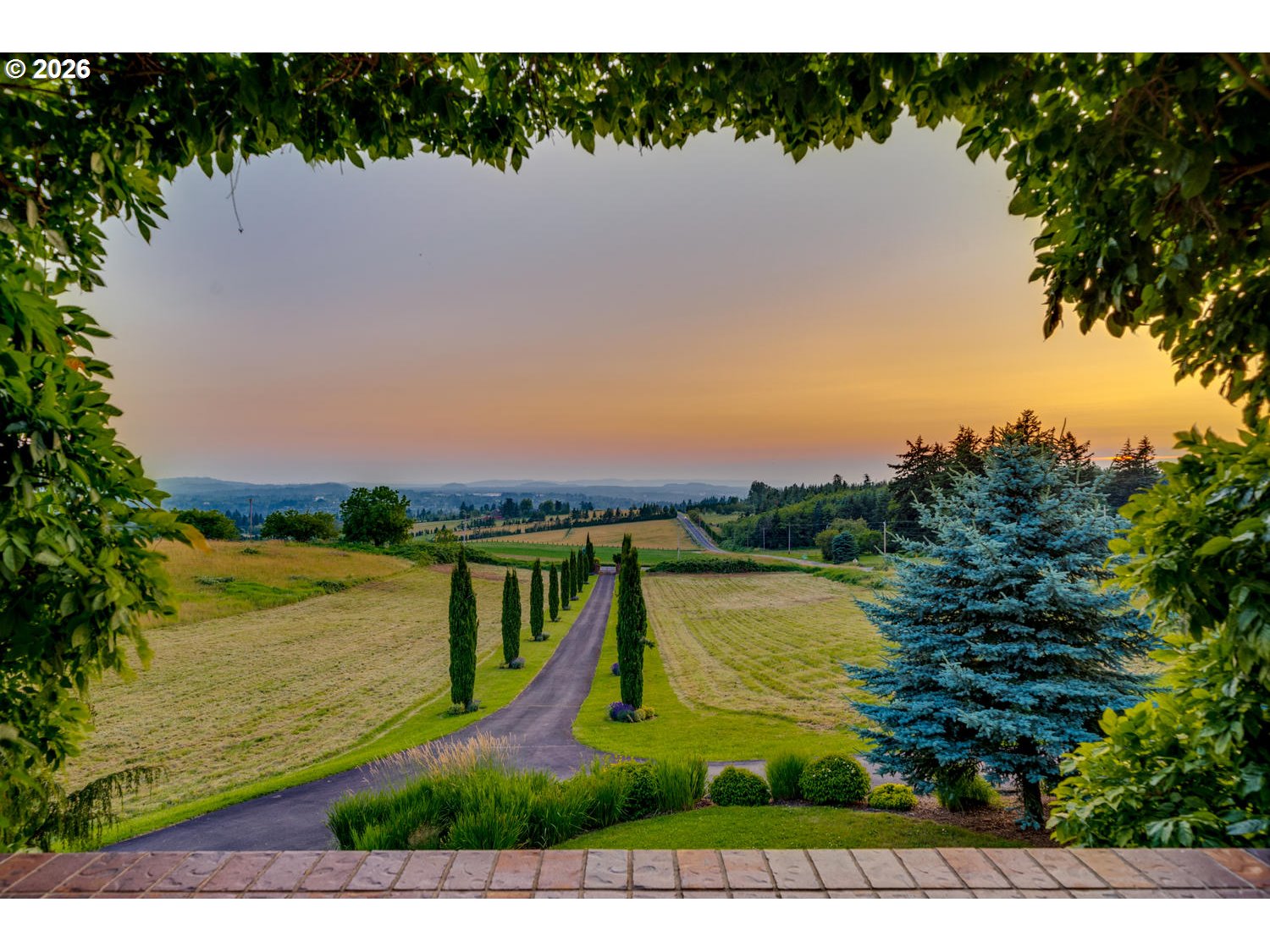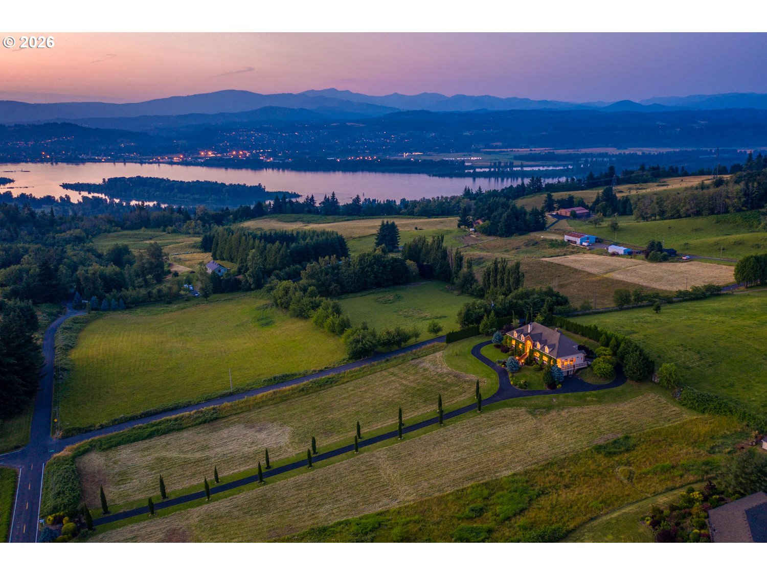 La Villa is a Georgian Farmhouse masterpiece designed with rigorous proportions & commitment to symmetry. Centered on the front facade, the grand entrance is in line with the entry gate & cypress lined drive. Windows look out to spectacular sunsets, sparkling city lights and rolling pastoral vistas. The open plan features timber beams, 19-foot ceilings, abundance of light flooding across Brazilian cherry floors, a chef's kitchen, sunroom, library, 4 fireplaces & a 22-car (3700sf) underground garage. A 20 min drive to PDX, amenities, dining & shops.