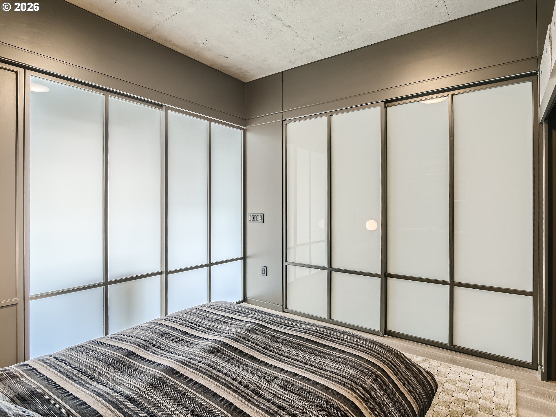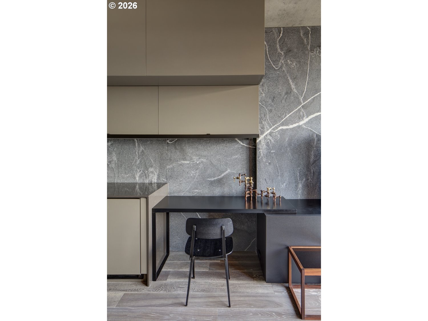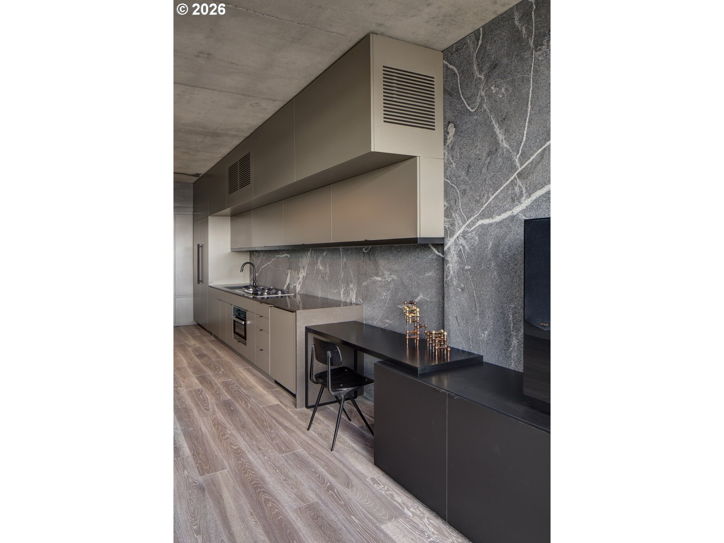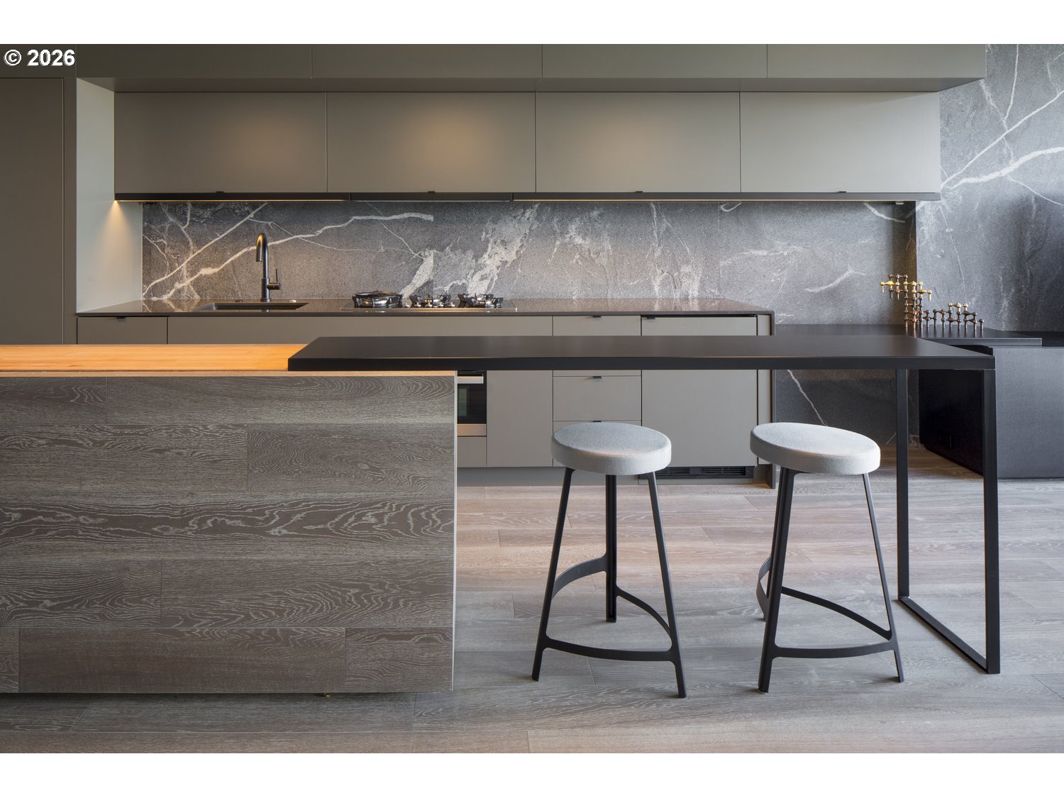 Stunning luxury remodel at the Edge Lofts by Osmose Design with beautiful east facing city views. Three impressive, solid Silver Fox granite slabs accentuate the kitchen backsplash and living room wall. Concrete ceilings are complemented by the European white oak, wide plank flooring throughout. Open concept kitchen features custom cabinetry, powder-coated steel island and slim pental-quartz countertops. High end appliances include Miele gas on glass cooktop with speed oven, integrated Miele dishwasher and integrated Subzero refrigerator and freezer. Oversized Flos Smithfield pendant lights complete the kitchen design. Fully enclosed bedroom with controls for motorized black out shades. The spa like bathroom features a custom steel vanity with a Terrazzo stone tile shower and built in storage. Extra built-in storage in the utility room with laundry. Secure, deeded parking space. In the heart of the Pearl District walkable, central, and surrounded by some of the city’s best food, shops, and parks.