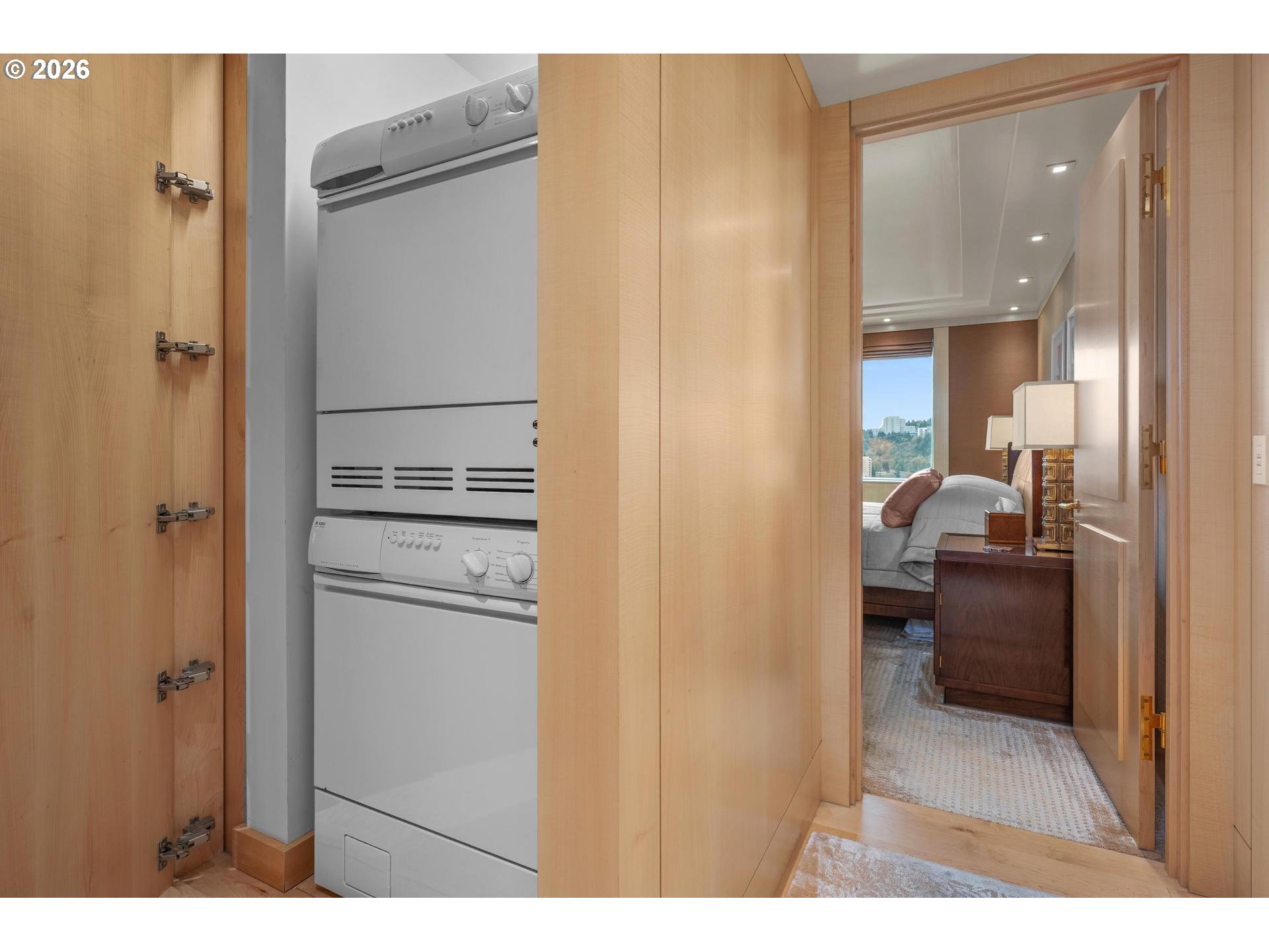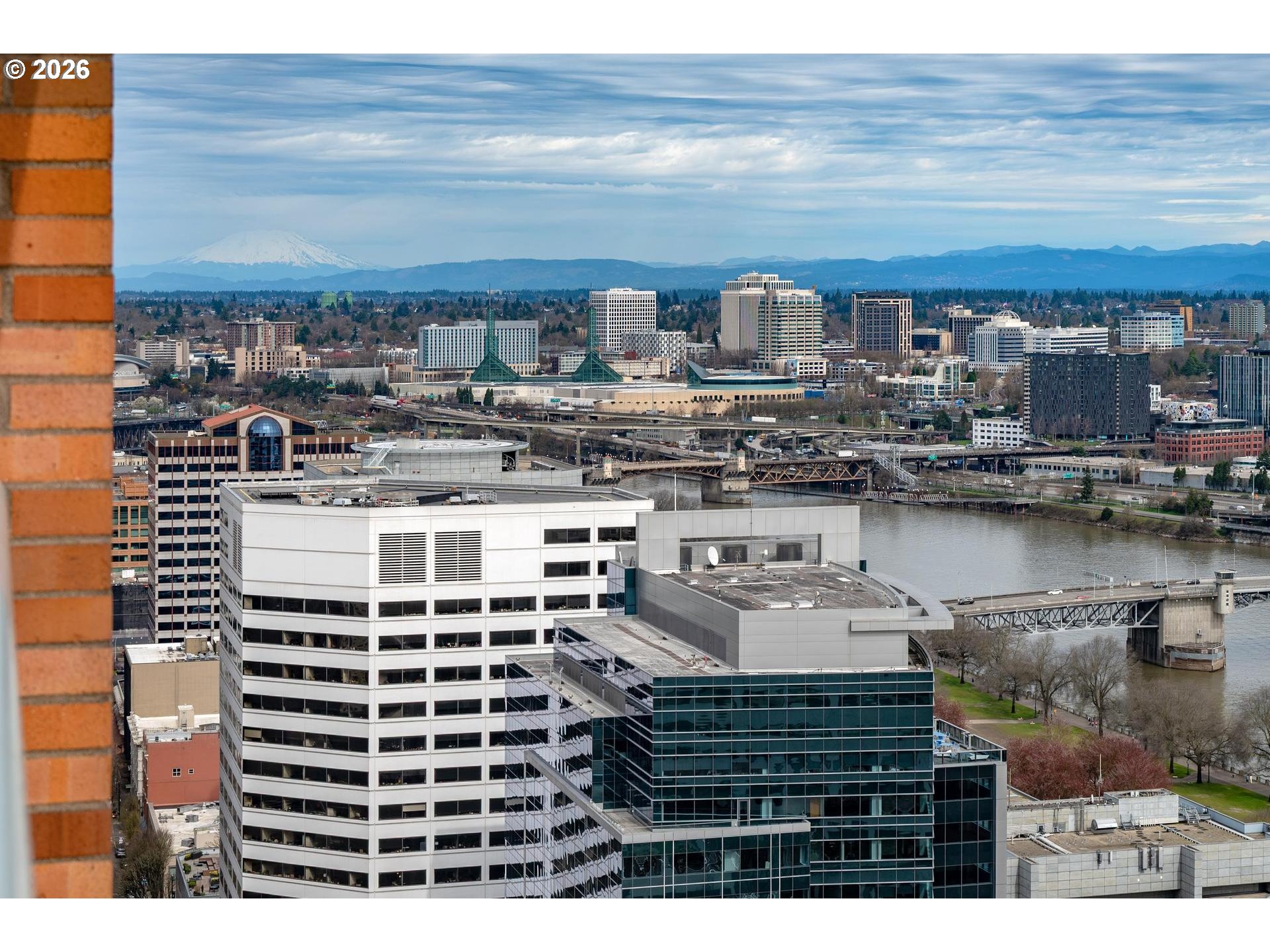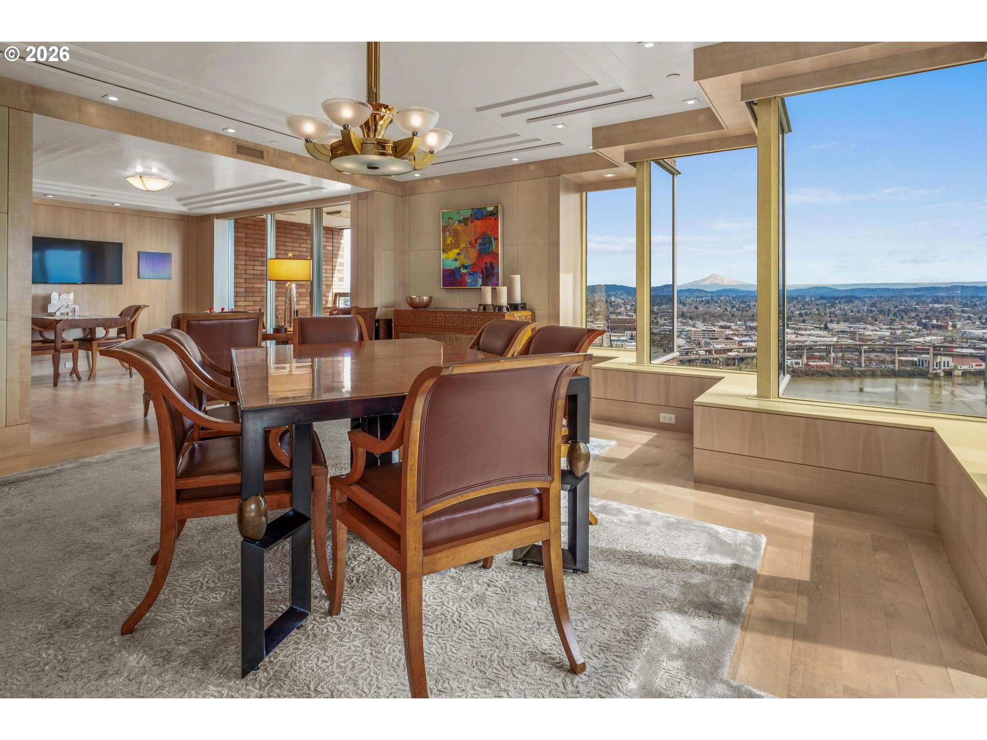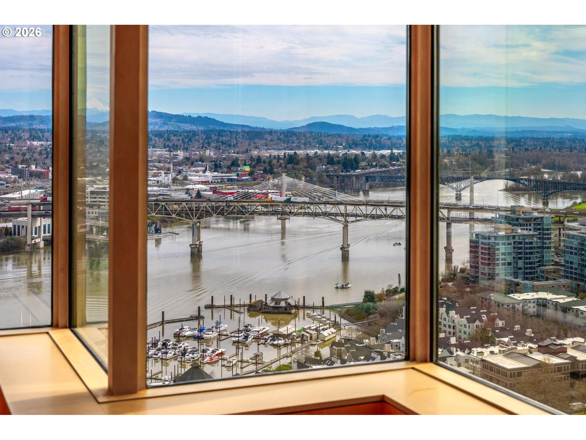 On the 24th floor of Fountain Plaza, this stunning residence captures sweeping views of the river, Mt. Hood, and the city skyline from nearly every angle. Thoughtfully remodeled by noted Portland designer, Robert Trotman, with exceptional attention to detail, the home blends elevated design with effortless livability, featuring cleverly integrated, hidden storage throughout. The beautifully furnished interiors create a warm, inviting atmosphere, with most furnishings available to be included in the sale (art excluded). The luxurious primary suite offers a serene retreat with a spacious walk-in closet and additional concealed storage, along with a well-appointed bathroom. A secondary bedroom showcases expansive city views, perfect for guests or a sophisticated office. The kitchen is designed for both function and connection, opening to a comfortable gathering space that flows seamlessly onto a deck with breathtaking mountain views, ideal for everyday living and entertaining alike. Additional highlights include an in-unit laundry, oversized storage unit, one assigned parking space with EV charging capabilities, and the option for additional parking for a fee. Residents enjoy 24-hour concierge service and an unbeatable location just steps from Portland’s premier shopping, dining, and entertainment. A rare opportunity to own a truly special home in Fountain Plaza.