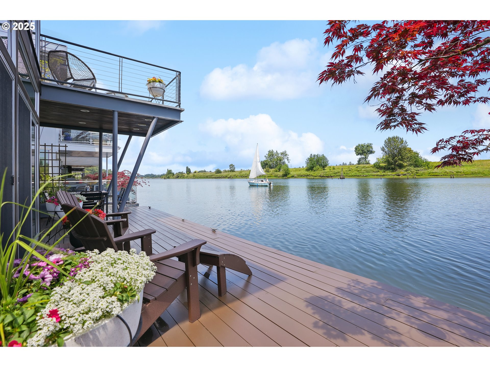 (503) 893-8874Offered for the first time ever, this modern floating home masterpiece is a rare opportunity to own a one-of-a-kind residence on the river. Featured in top design publications for its bold modern aesthetic and built by Even Construction—Portland’s premier floating home builder—this home at the coveted Channel Island Moorage blends architectural brilliance with timeless craftsmanship. Wrapped in sleek horizontal metal siding with stained wood accents, the home opens fully to the water with floor-to-ceiling windows, making the river an ever-present part of the experience. Step inside to a slab tile entry, oak hardwood floors throughout, and custom cherry cabinetry that elevates every space. The chef’s kitchen features high-end stainless appliances and a granite island perfect for entertaining. With a bar on each of the three levels and three upper decks—including a rooftop deck that spans the full roofline, perfect for sunset dinners or stargazing under the open sky—this home was built to impress. The primary suite is next level. Wake up to unobstructed river views, warm up by the propane fireplace, and unwind in a soaking tub that opens to the water. The private deck off the primary floats over the river and creates a covered outdoor space for the main-level deck below. From the walk-in closet and laundry, you can also access the bankside deck, offering dual outdoor connections. Every bathroom showcases custom tile work, adding texture and elegance throughout. The home offers 3 bedrooms, 3 full baths, and flexible spaces. The upstairs guest room includes a Murphy bed for easy conversion to an office or gym. Just up the ramp, the included two-car land garage has a finished loft with new flooring and ample storage—ideal for a studio or workspace. All included with your slip and membership at Channel Island Moorage, where owners enjoy the rare privilege of owning both sides of their dock. Modern, iconic—floating home living at its finest.