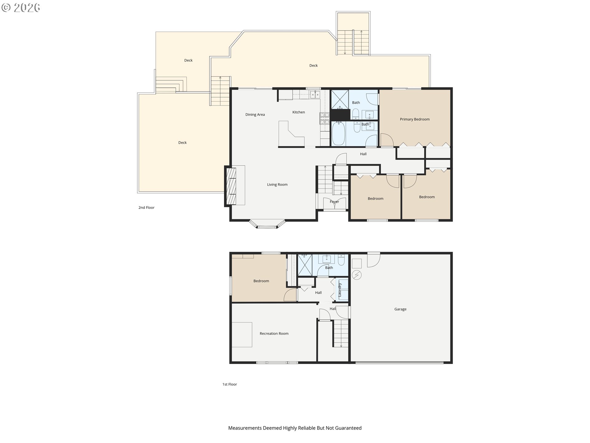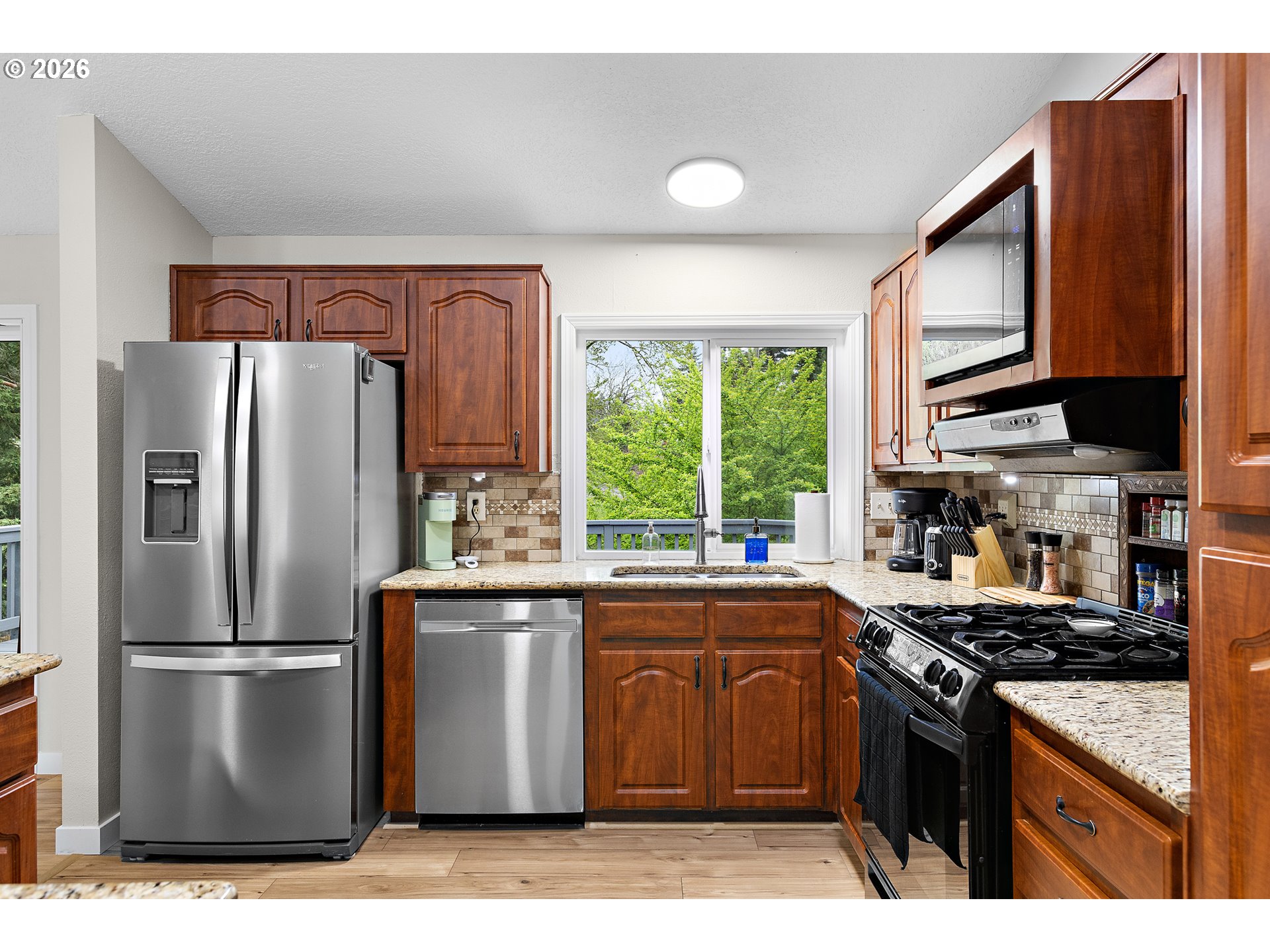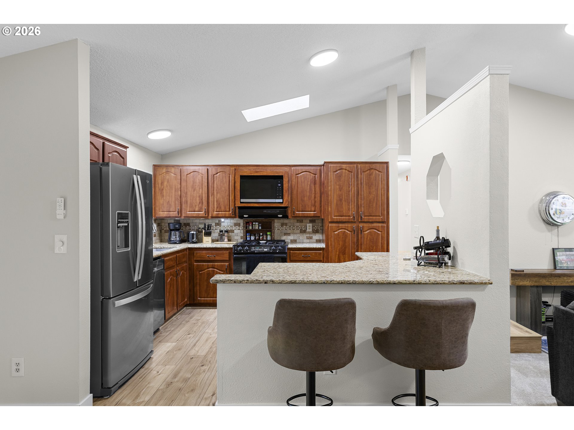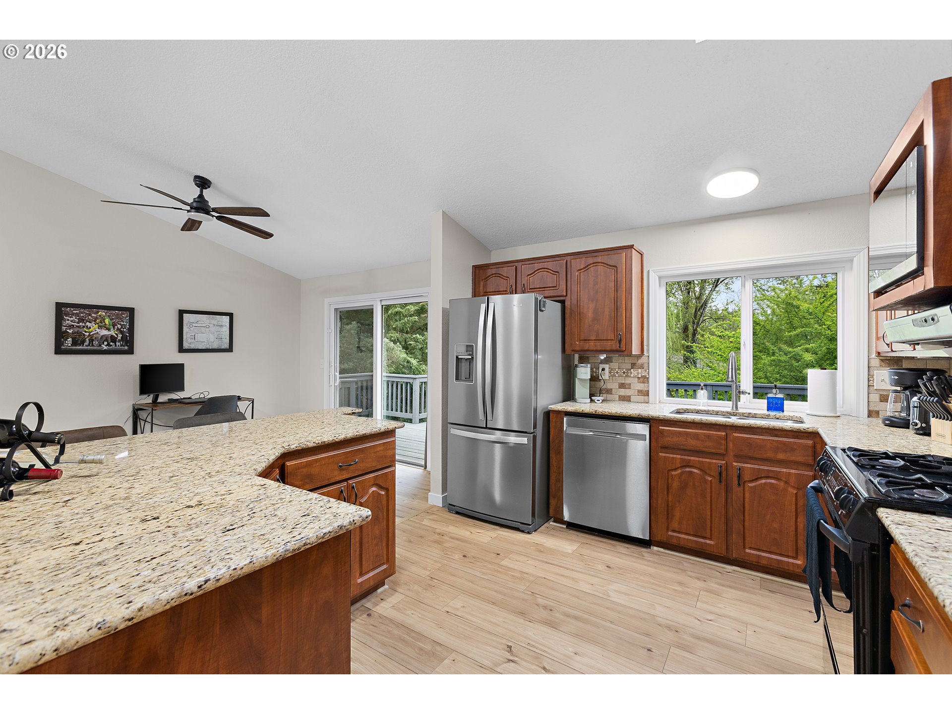 This four bedroom, three bathroom home features a flexible layout with spacious living areas on both levels, providing excellent potential for multi-generational living. Major updates include a new roof installed in February 2026 and a renovated primary suite. The interior is finished with new flooring and fresh paint accented by natural light from multiple skylights and a large bay window with seating. The exterior serves as a private retreat with two expansive decks overlooking a fully fenced backyard. The grounds are equipped for a functional outdoor lifestyle with garden beds, fruit trees, and a chicken coop. Additional outdoor features include a fire pit, a tool shed and 220 outlet at the patio. The front yard is landscaped with a full sun deck and yard. Ample space is available for parking an RV, boat, or trailer. The property is located 1.5 miles from downtown Gresham, offering quick access to Highway 26 and a 25 minute drive to PDX.