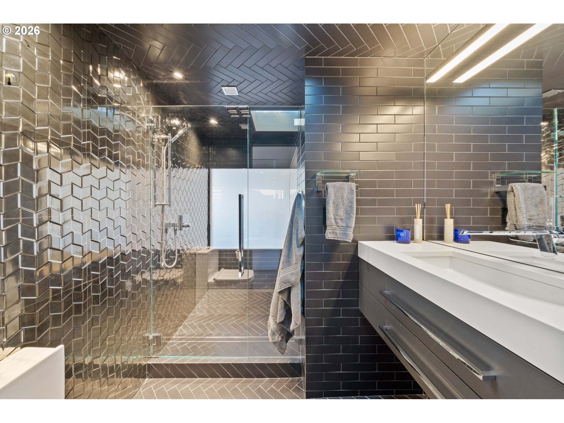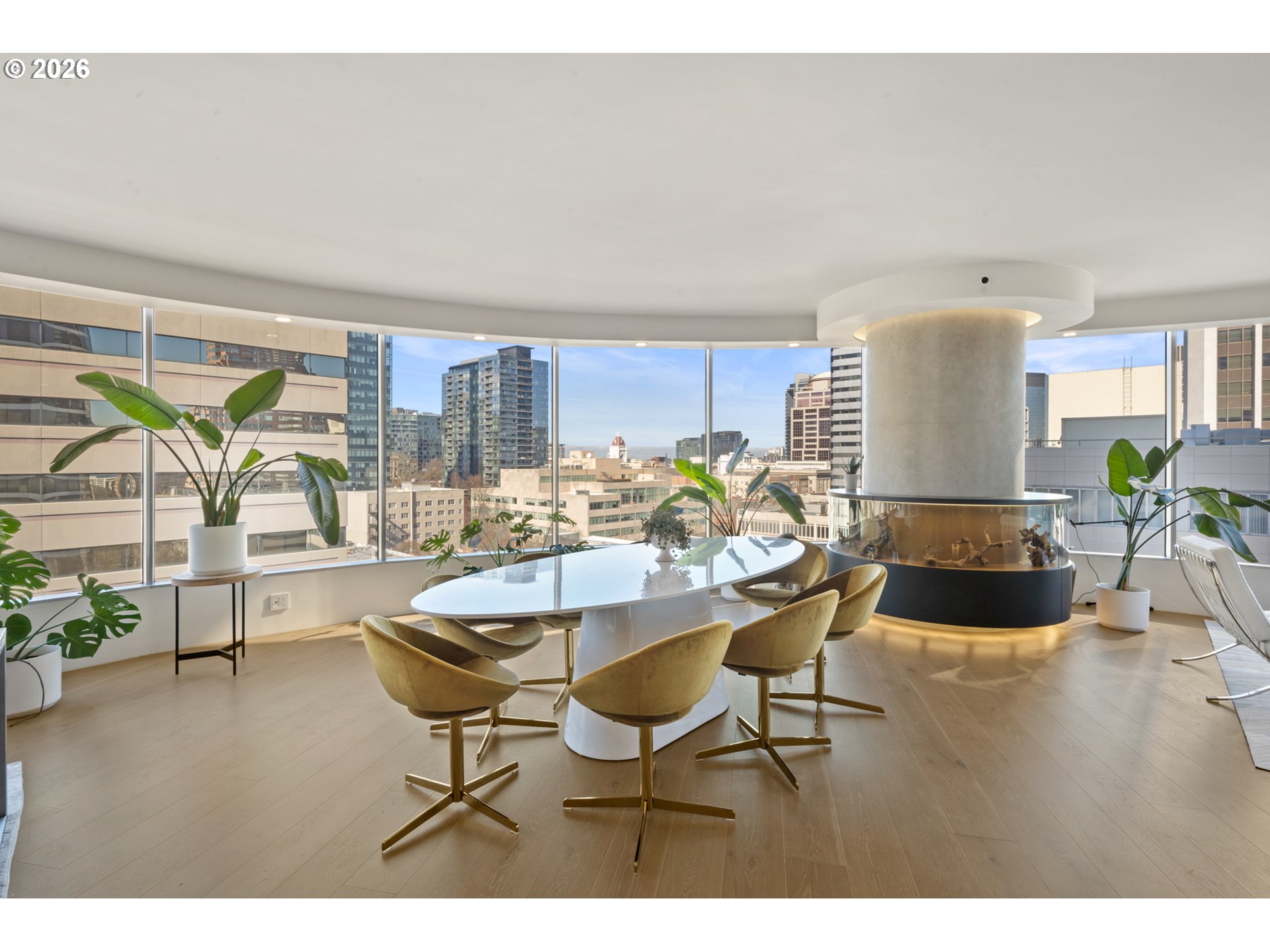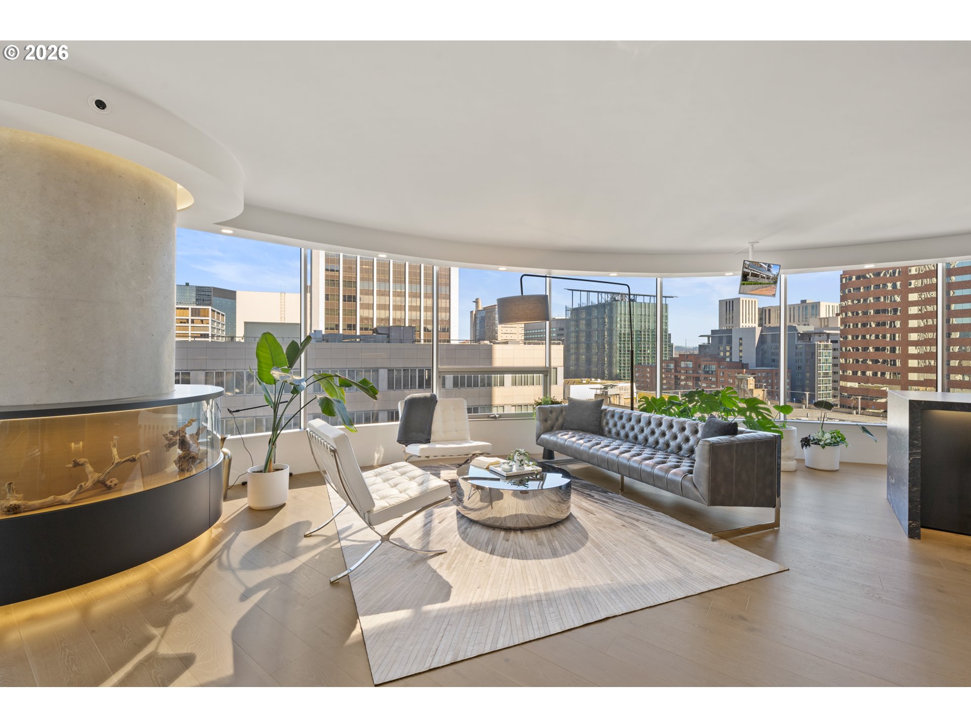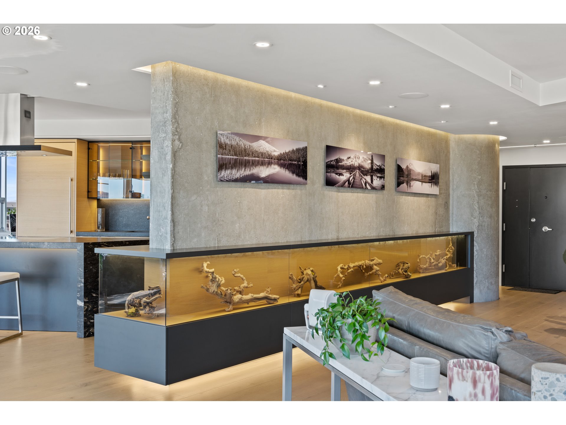 Custom-designed and located on the 11th floor of the iconic Portland Plaza, this extraordinary residence redefines downtown living with sweeping panoramic views of Portland’s skyline. This home was intentionally designed and fully customized with over $100,000 in lighting and integrated touchpad-controlled lighting, audio, and motorized shades — a level of detail and technology rarely found in condominium living. The kitchen is a true architectural centerpiece, anchored by a black leathered granite waterfall island with bar seating, built-in Sub-Zero refrigerator, freezer, and wine fridge, Wolf appliances, soft-close cabinetry, and illuminated glass cabinets designed for both display and function. Exposed concrete elements and museum-style glass display cases create a striking, gallery-inspired atmosphere throughout. Built-ins and mounted TVs make the home completely turnkey. The primary suite offers dramatic design with a mirrored ceiling, spa-inspired bath featuring a double shower wrapped in floor-to-ceiling black tile, and an expansive walk-in closet with built-in dresser storage. With 24-hour concierge and security, outdoor pool, fitness center, lounge and conference space, serene library, and two secured garage parking spaces — this residence offers luxury amenities paired with a truly custom interior that is entirely one of a kind.