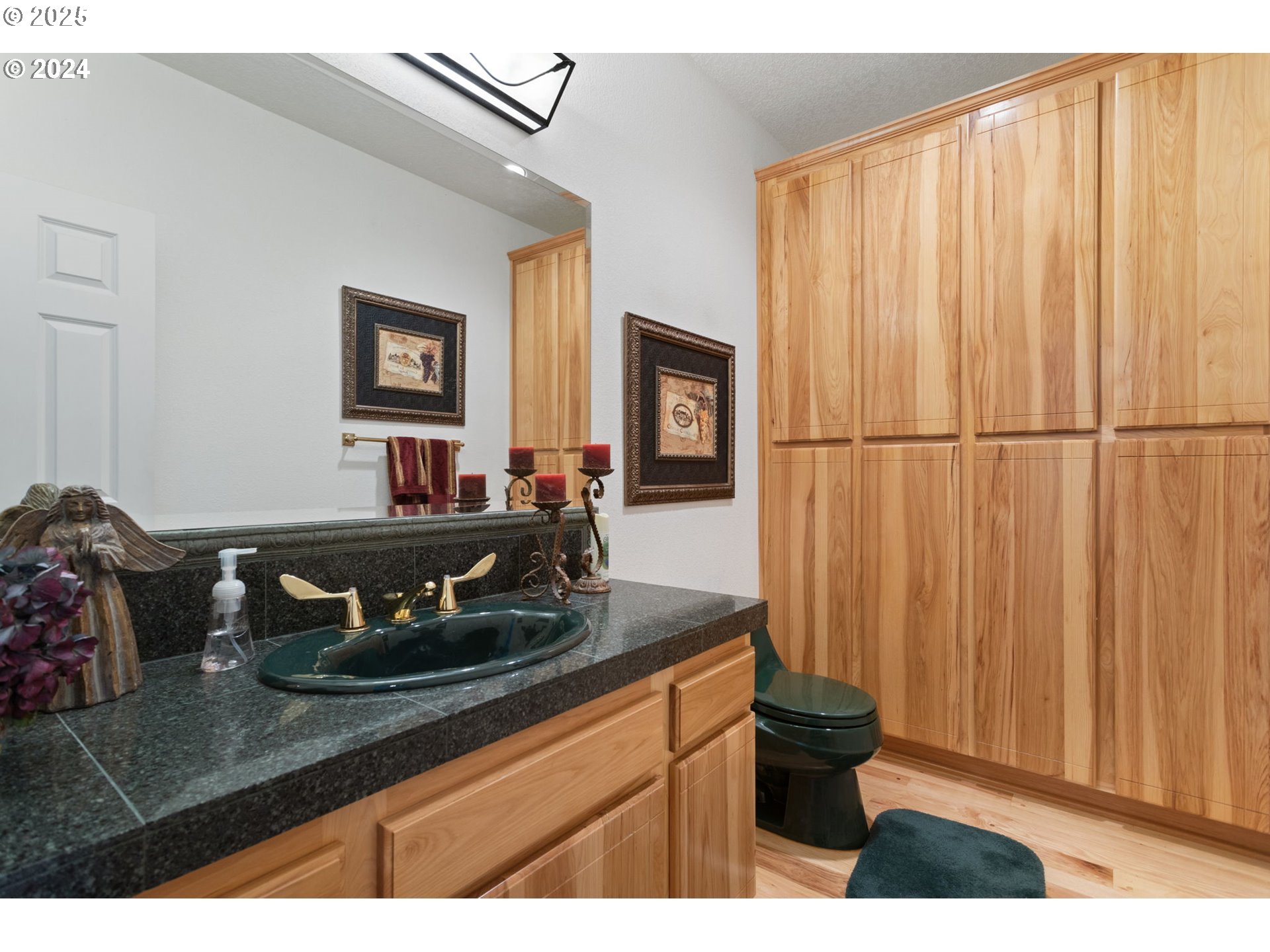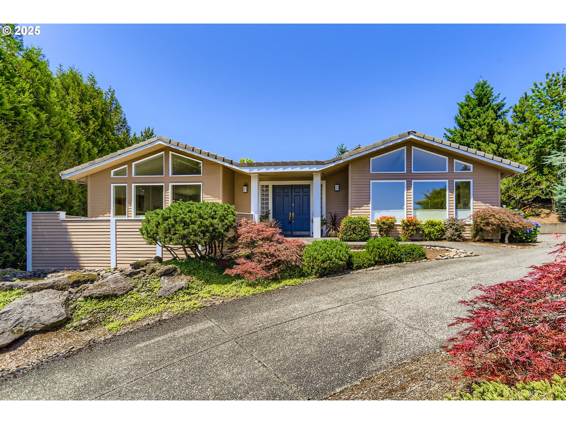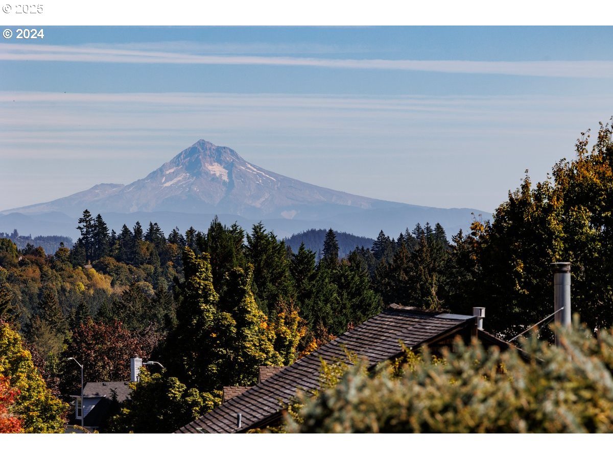 This sophisticated single-story residence with a stunning Mt Hood view offers a harmonious blend of contemporary functionality and timeless elegance. PRIMARY BEDROOM ON THE MAIN FLOOR. The kitchen showcases honey-toned wooden cabinetry, contrasting beautifully with sleek black appliances and granite countertops. The living area boasts a striking fireplace with a classic white mantel and vaulted ceilings. Large windows throughout provide abundant natural light and picturesque views of Mt Hood and the surrounding greenery. The home features multiple well-appointed bathrooms, including one with a spacious corner tub and separate shower enclosure. The primary bedroom is a serene retreat, with sliding glass doors opening to a large deck. A dedicated office or study area is adorned with rich wooden paneling and unique decor, creating a professional yet comfortable workspace. The property also includes a well-equipped laundry room and various living spaces perfect for entertaining or relaxation. Attention to detail is evident and the overall design seamlessly integrates modern conveniences with traditional architectural elements, resulting in a living space that is both functional and aesthetically pleasing.