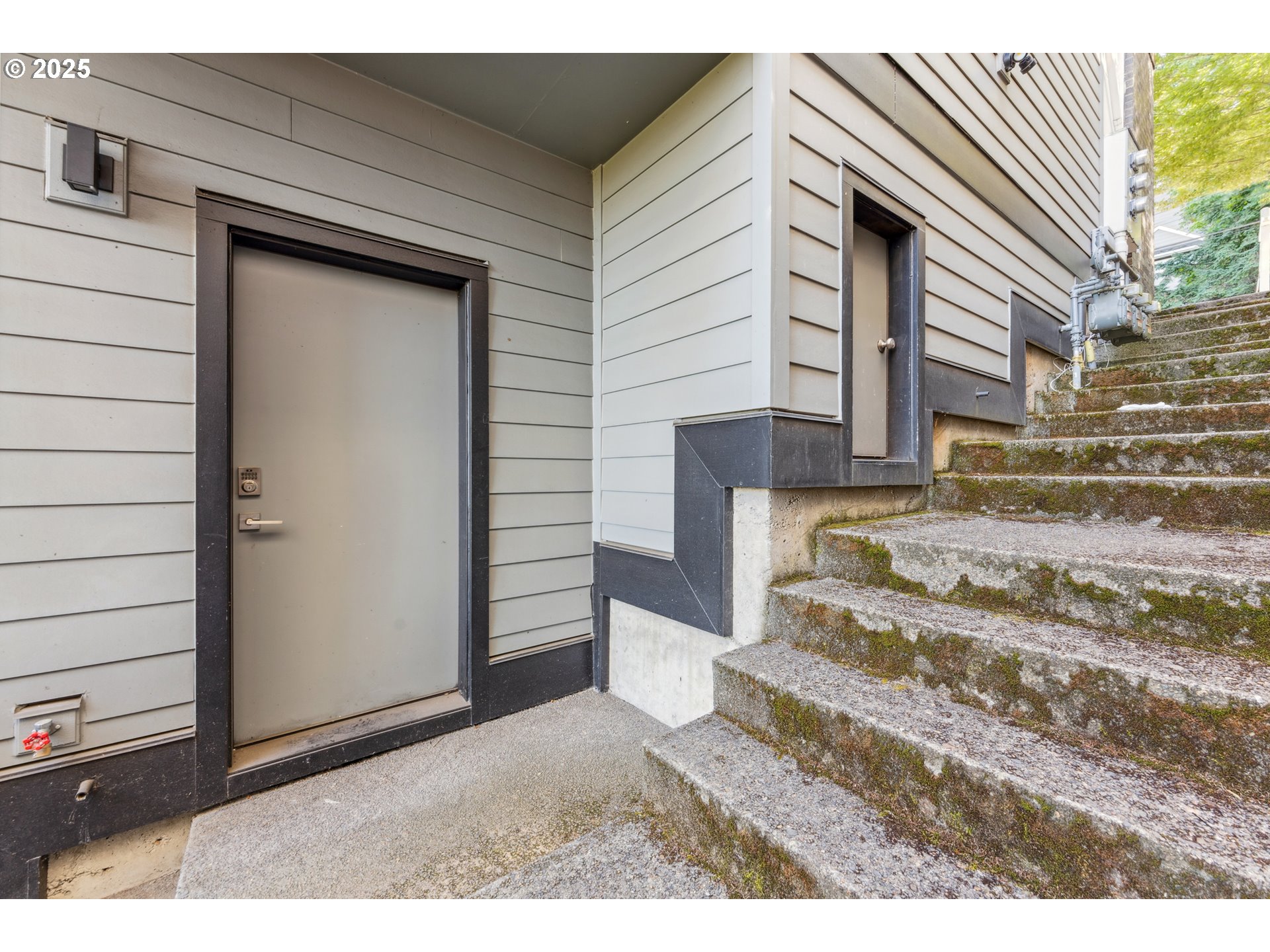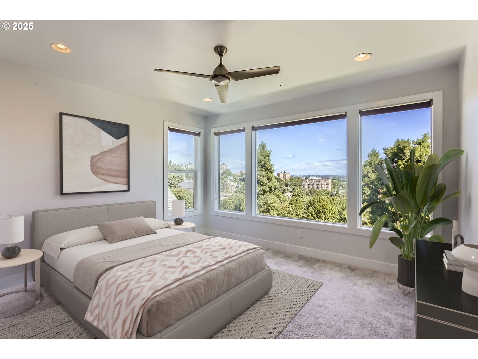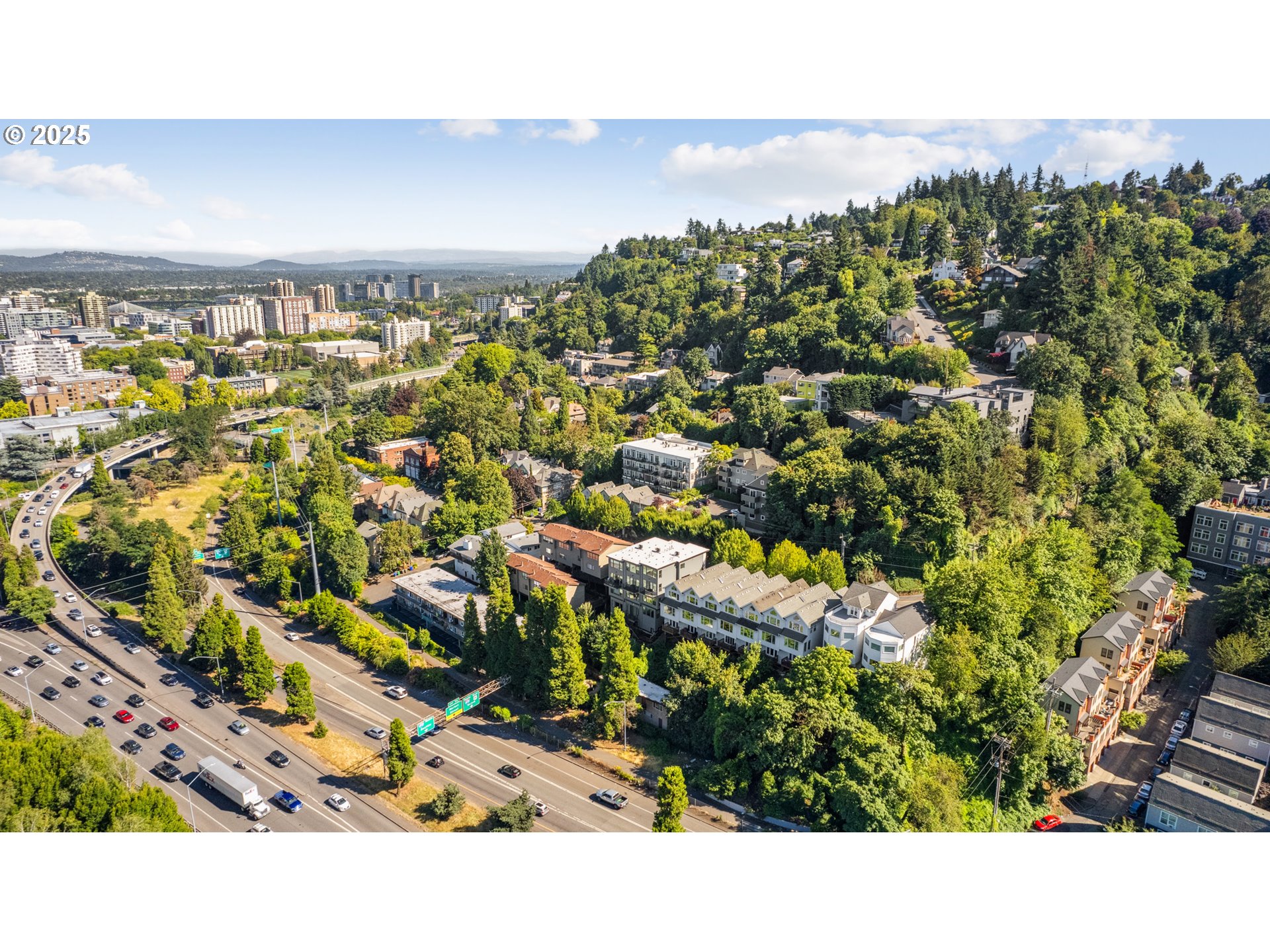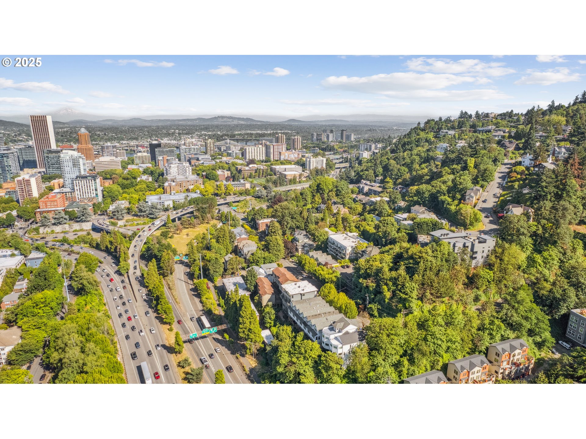 Modern design meets elevated city living in this architecturally distinct end-unit townhome, thoughtfully crafted to take full advantage of panoramic views of the Portland skyline and nearby mountains. Abundant natural light pours through oversized windows, highlighting the home’s refined finishes and attention to detail.The open-concept main level features warm hardwood flooring and a designer kitchen outfitted with premium stainless steel appliances, custom cabinetry, and extensive built-in storage—perfect for both hosting and daily life. Statement staircases connect each level, leading to two generous primary suites upstairs, each complete with its own spa-like bathroom and curated, high-end finishes.Outdoor living spaces include a serene rear deck for quiet evenings and a front balcony ideal for enjoying sunrises or city lights. The lower level adds even more flexibility with a private guest suite offering a third bedroom, full bathroom, kitchenette, and its own entrance—making it ideal for multigenerational living, guests, or use as a potential ADU or short-term rental.Other highlights include an attached garage, and plentiful storage throughout. Located just minutes from downtown, OHSU, major freeways, and Portland’s vibrant cultural districts, this home places you in the heart of it all—where lifestyle, convenience, and design come together.