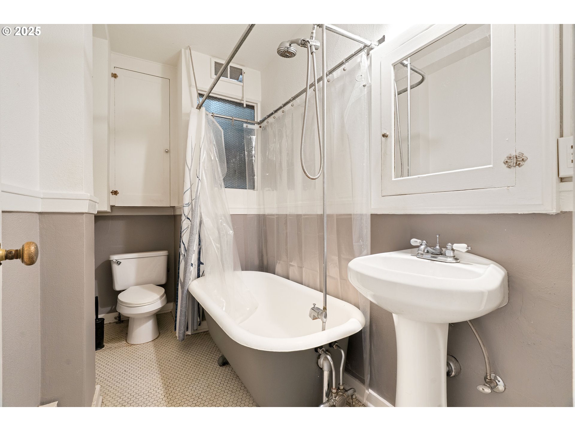 Penthouse studio right in the Alphabet District. Don't miss this opportunity to live in the top floor of the Tudor Arms, a coveted historic building. The unit is filled with charm, natural light and class. Oak hardwood floors, picture frame moldings, the original phone/intercom and fully functional double hung windows remind you of times gone by. The kitchen has been fully renovated to feel like the penthouse that it is. Exposed brick, herringbone floors, recessed lighting and a designer fridge are magazine worthy. Spacious for a unit this size the bathroom offers hexagonal tile floors, a pedestal sink and a clawfoot tub/shower. The walk-in closet is so large that it could double as an office nook. The community within the building cares and it shows with how clean and maintained the common area spaces are. Conveniently located just blocks from Nw 21st, Nw 23rd, Providence Park and the MAX station. Living here there is no need for a car, everything is at your fingertips. The building offers secured access, private storage, an elevator, bike storage, and laundry. The unit is currently leased through the end of Feb 2026. Call for details.